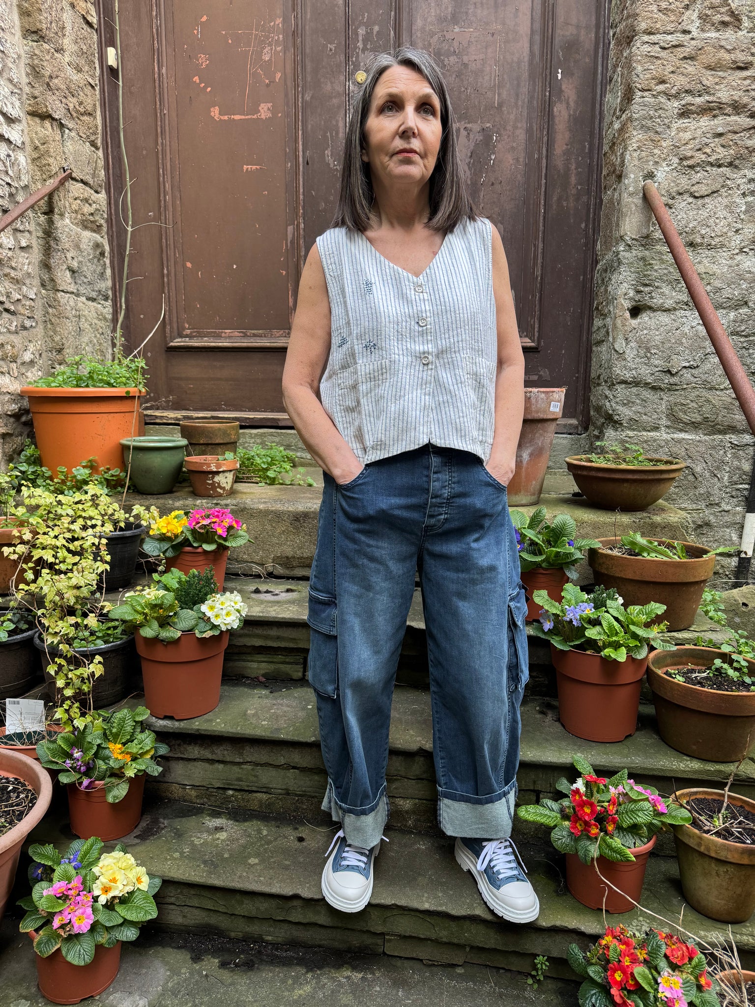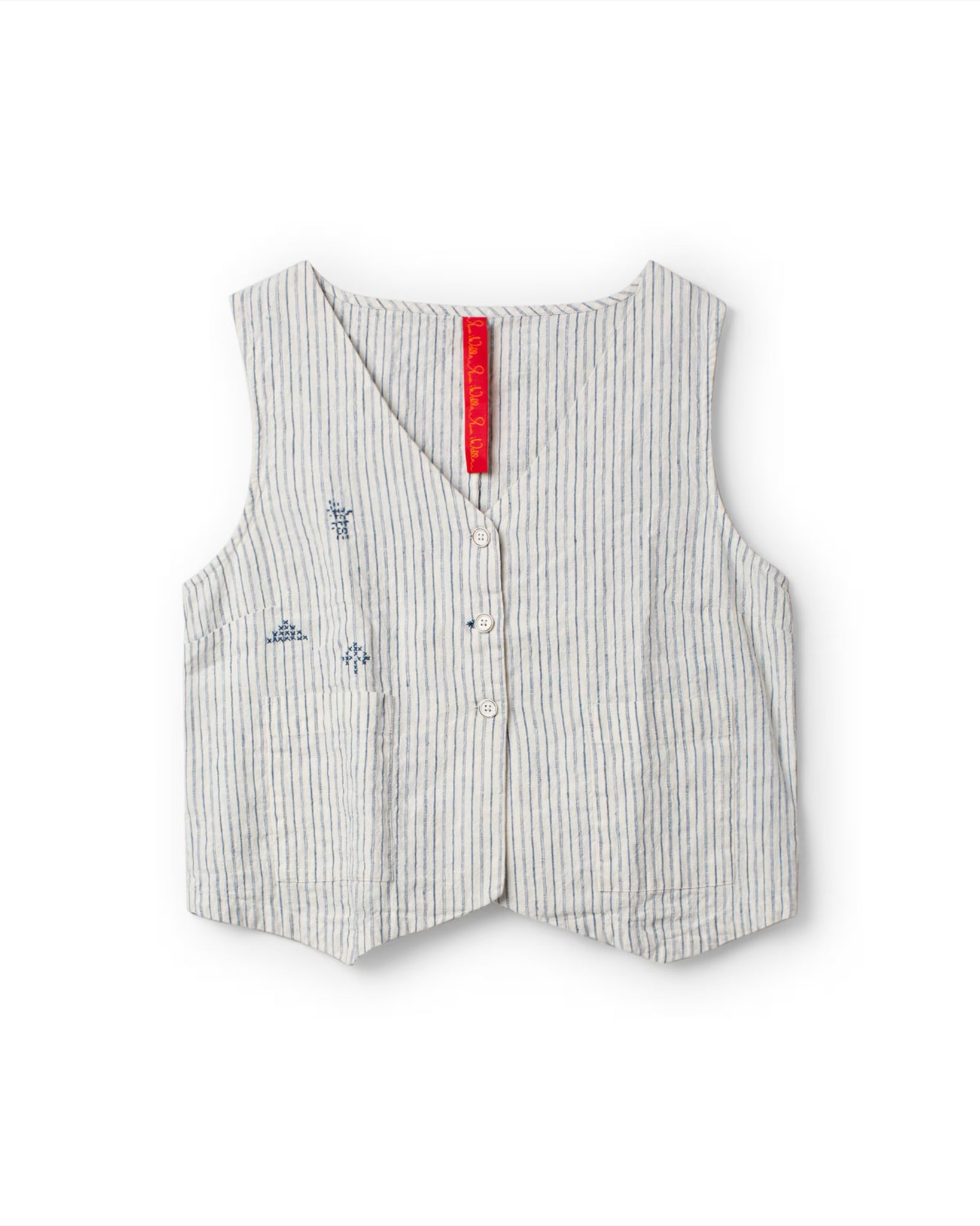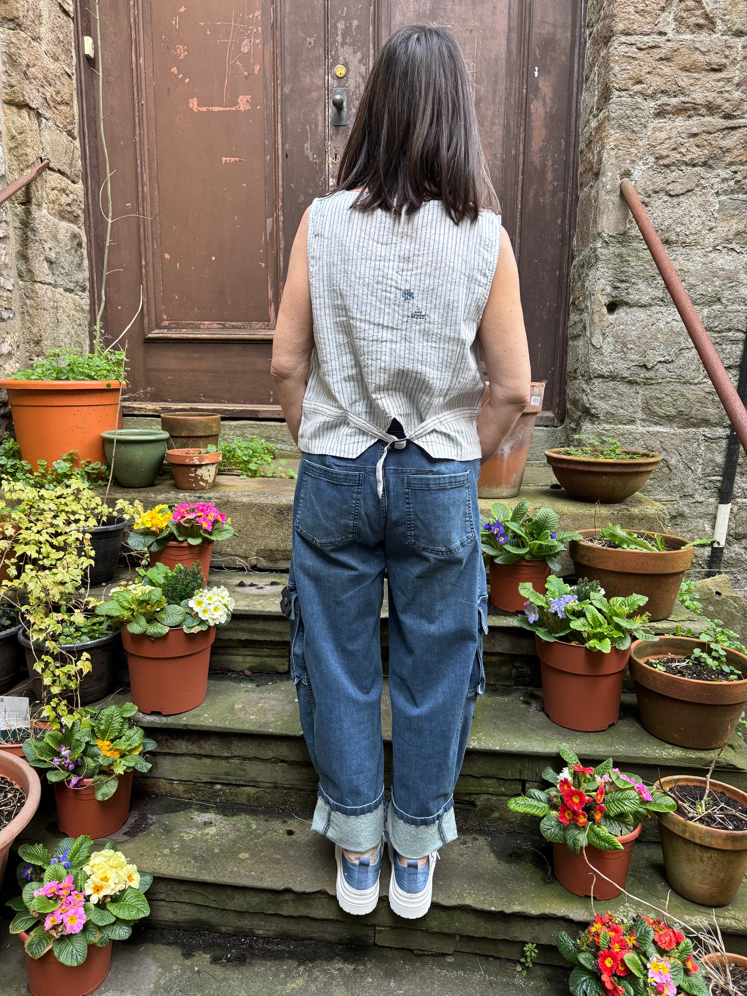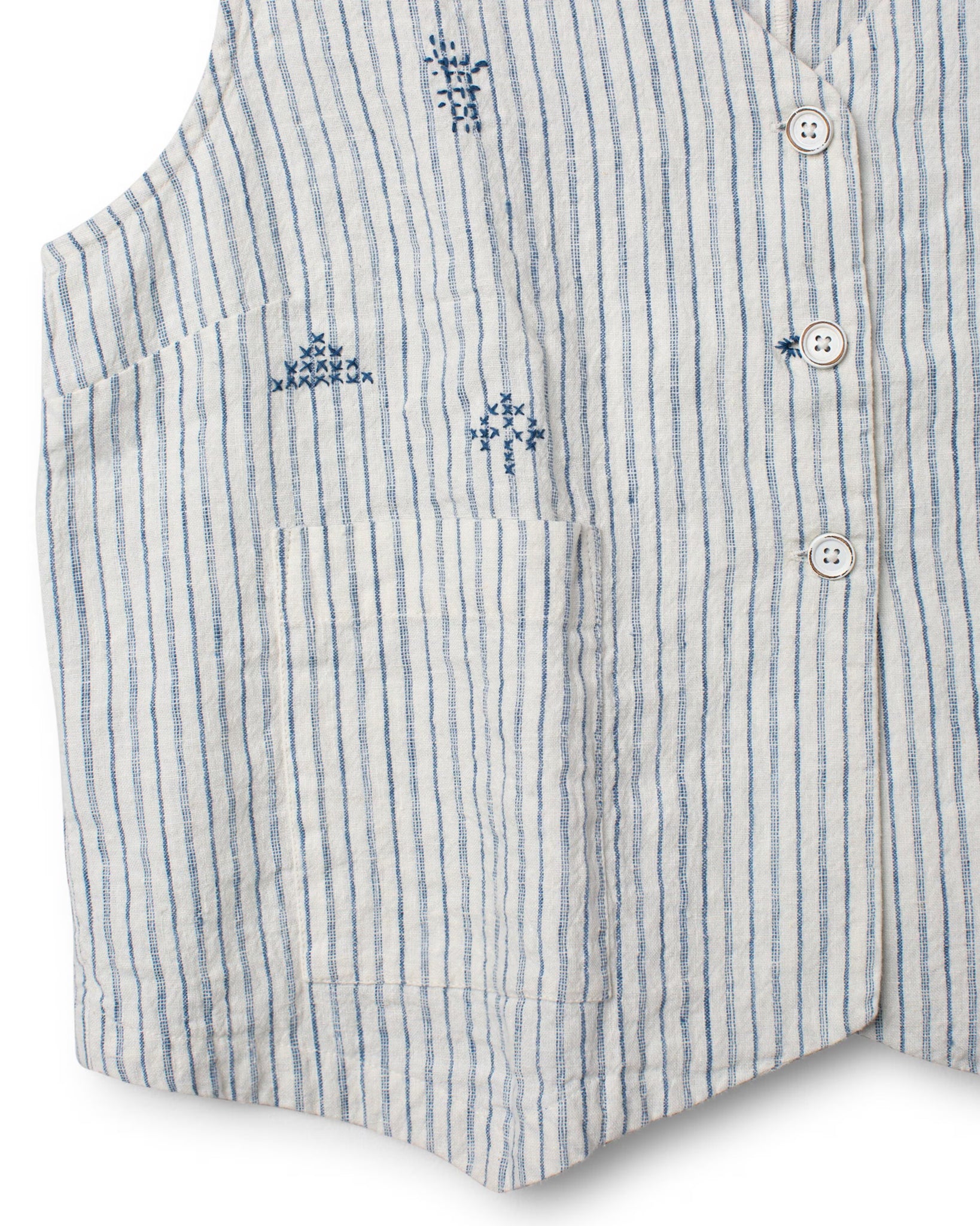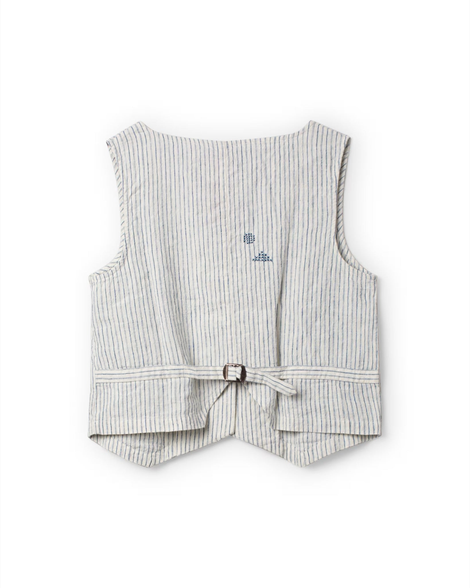 Vest in linen with beautiful cross-stitch embroideries, external pockets and buttoned front, adjustable strap with vest buckle at the back.