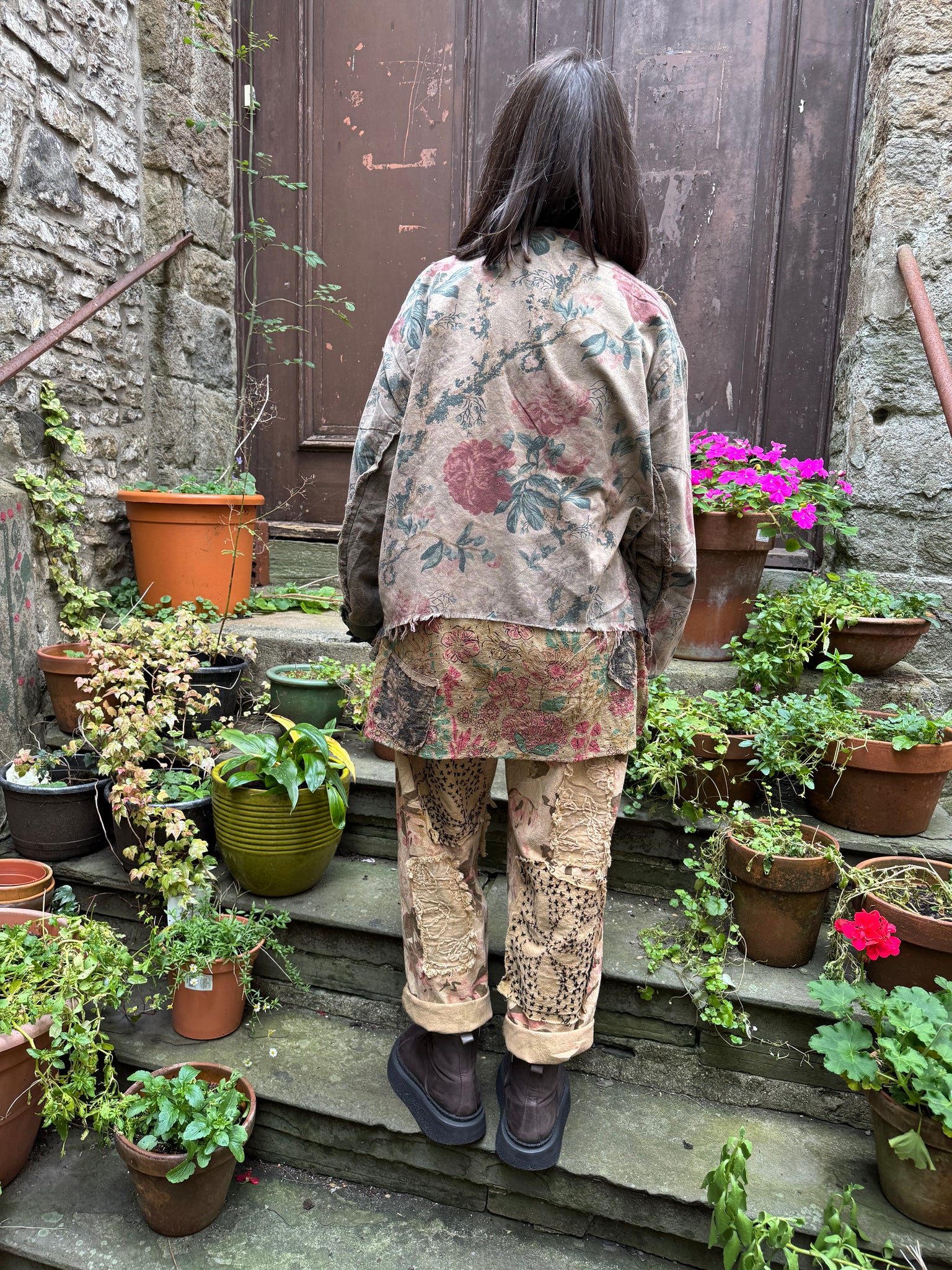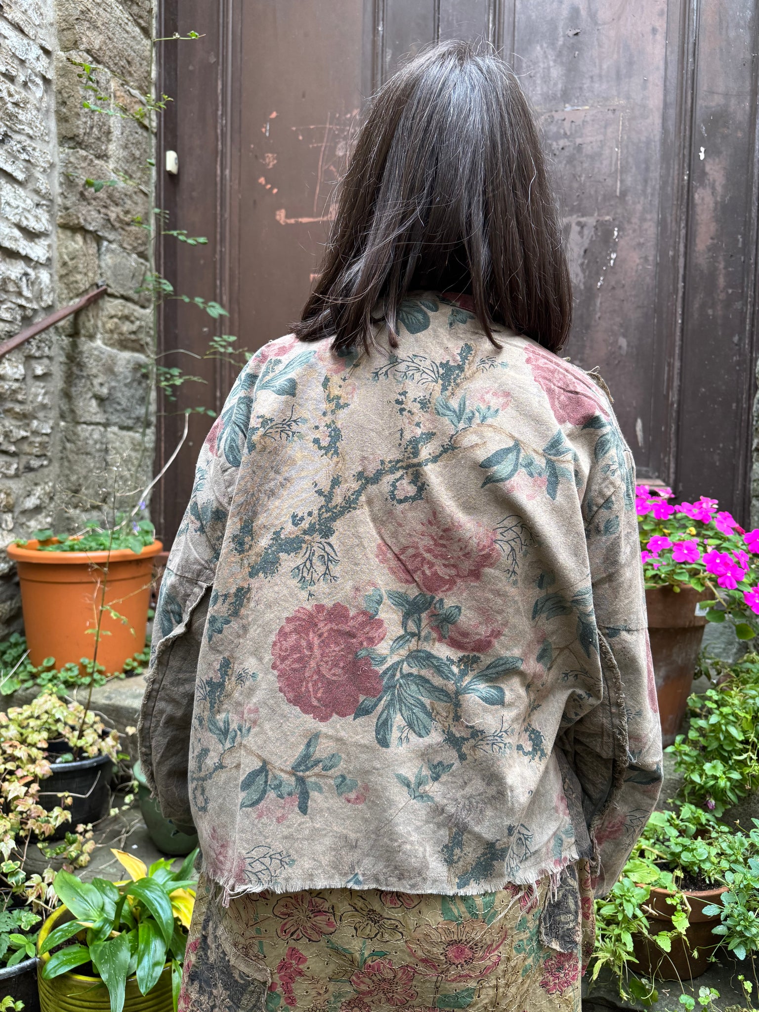 Double Breasted Cotton Jacket with Two Front Floral Patchwork Pockets. Floral Sleeves and Back with Raw Edges