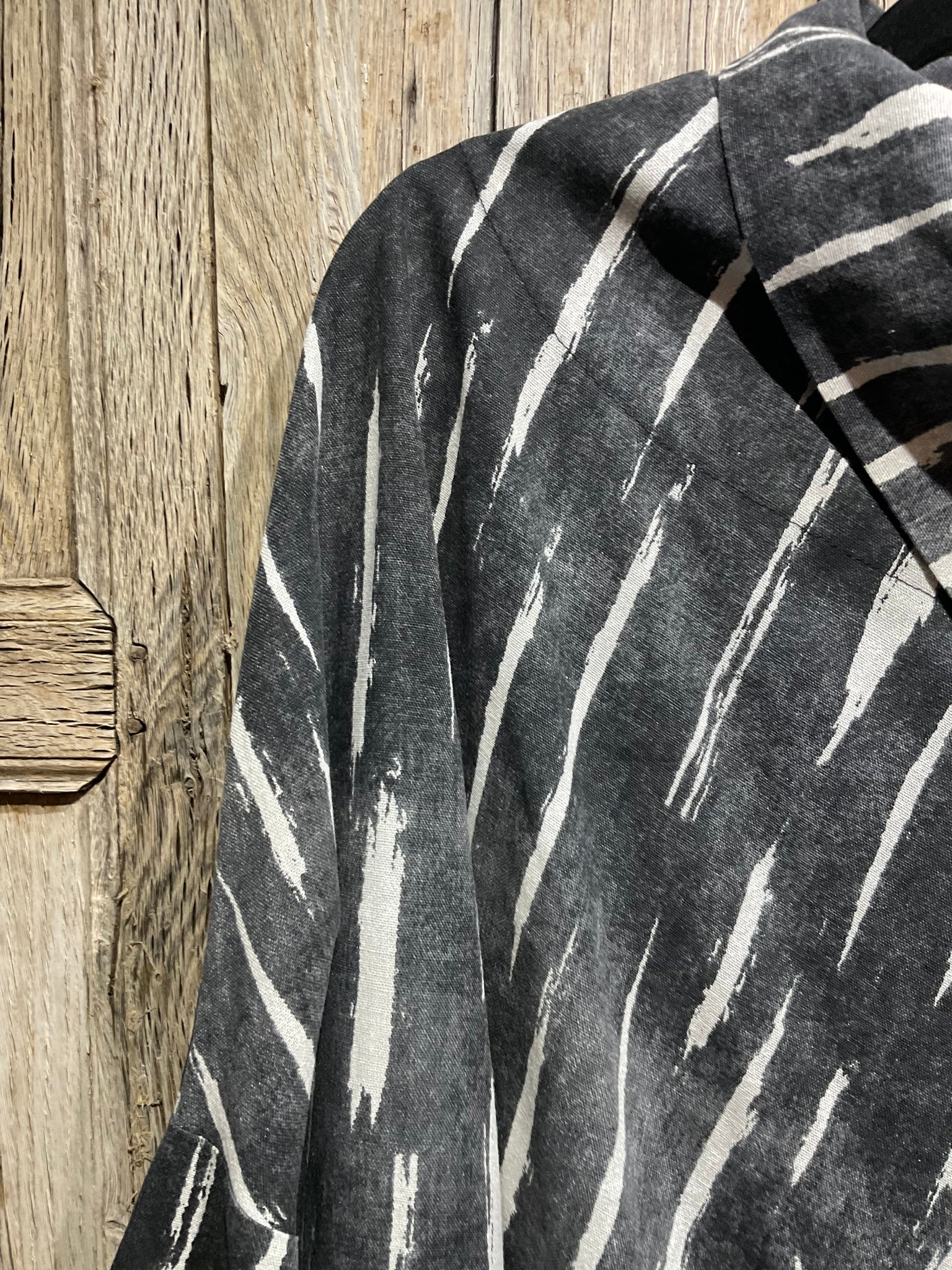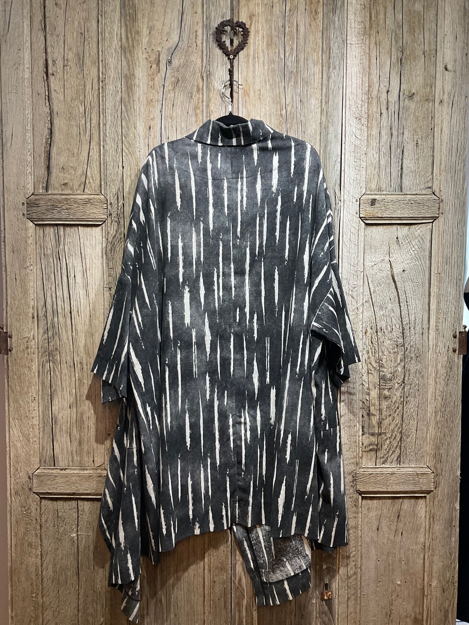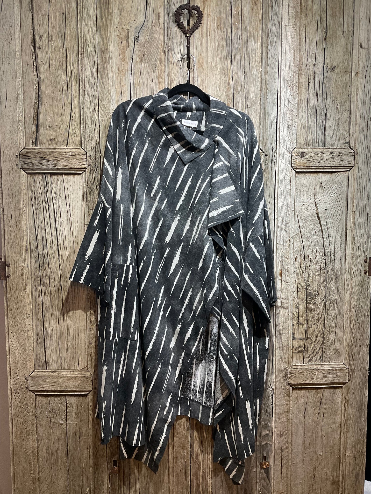 Beautiful linen blend grey and white stripe coat with a single silver button fastening and two pockets on the front