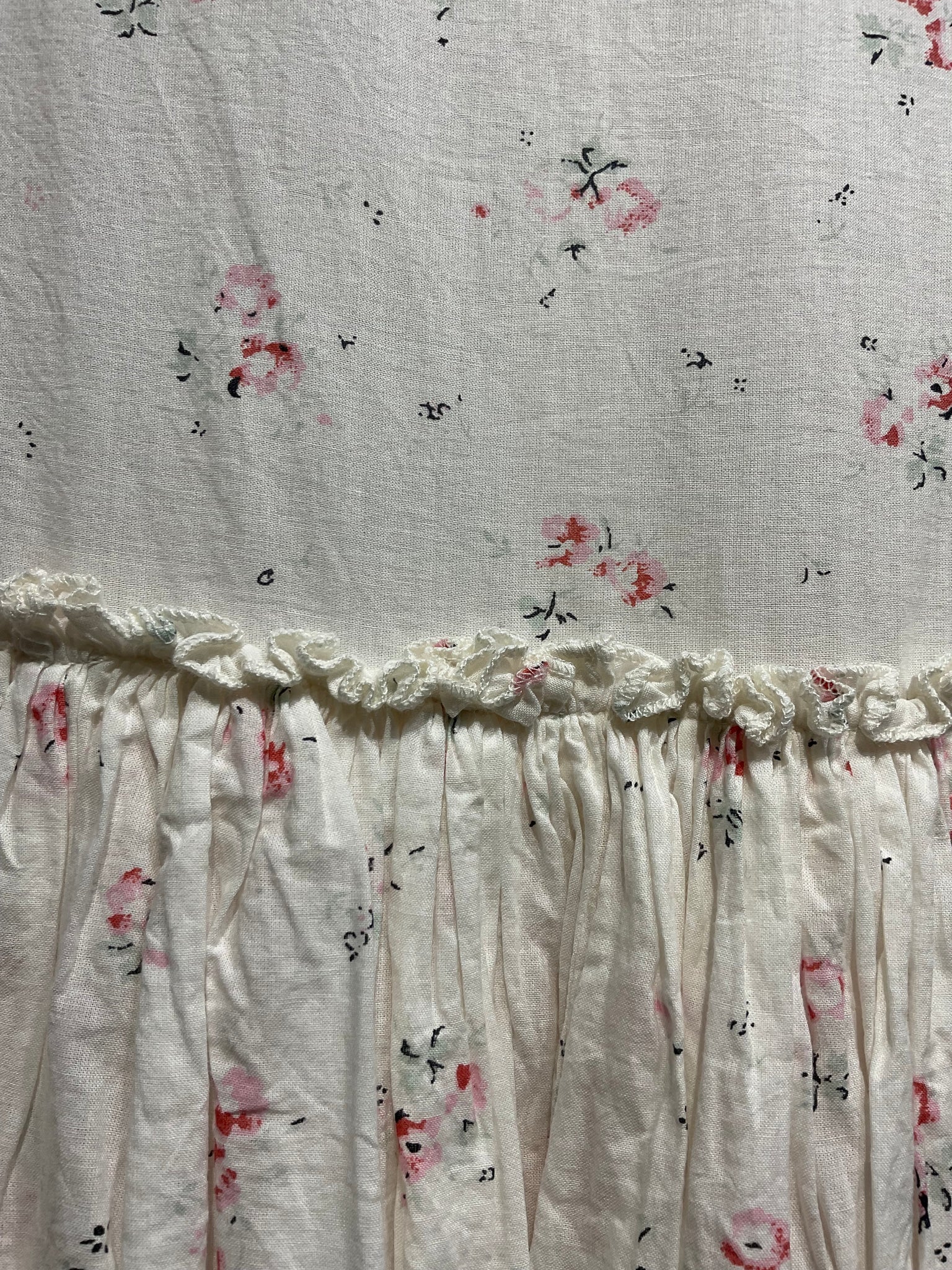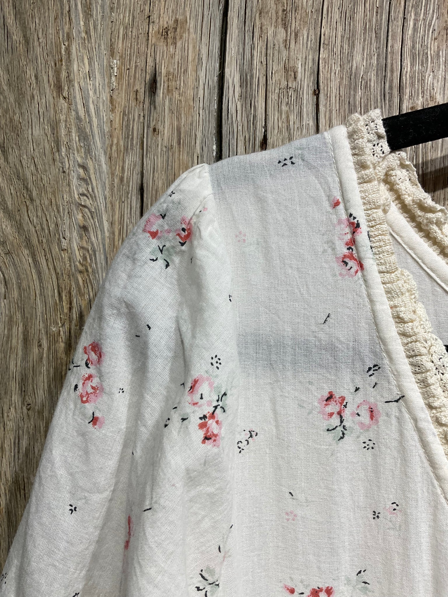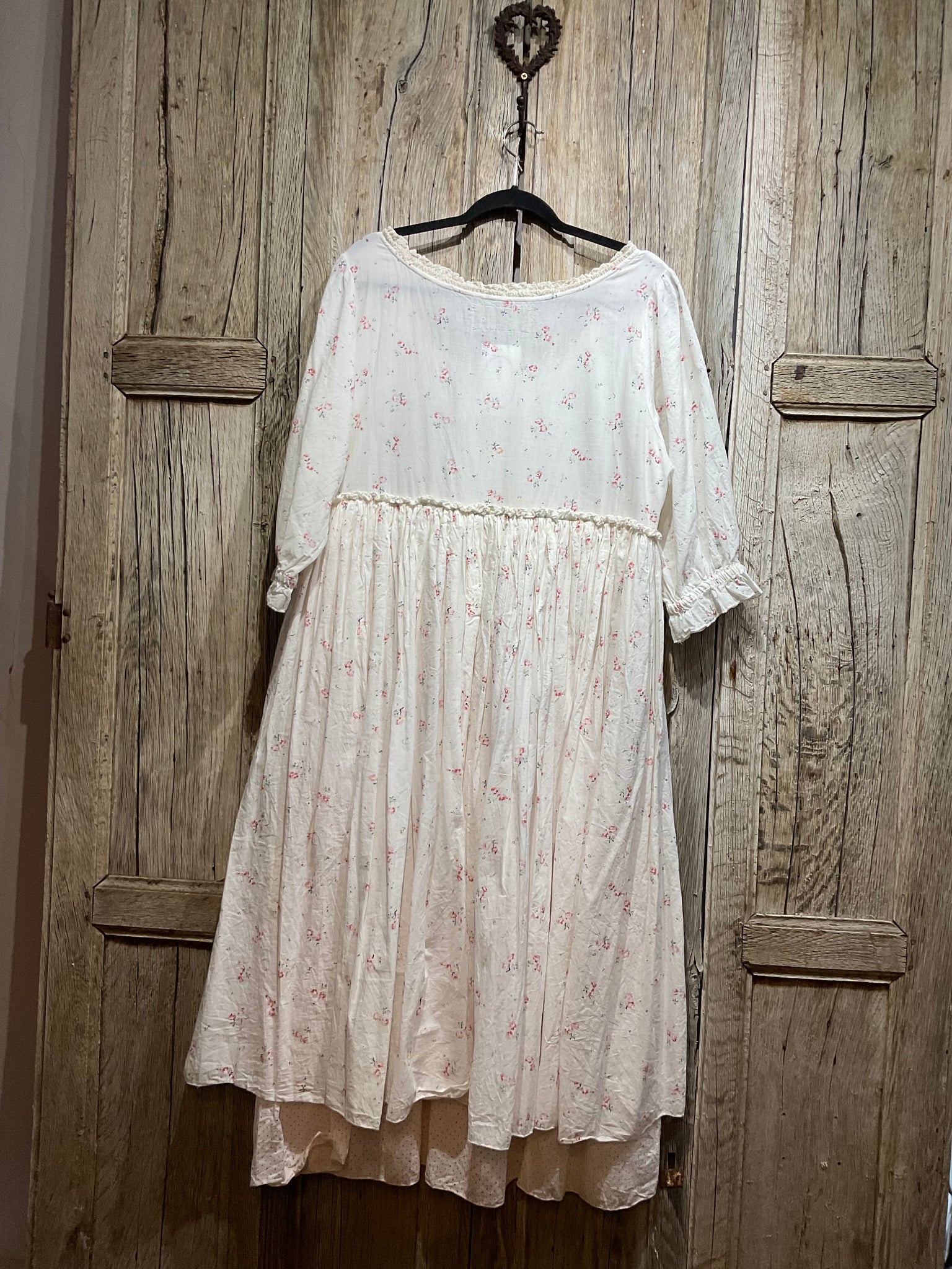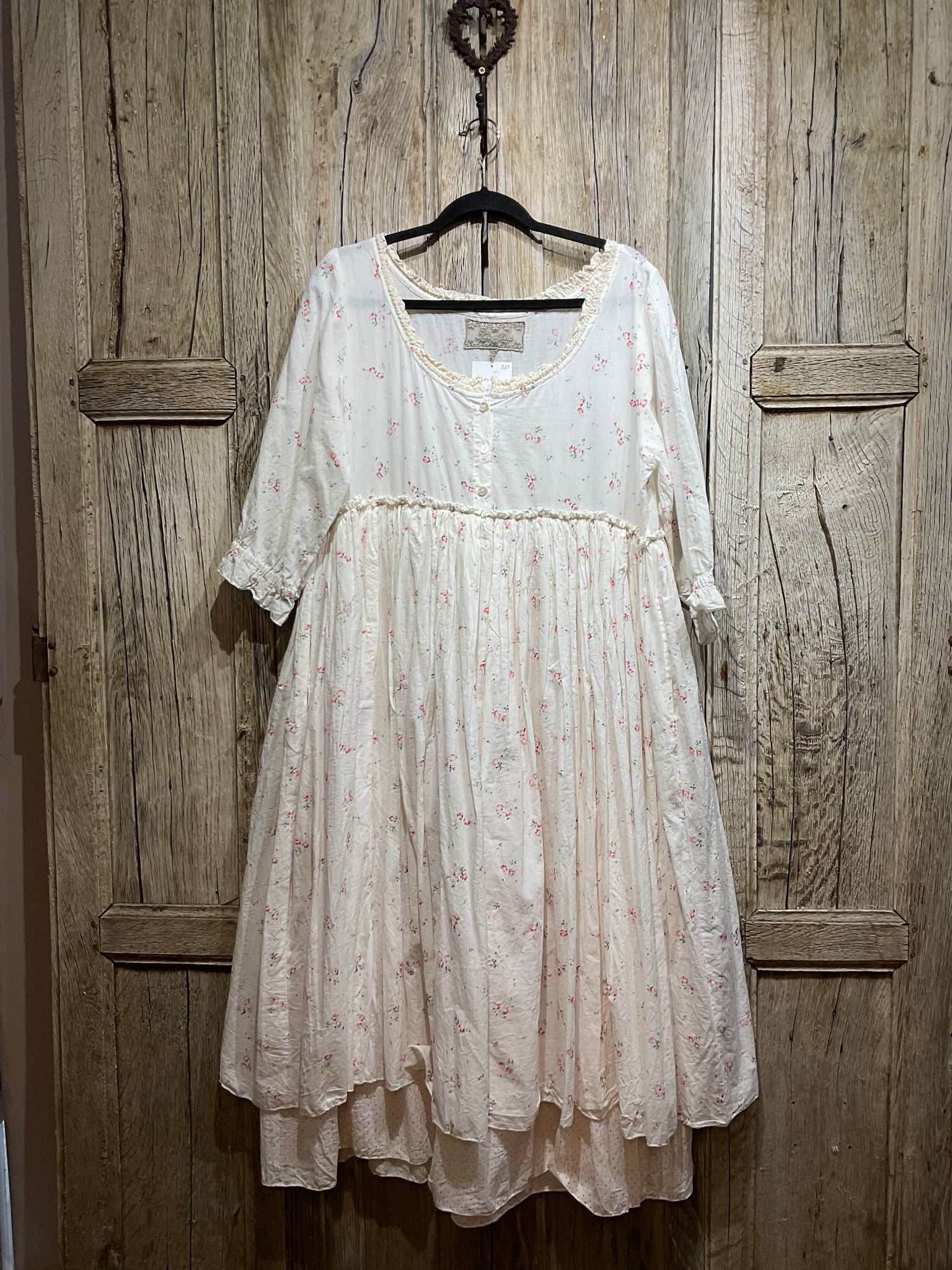 Beautiful floral dress with delicate lace around the neckline, three buttons down the front and a pink spot underskirt.