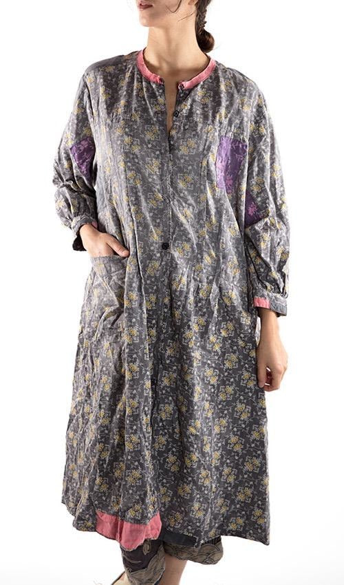 Cotton Modal Miela Smock Dress with Sunfading, Mixed Buttons and Snaps, Linen and Callico Patches, Magnolia Pearl