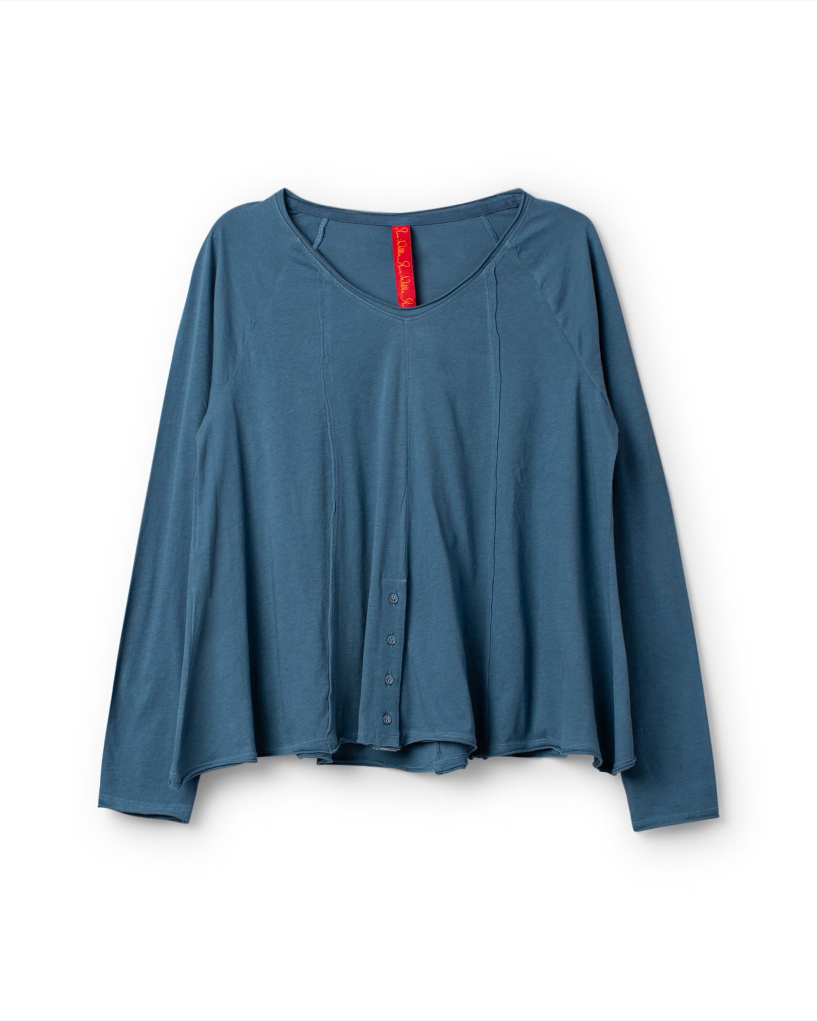 V-neck, long-sleeved tee in cotton jersey with raw edges and buttoning detail at the bottom front.