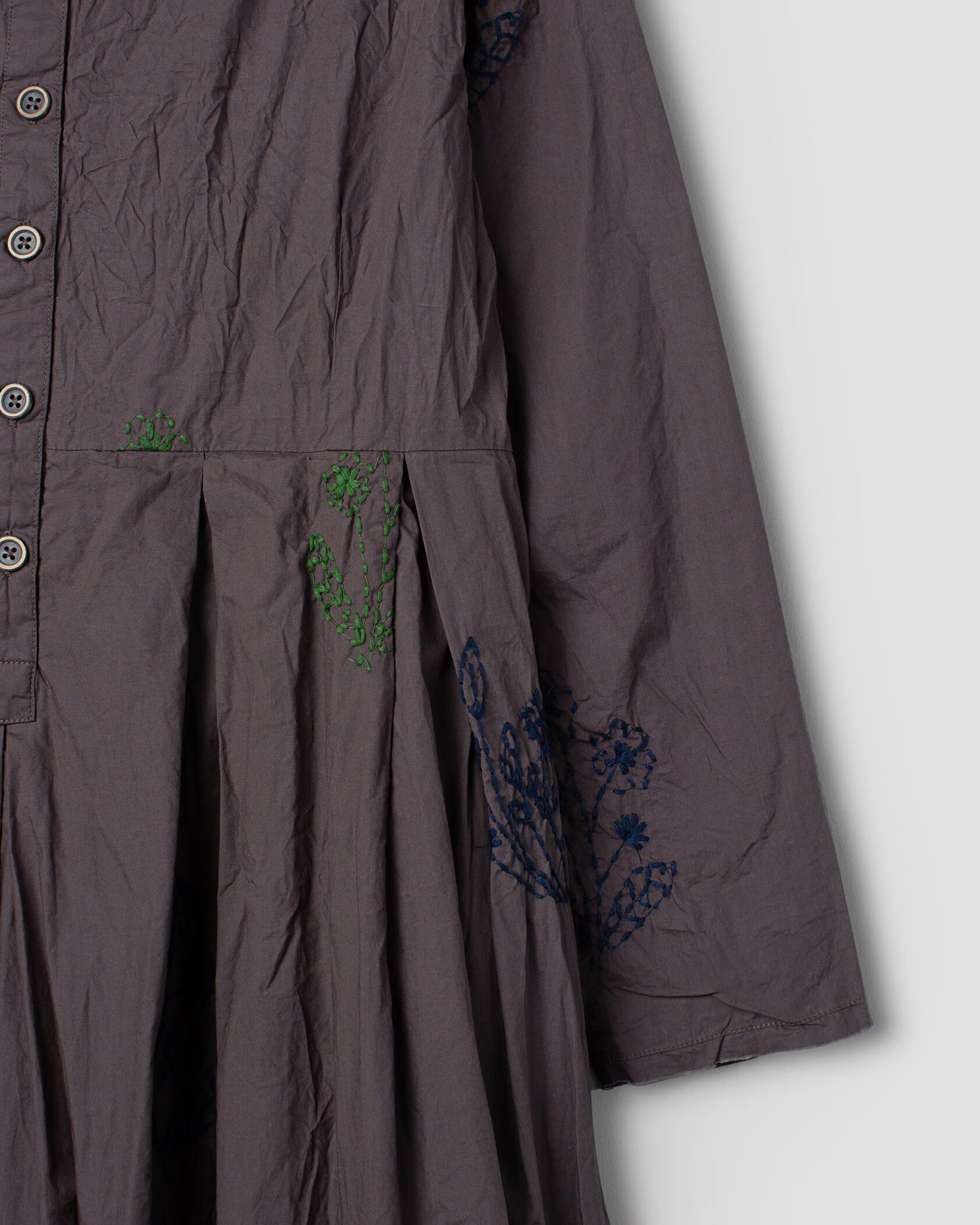Calf-length, long-sleeved dress in embroidered cotton with sheer organdie at the neckline and buttoning at the back. Pleated skirt for lovely volume and side seam pockets.