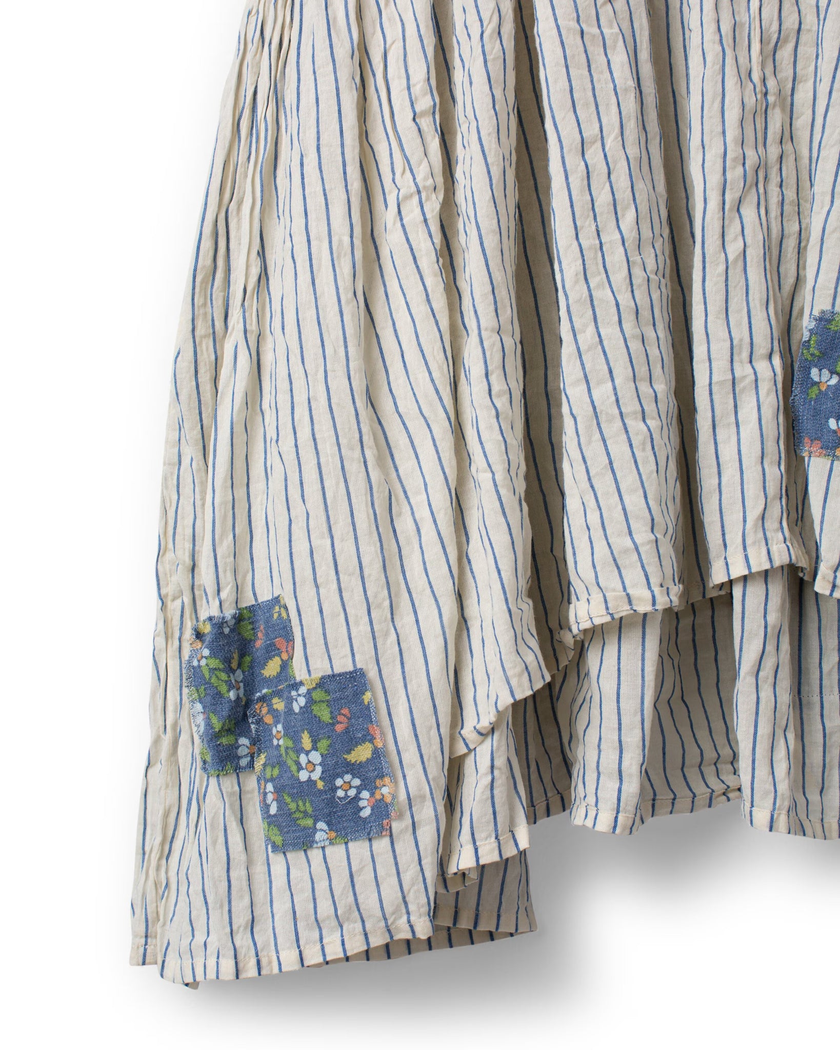 Tunic in striped cotton voile with partially wrinkled skirt for a lovely volume, side seam pockets and decorative patches in flower twill at the bottom.