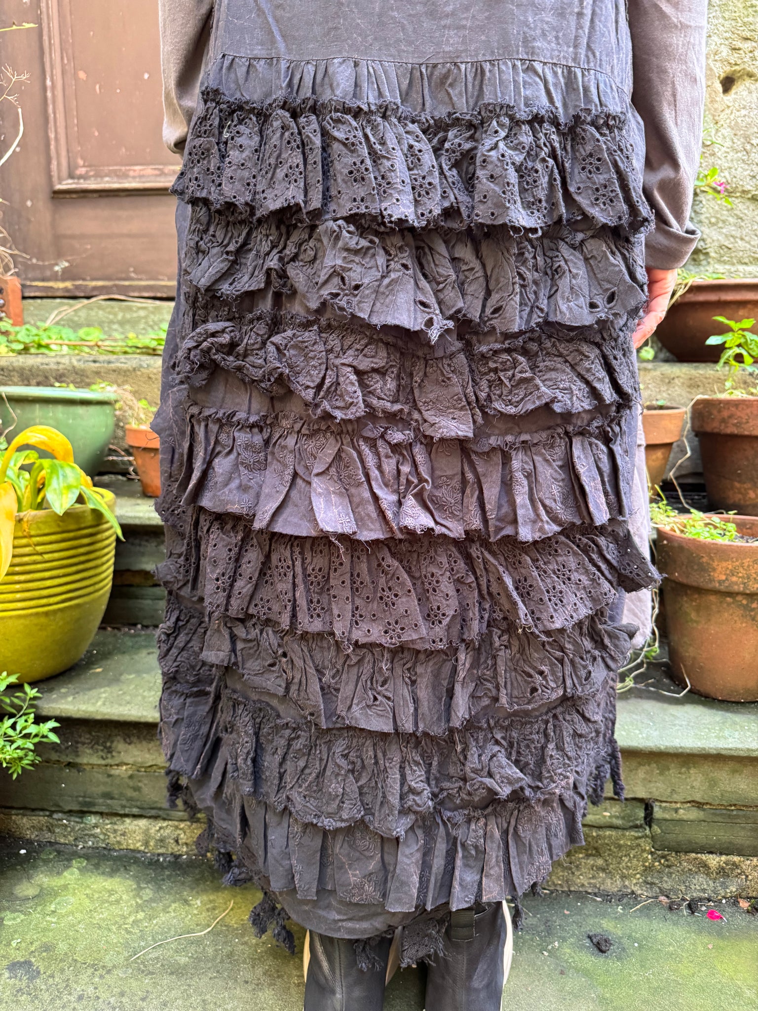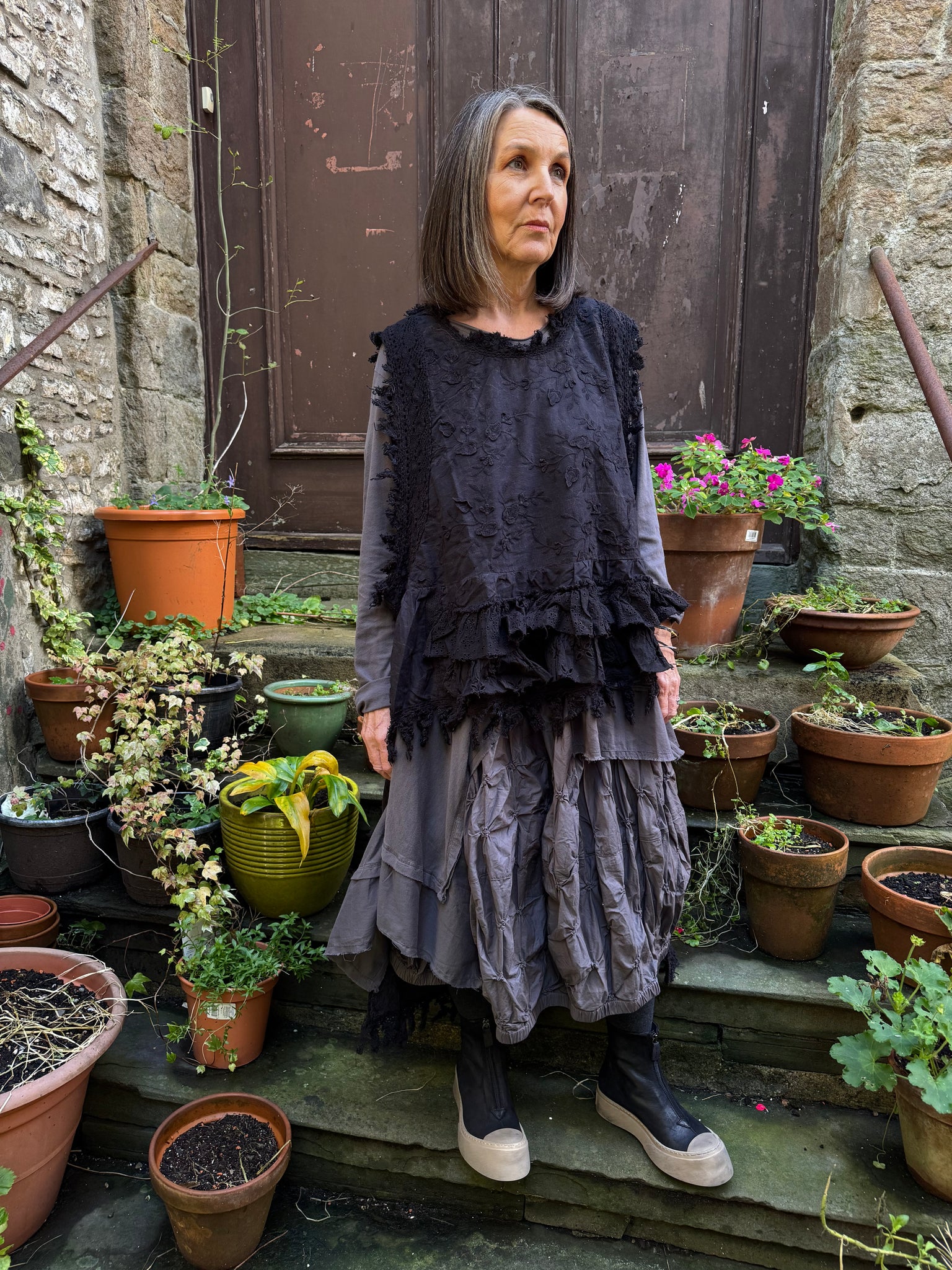 This Beautiful Grey Cotton Layering Tunic Dress with Embroidery, Appliqué, Lace & Frill Detail on Front and Back Looks Great Layered Over a Skirt or Denims. Definitely One to be Dressed Up or Down.