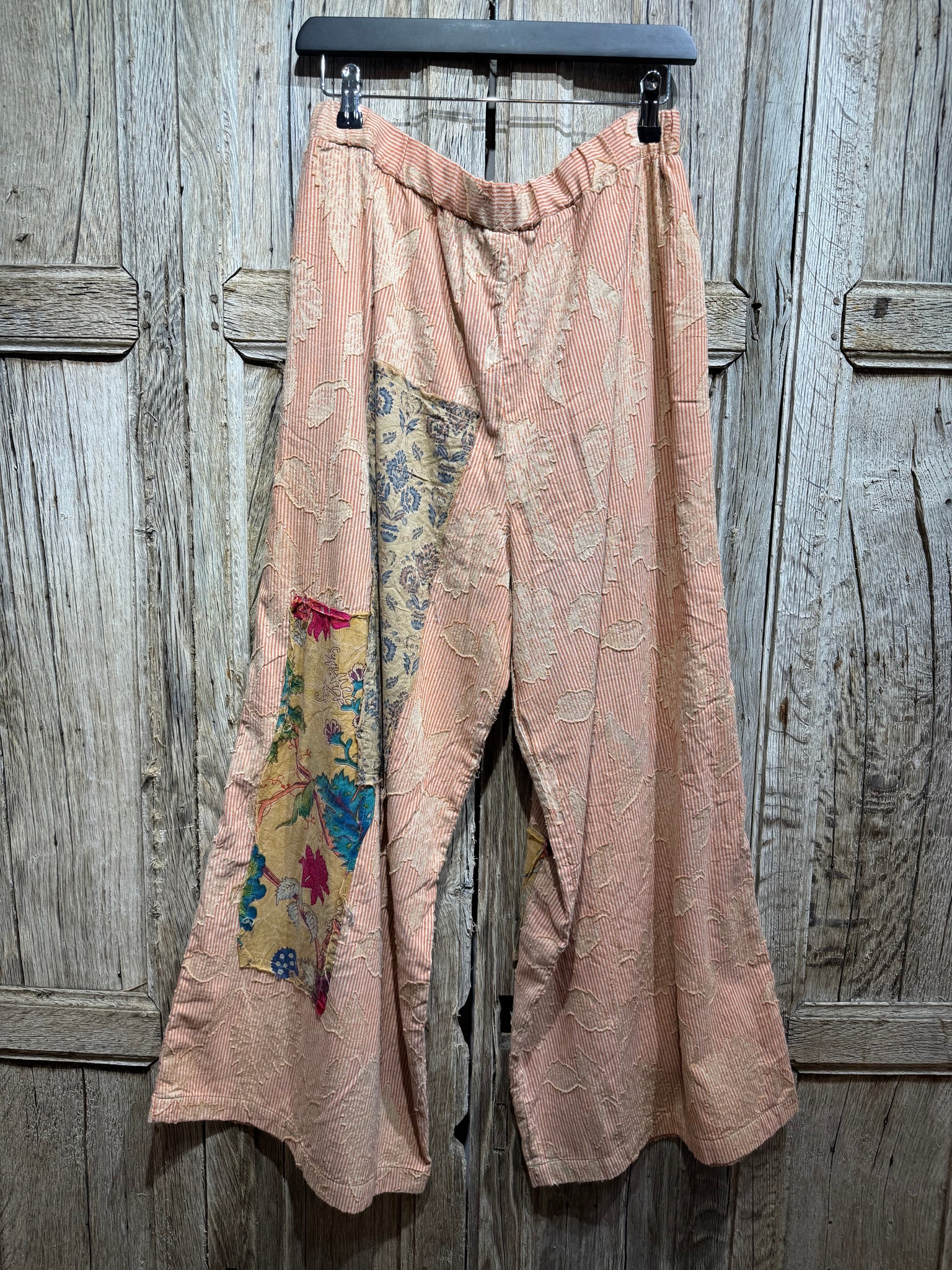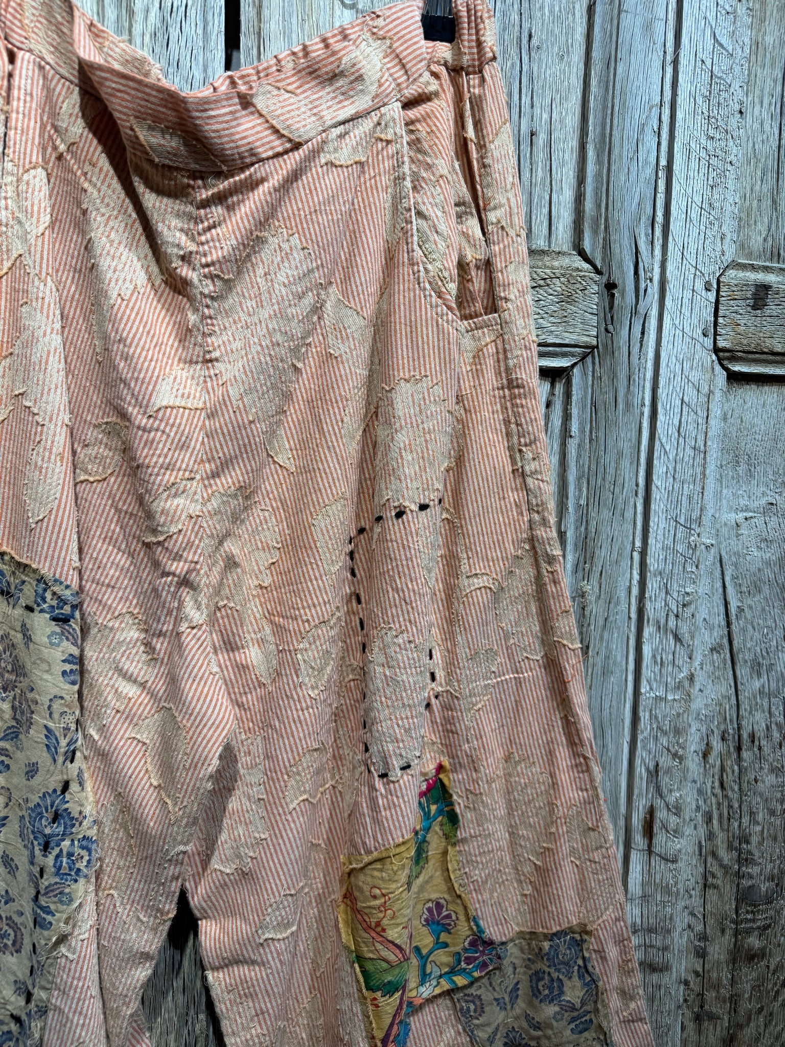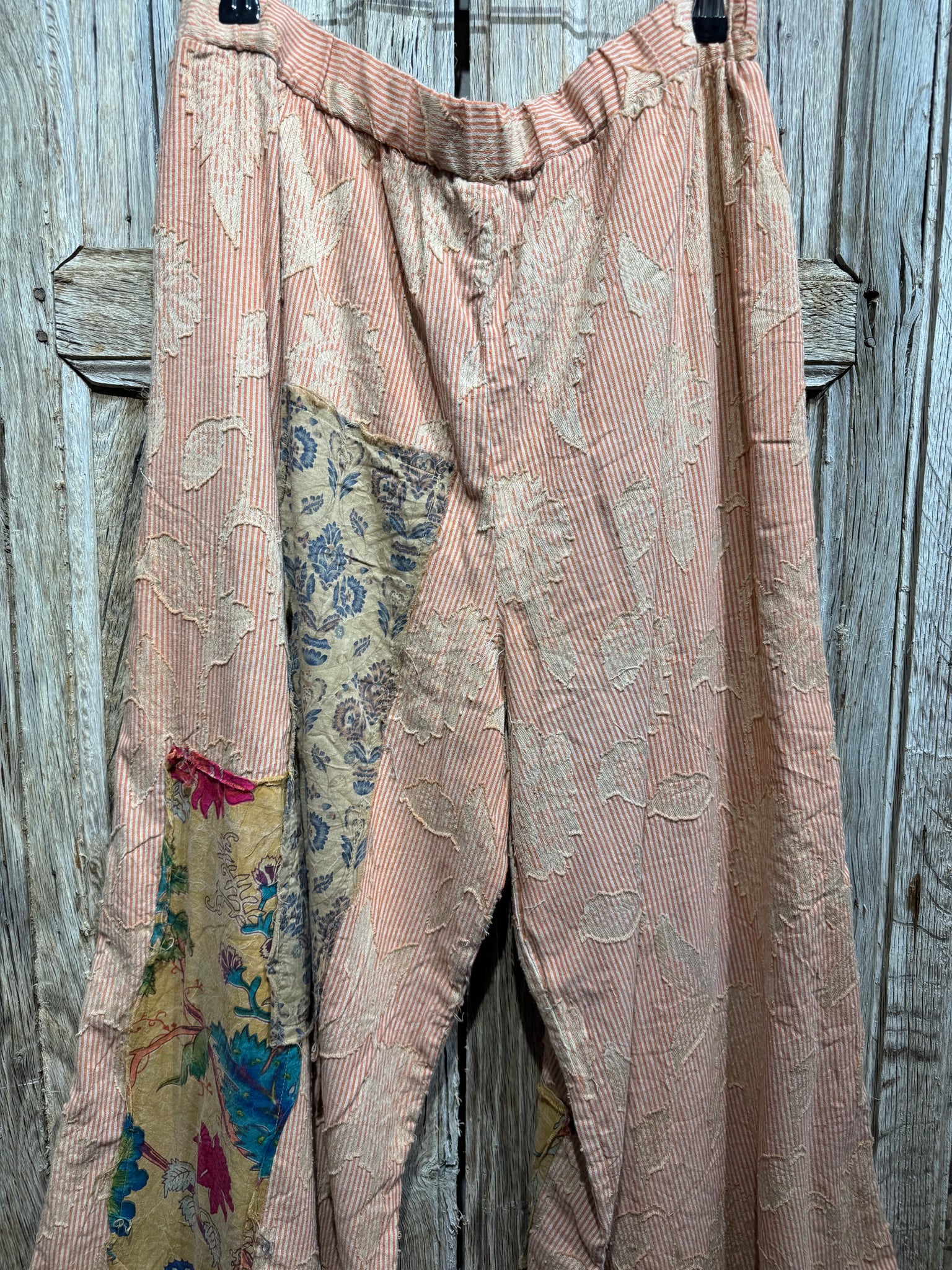 Stripe Soft Cotton Trousers with Appliqué and Patchwork Detail. Two Pockets. Three Button Fastening at the Front with Elasticated Waist at the Rear