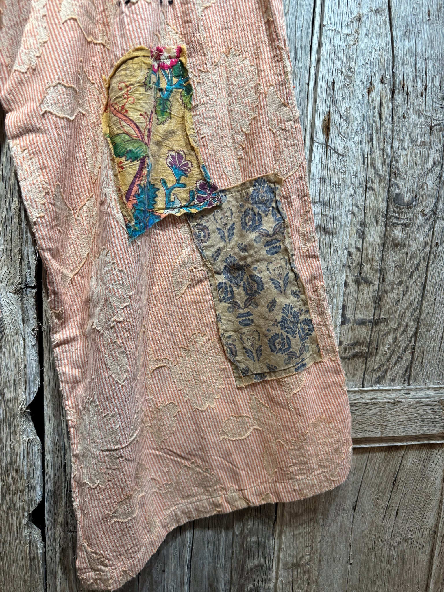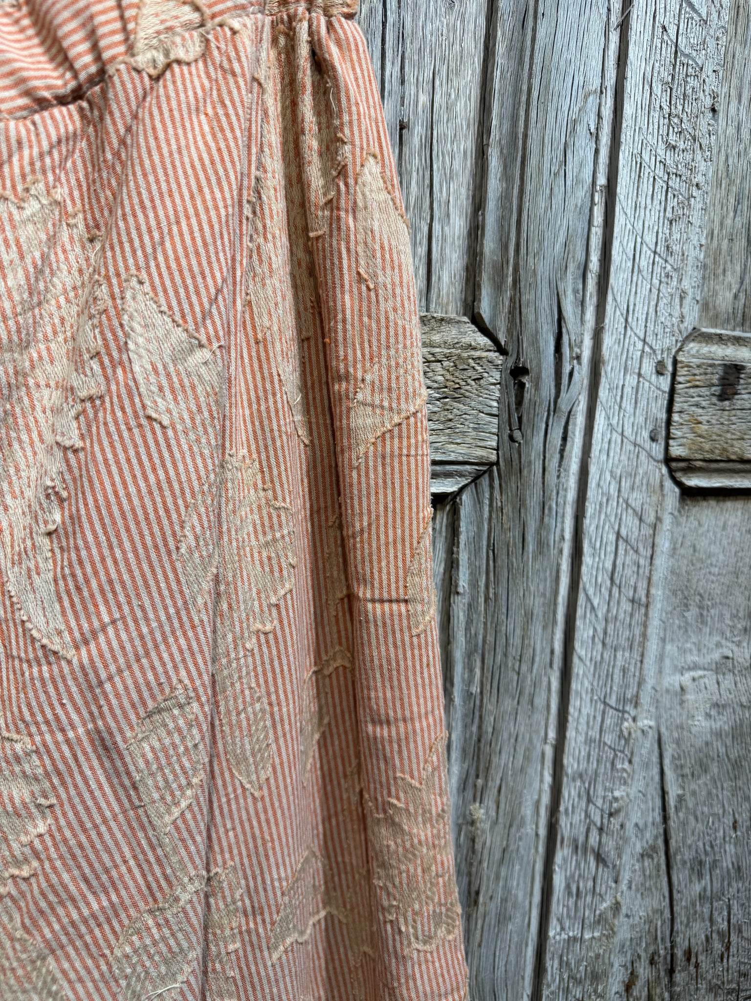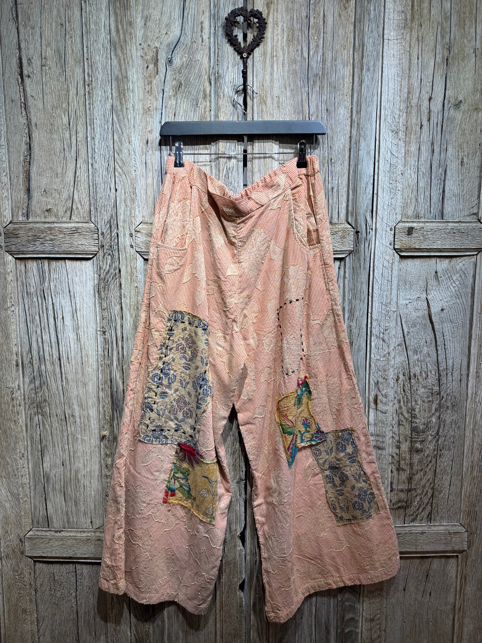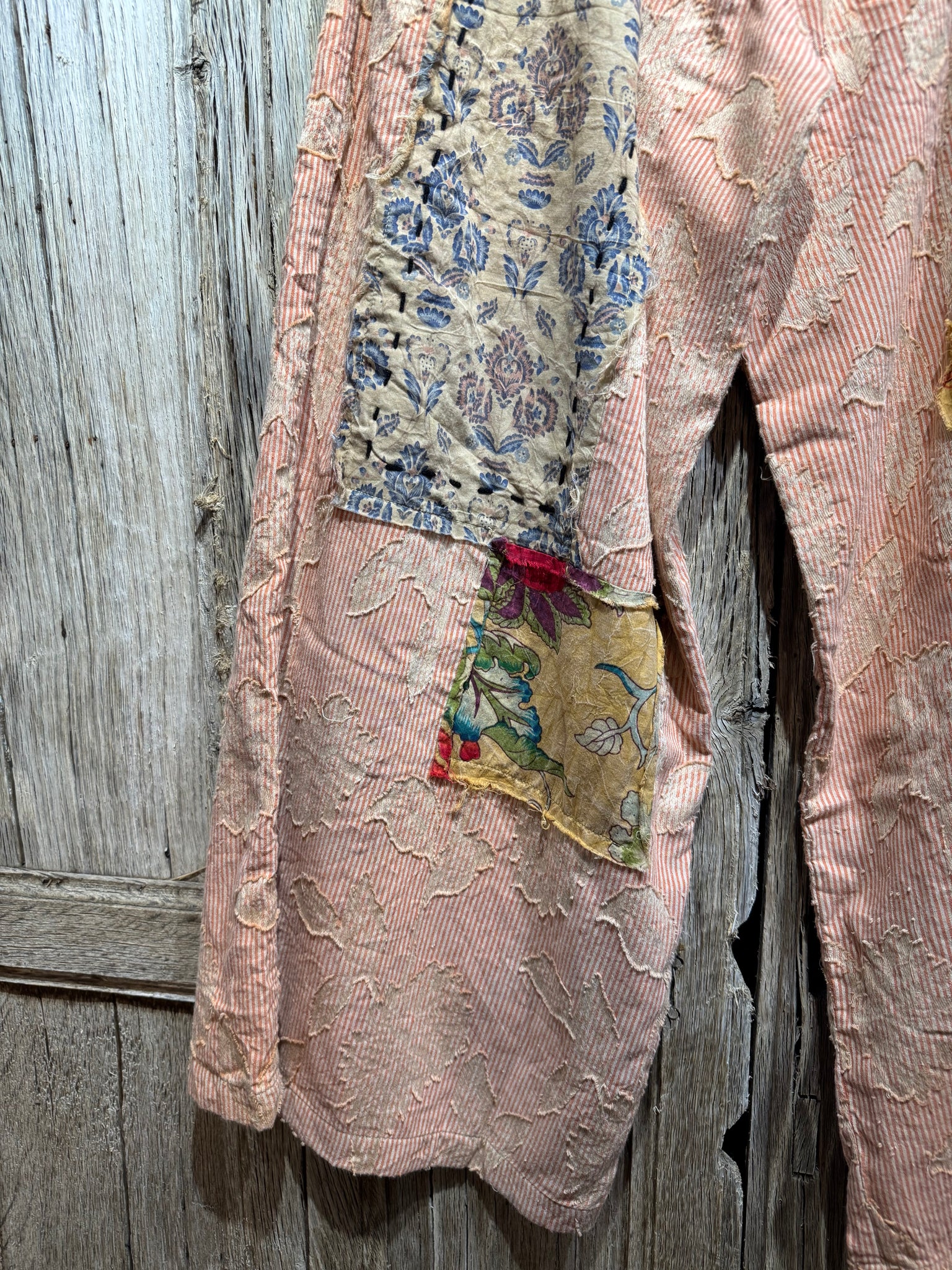 Stripe Soft Cotton Trousers with Appliqué and Patchwork Detail. Two Pockets. Three Button Fastening at the Front with Elasticated Waist at the Rear