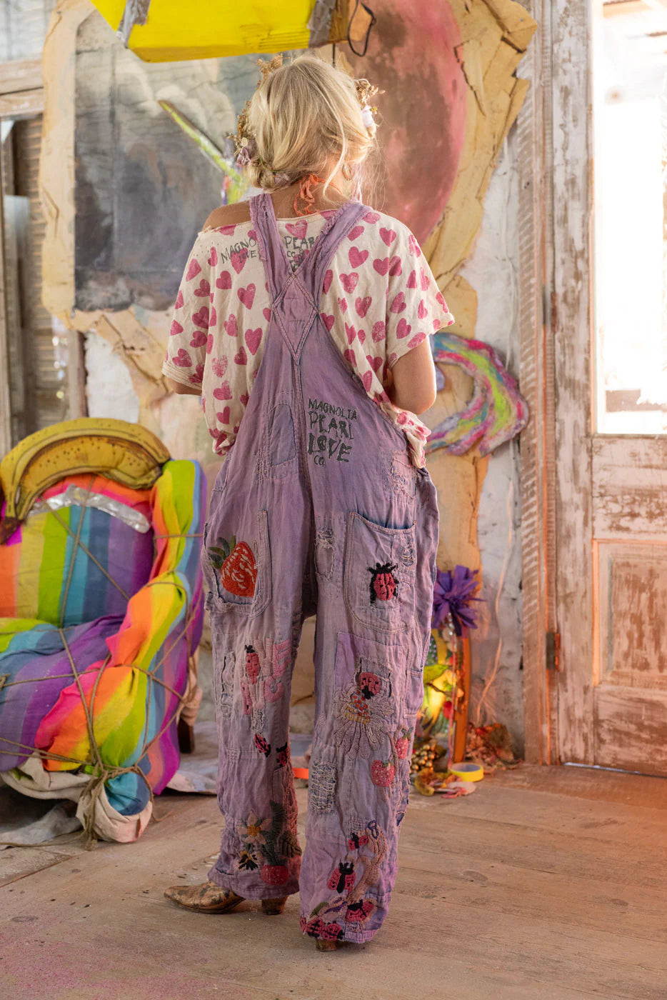 Embroidered overalls made of cotton linen denim fabric with heavy repairs, patches, mixed buttons, hand fading, rips and repairs