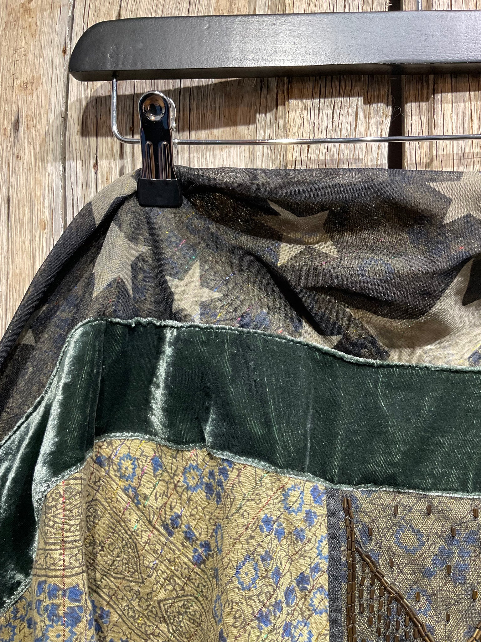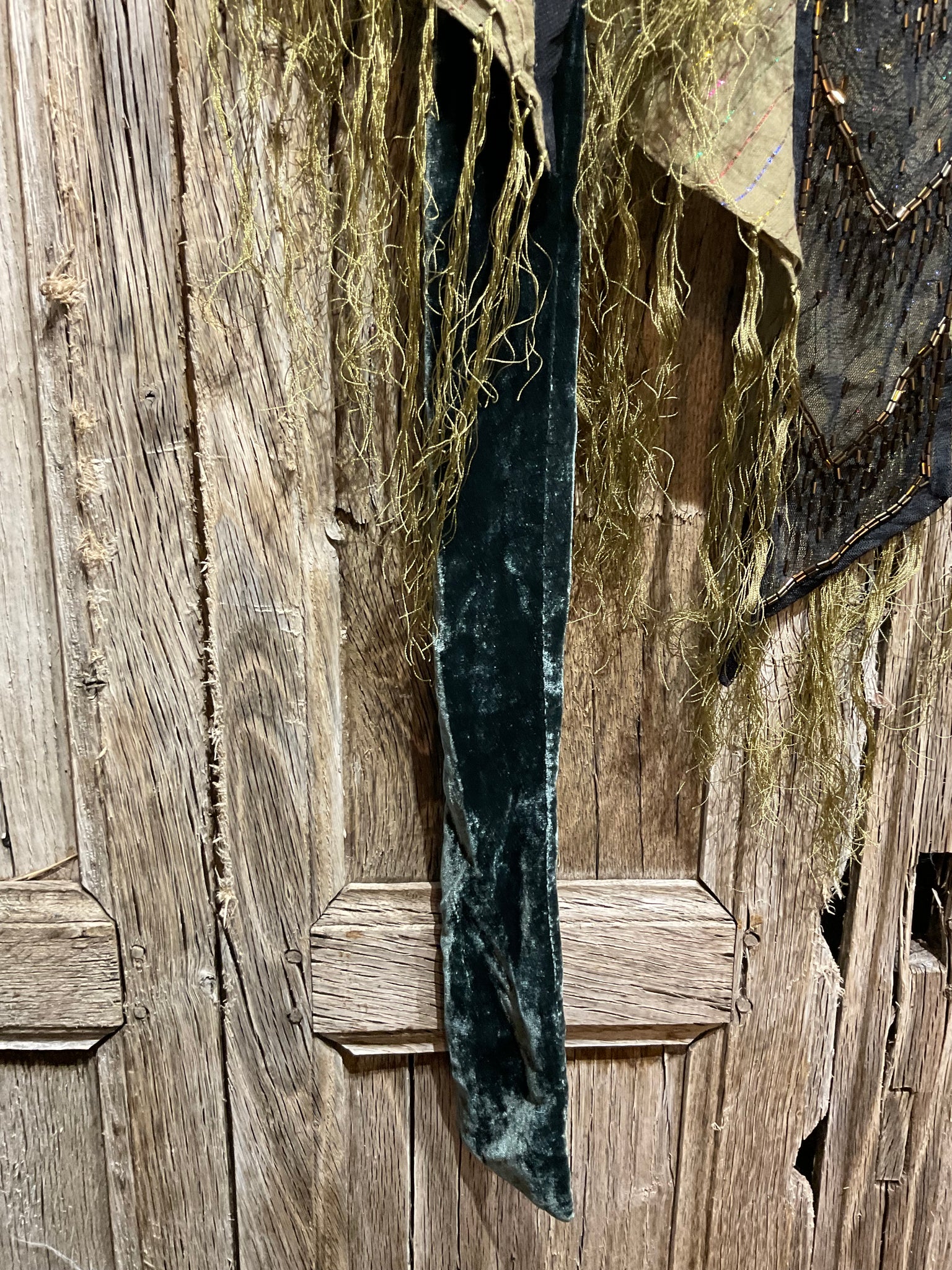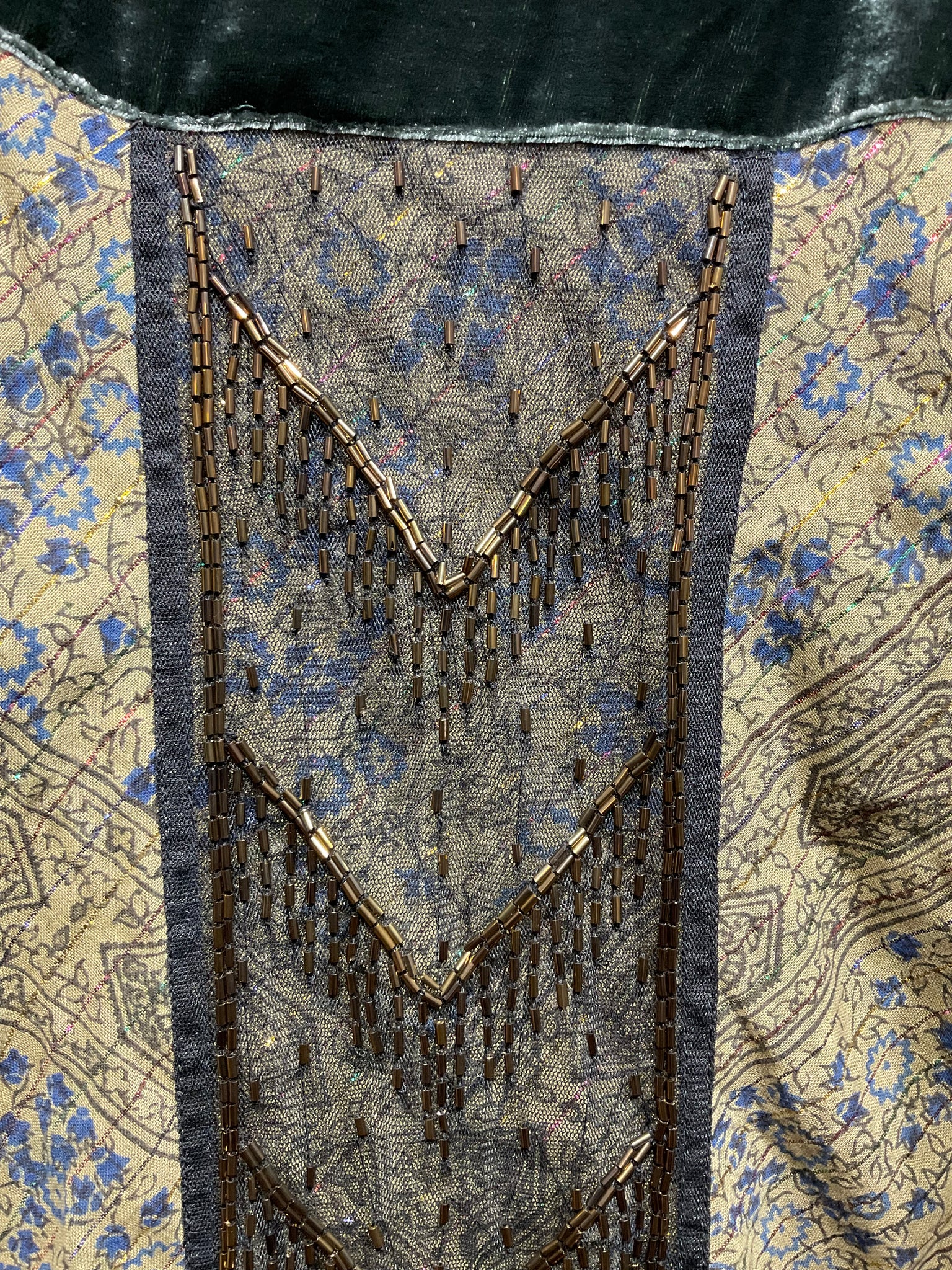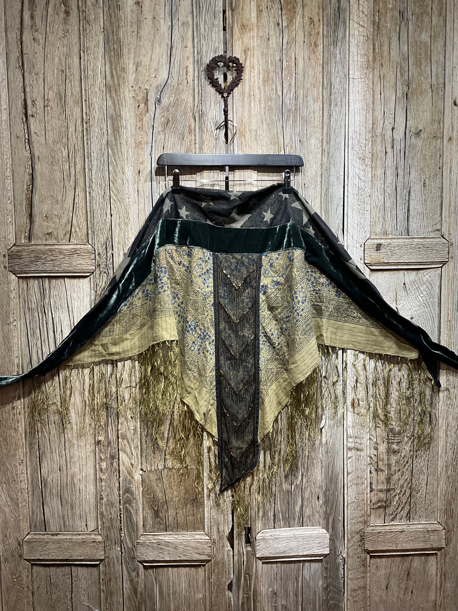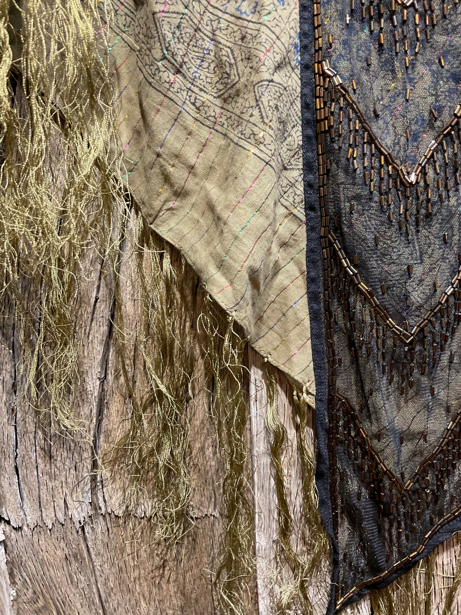Beautiful mixed fabric scarf with lovely beading and soft velvet and tassels. Perfect for a special occasion