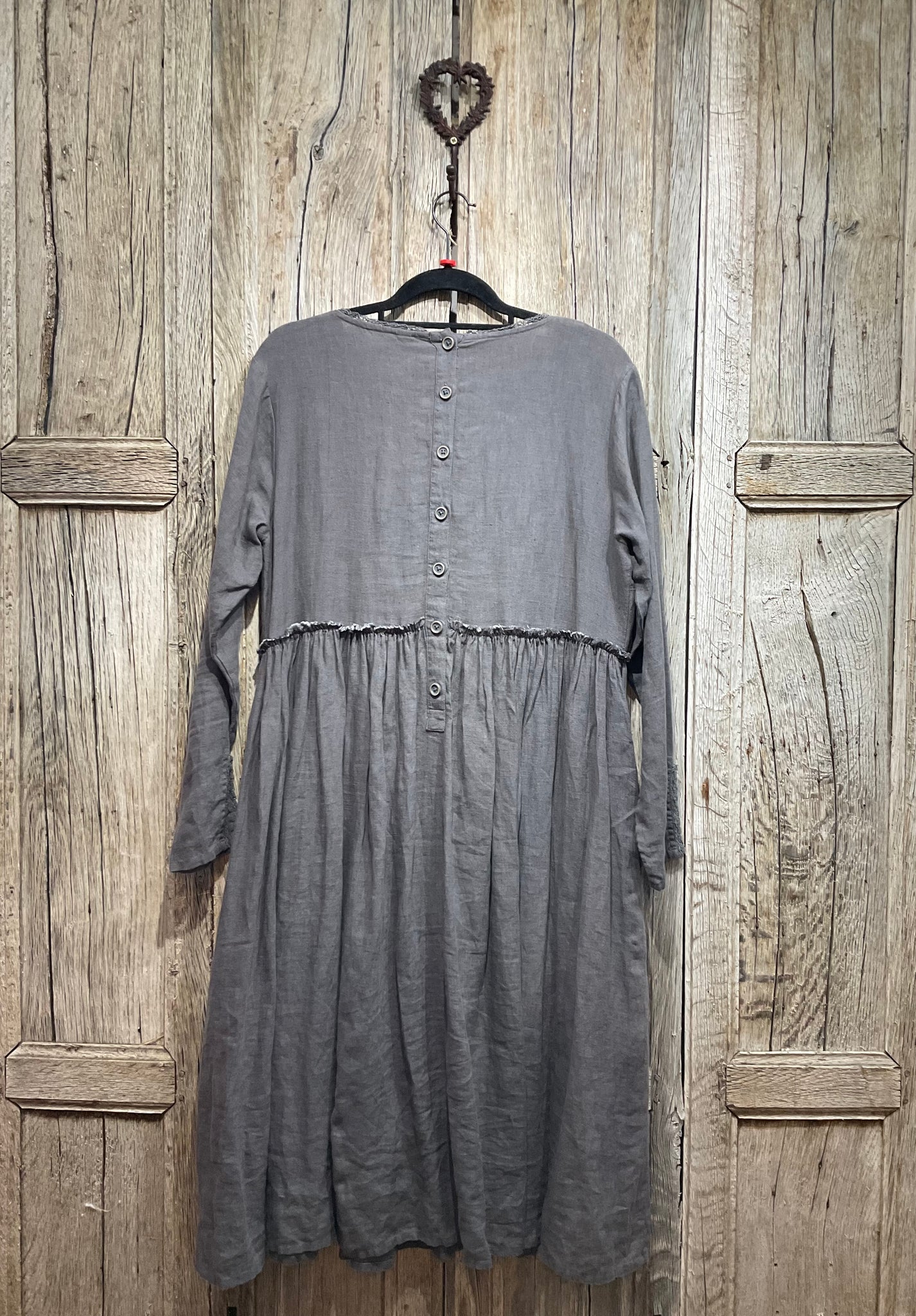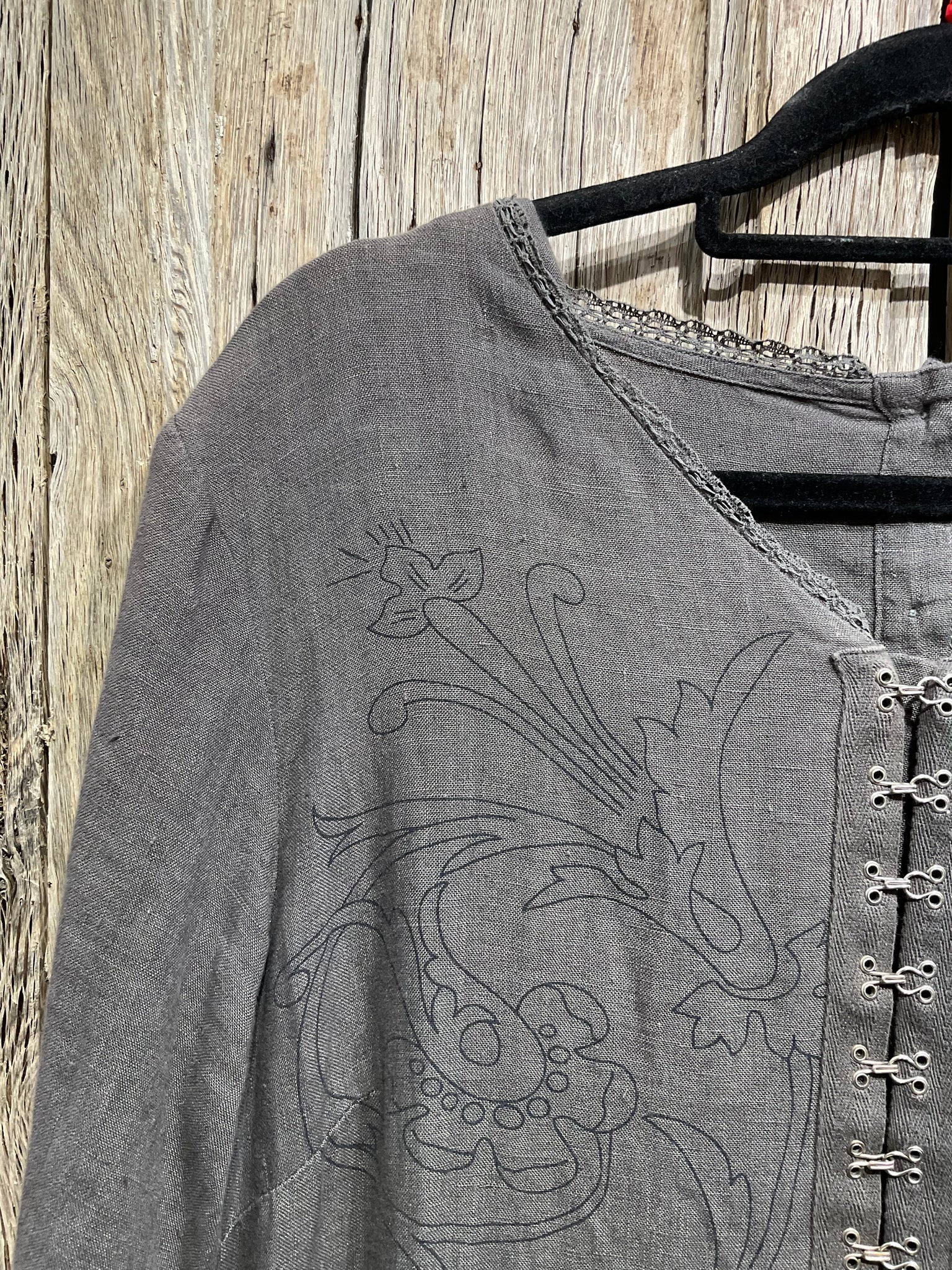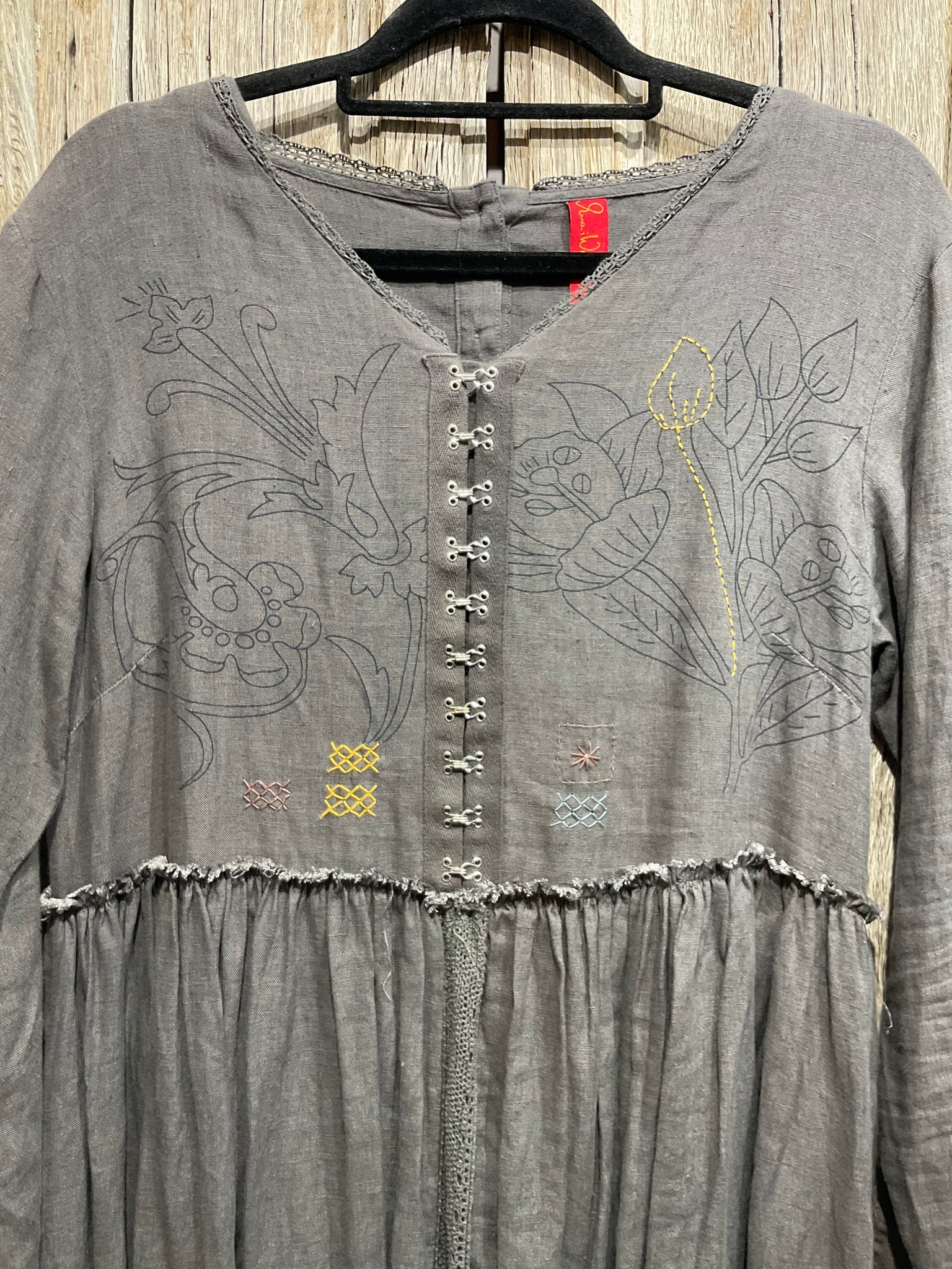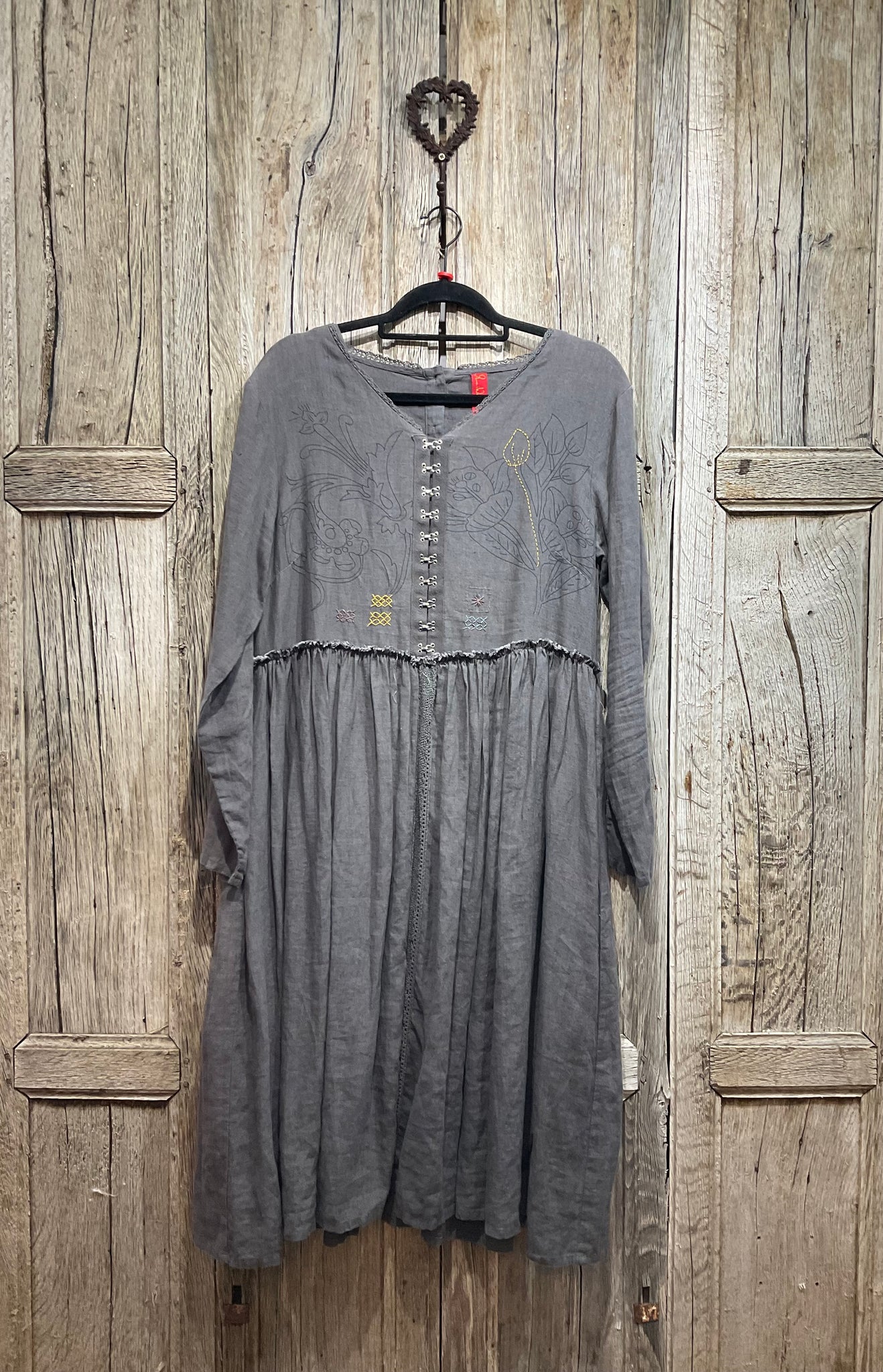 Beautiful grey linen dress with stunning embroidery, two pockets and hook and eye bodice.