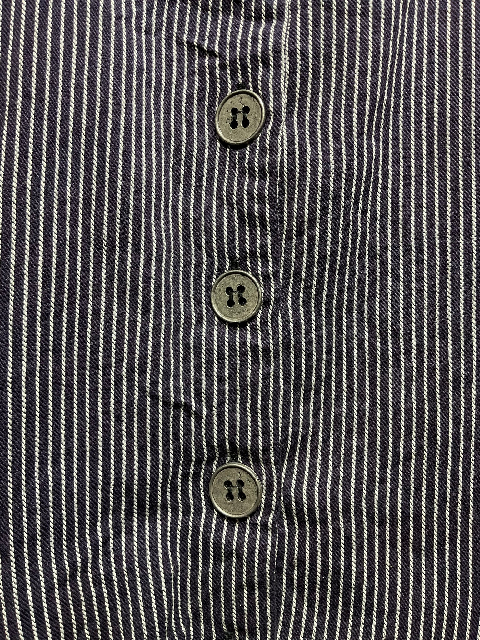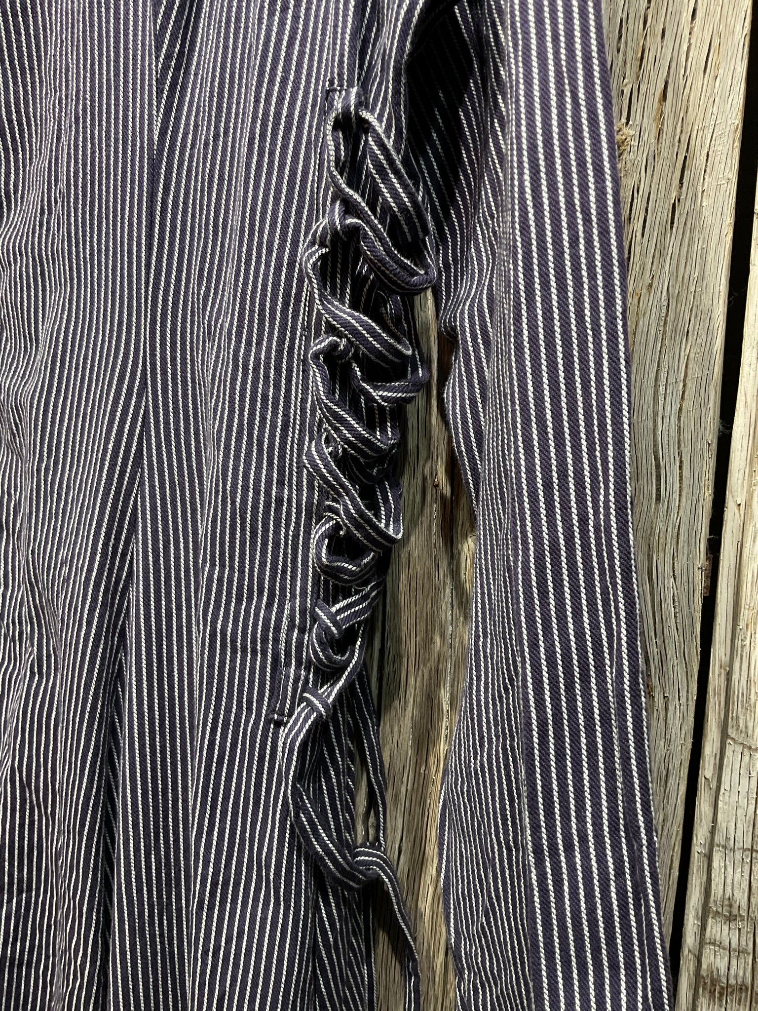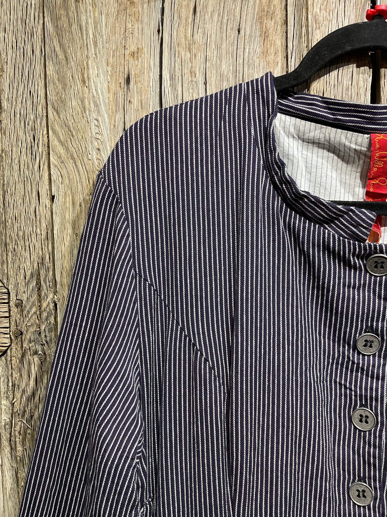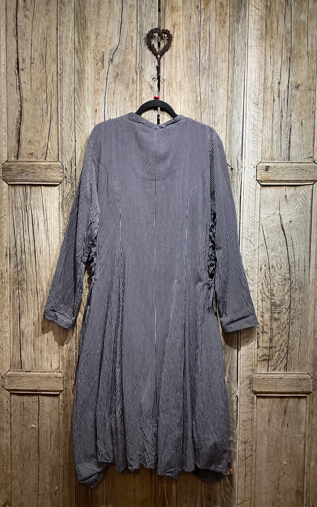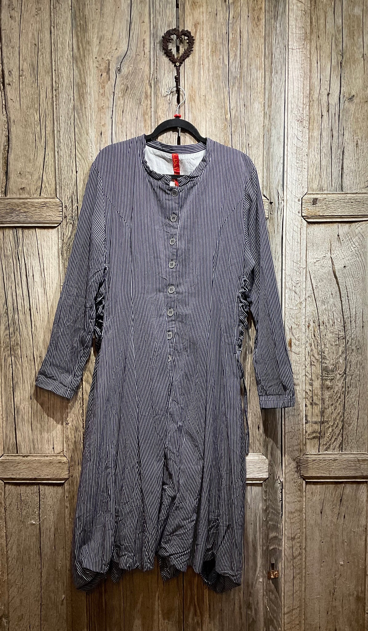 Beautiful navy and white stripe cotton coat with button down front, ties at the side and two side pockets.