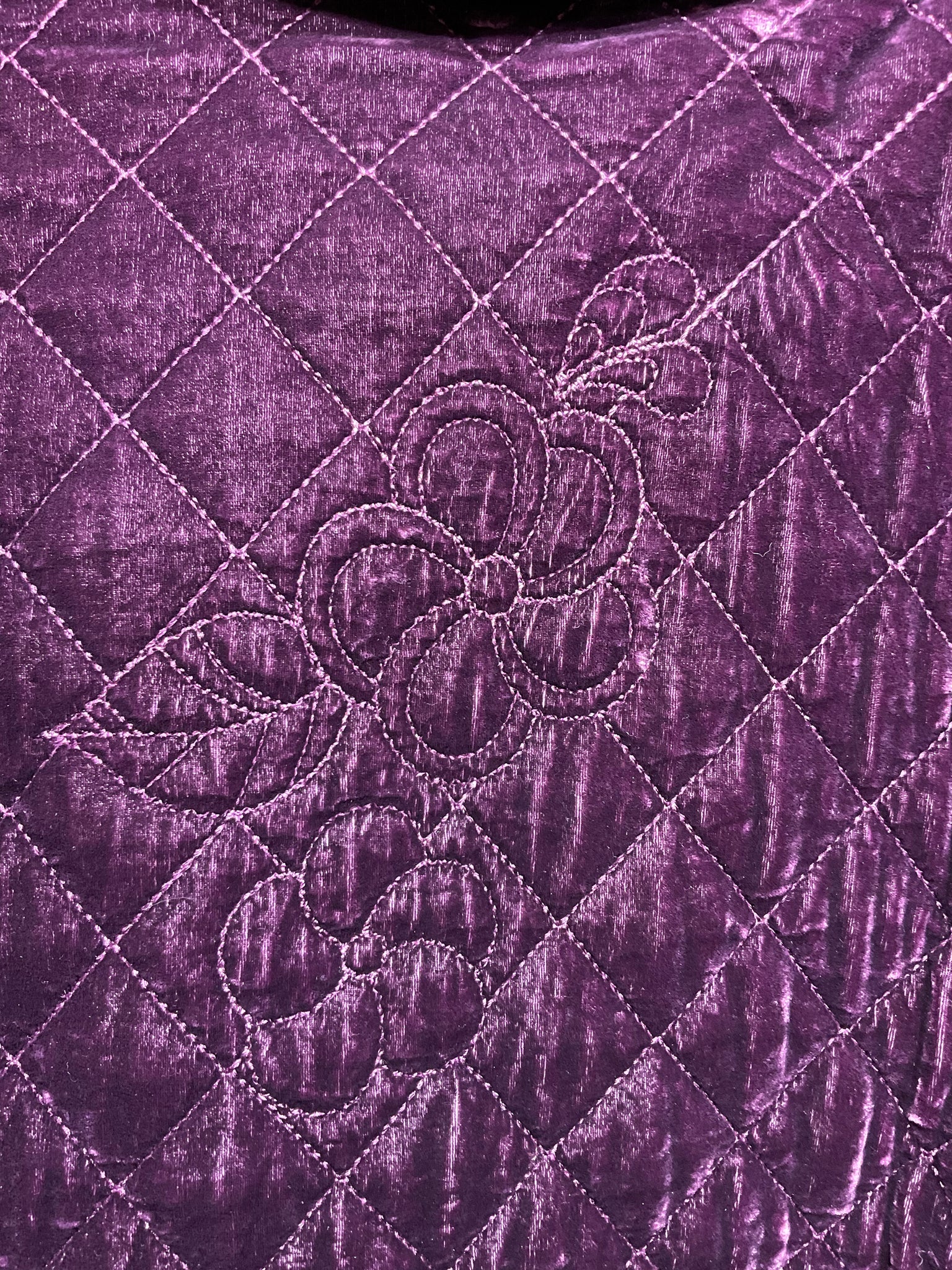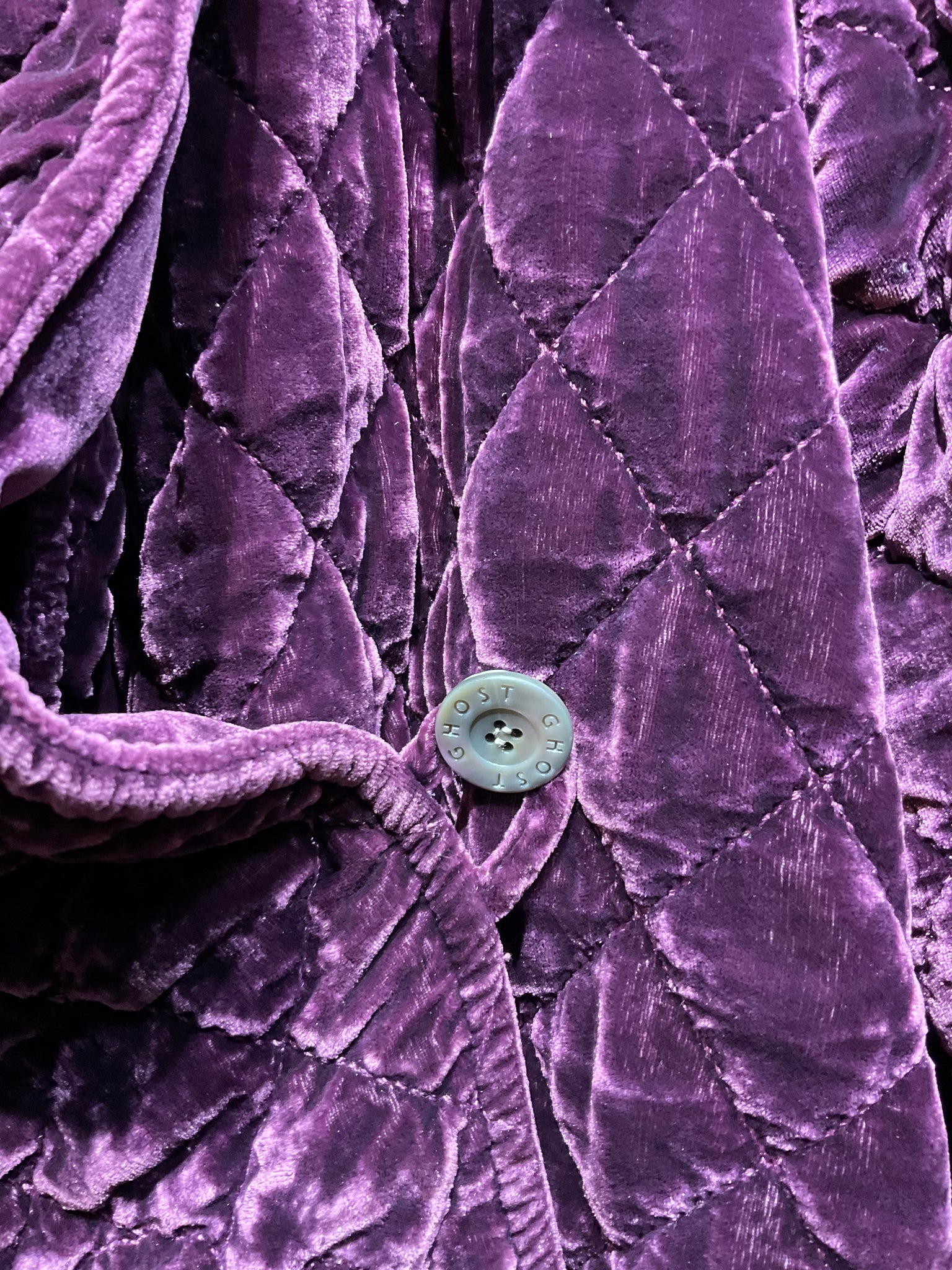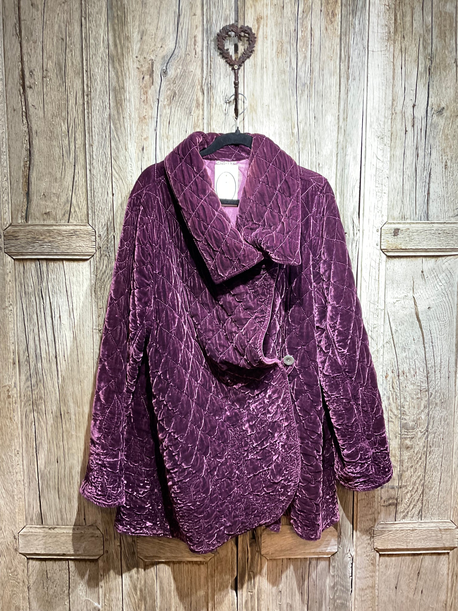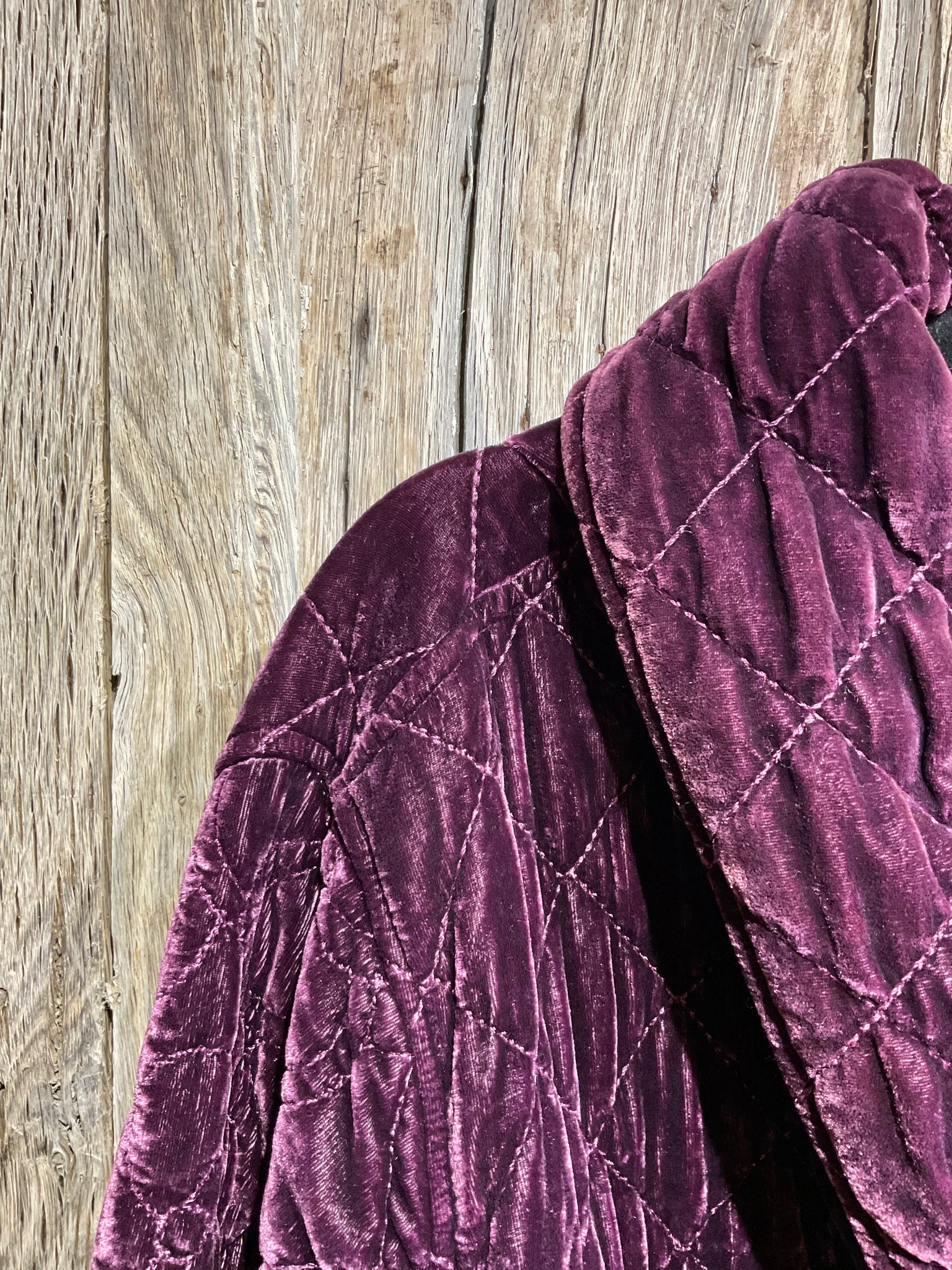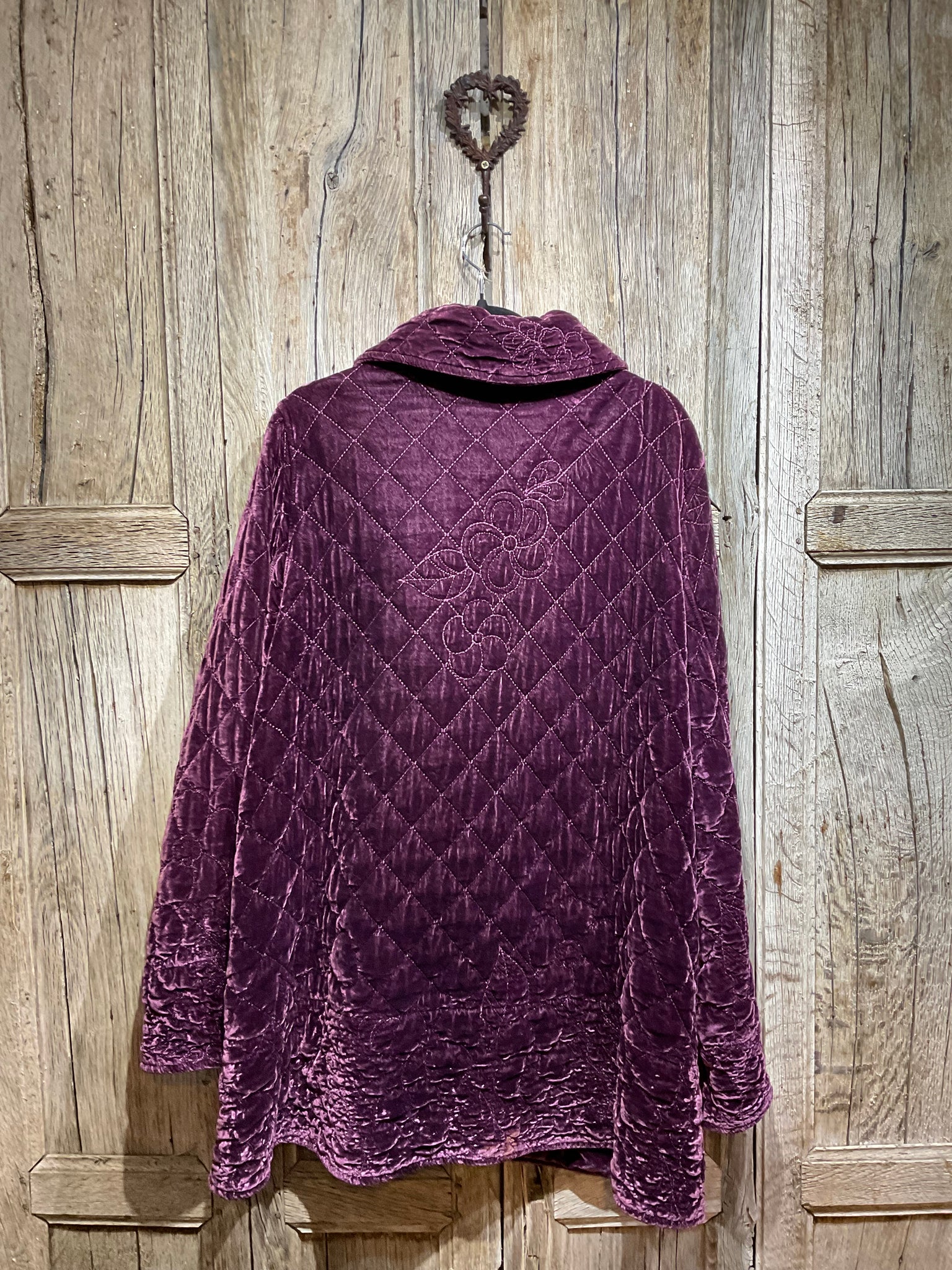 Sumptuous velvet jacket in a gorgeous raspberry with flower stitching, two buttons for fastening and two lovely deep pockets. Absolutely beautiful quality!