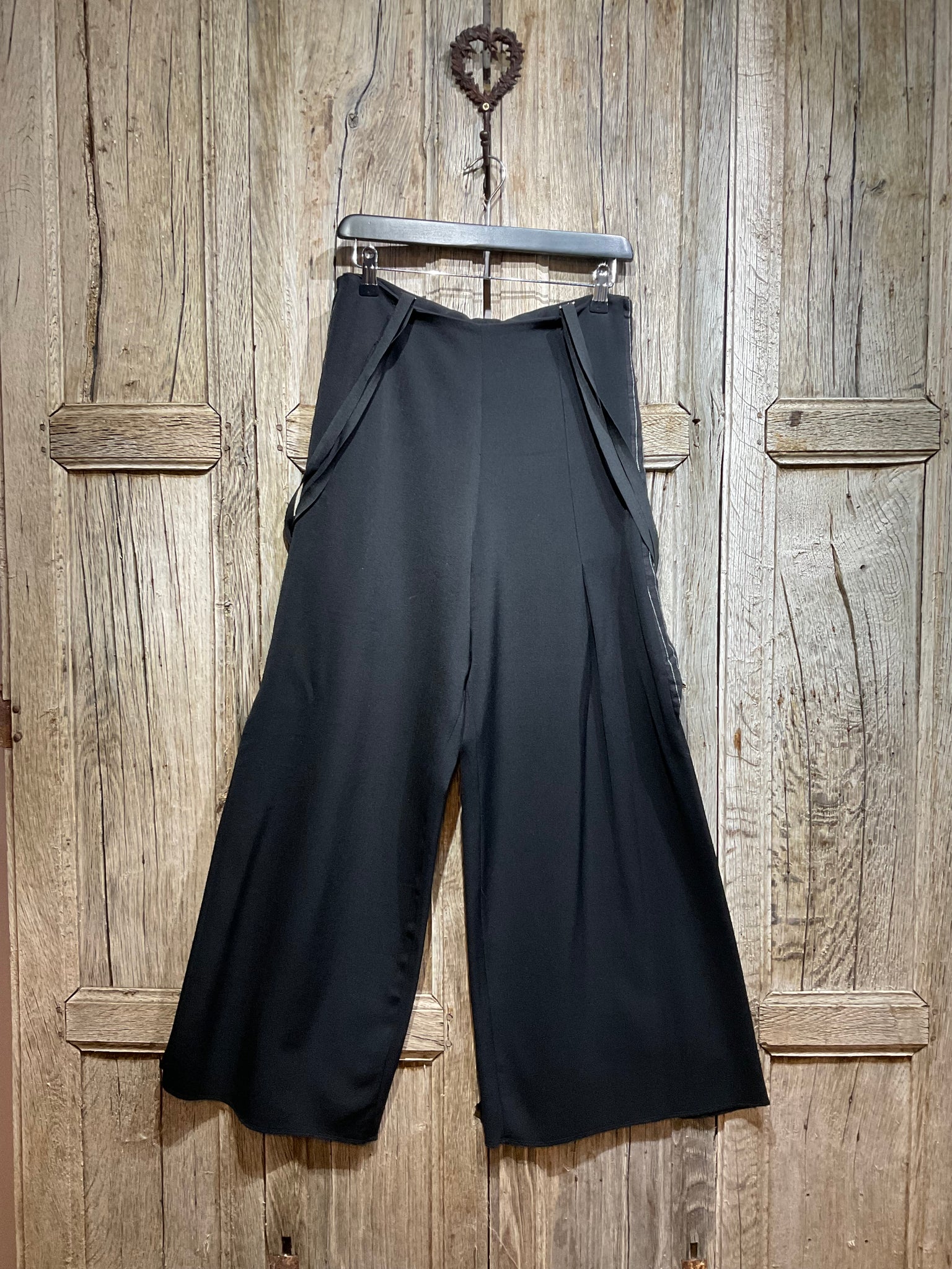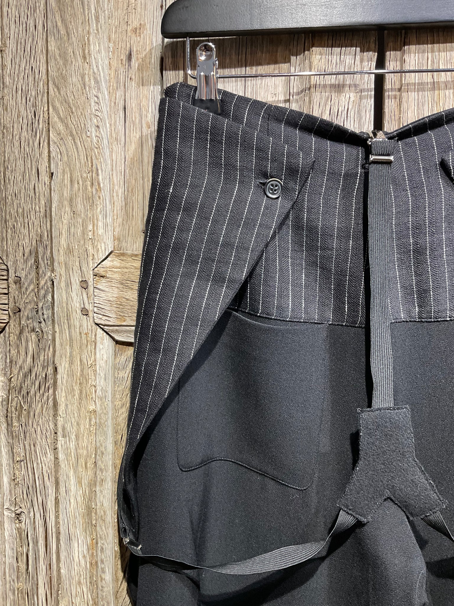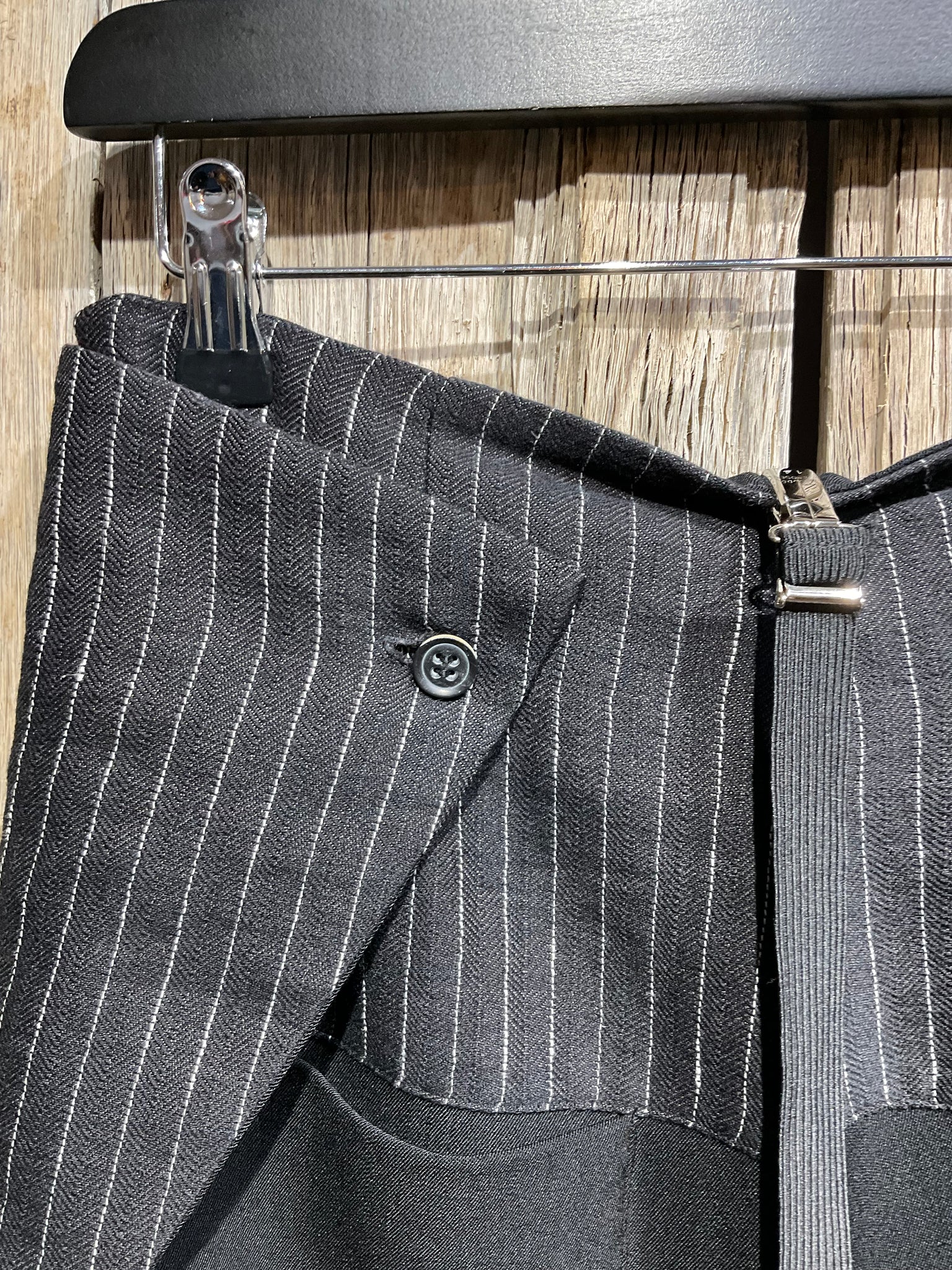 Super stylish black trousers with black and white stripe detail at the side and back, two front pockets and one on the back, two buttons on the back, side zip fastening and detachable braces.