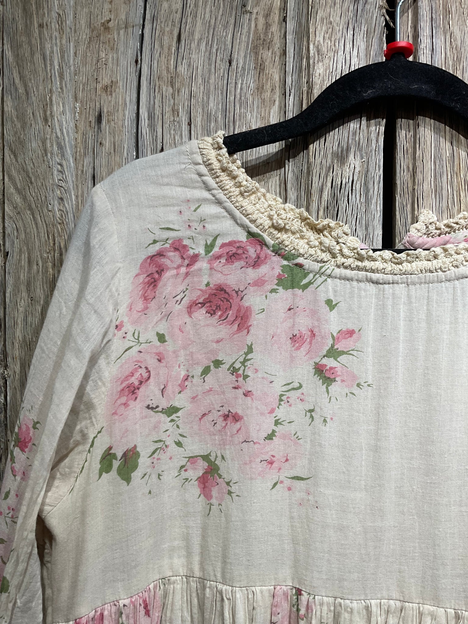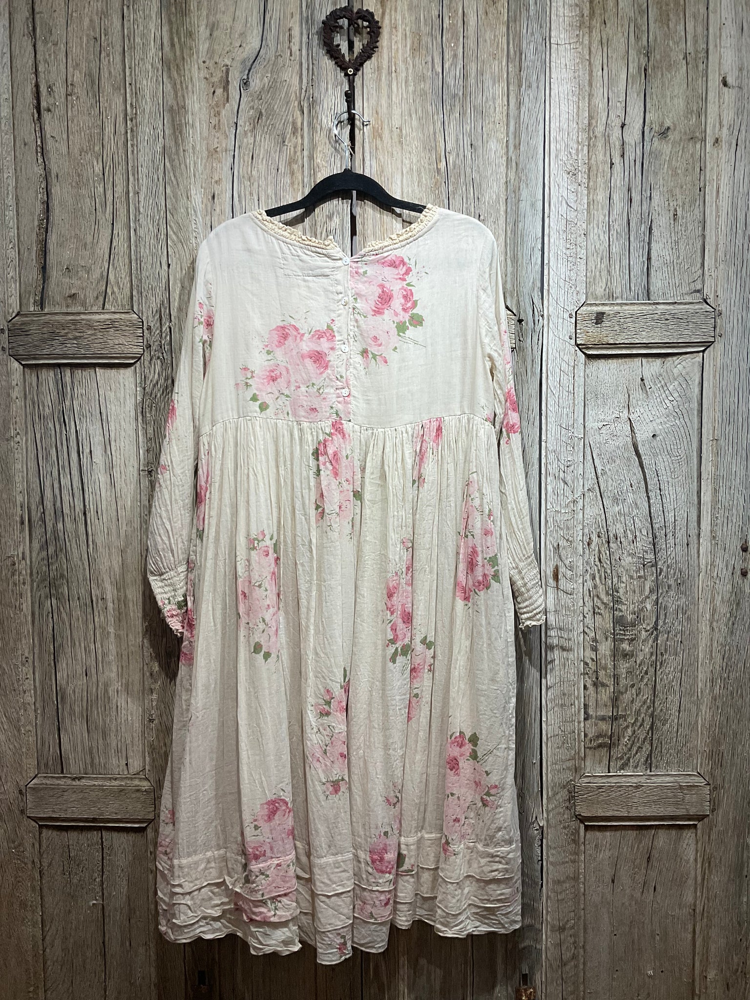 Beautiful floral dress with delicate lace around the neckline, button down back and side pockets. Perfect dress for spring/summer.