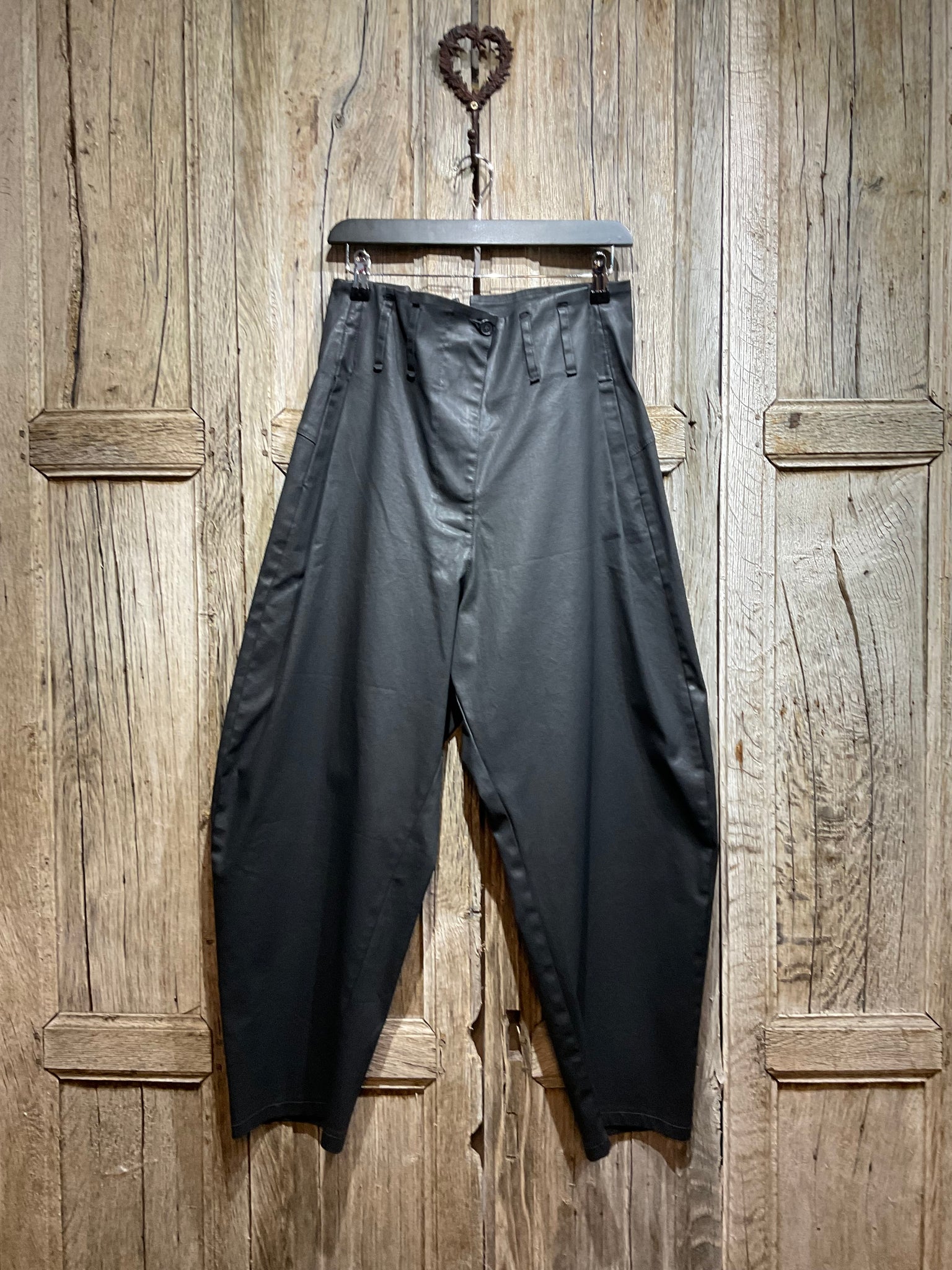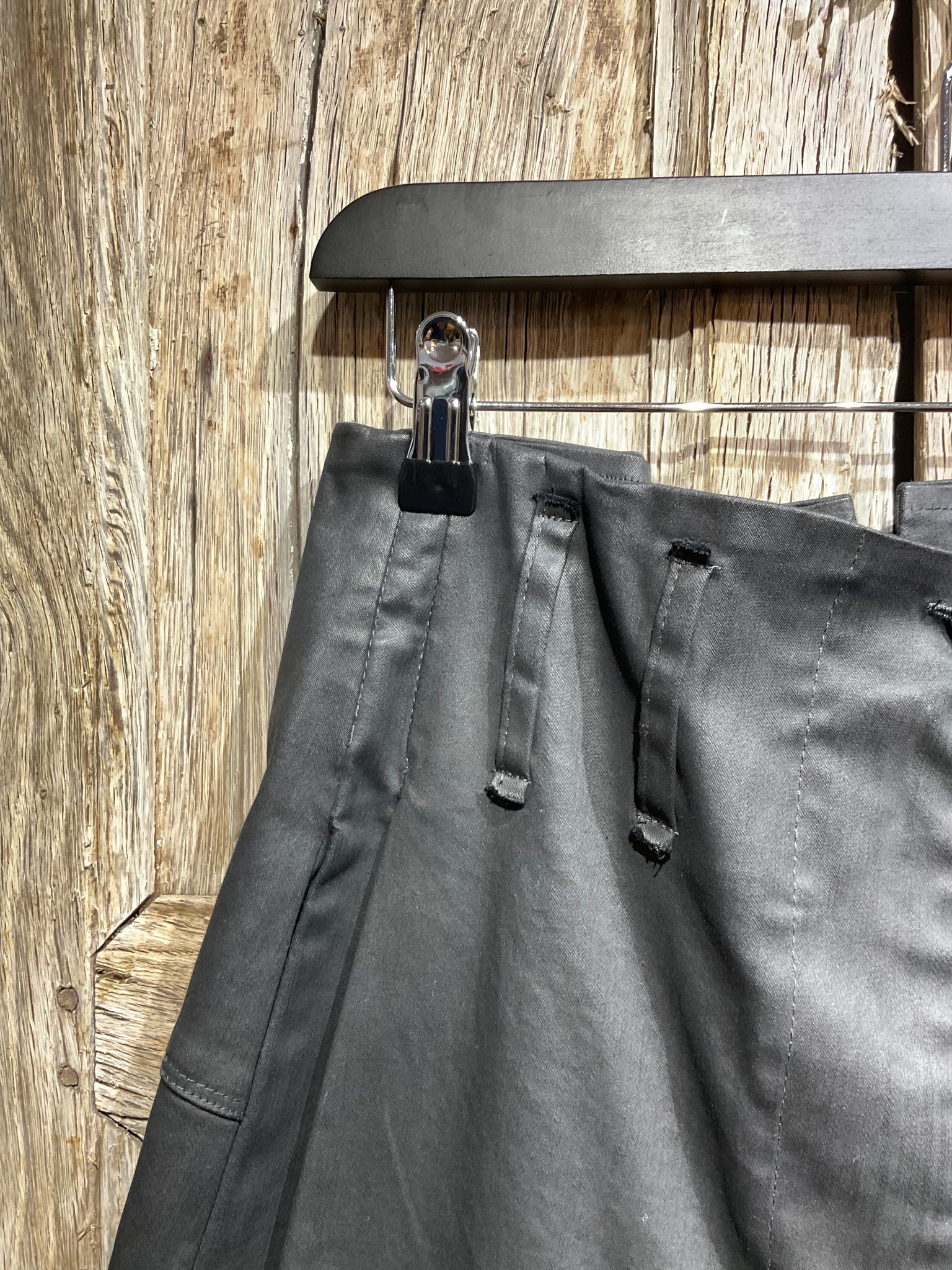 Gorgeous stiff cotton black trousers with button and zip fastening at the front, large belt loop details, two side pockets and one on the back.