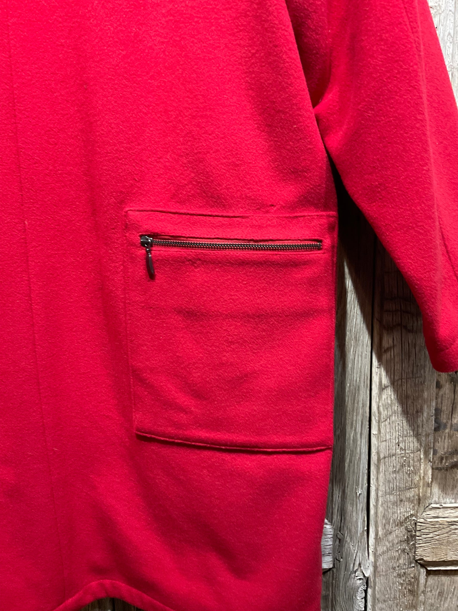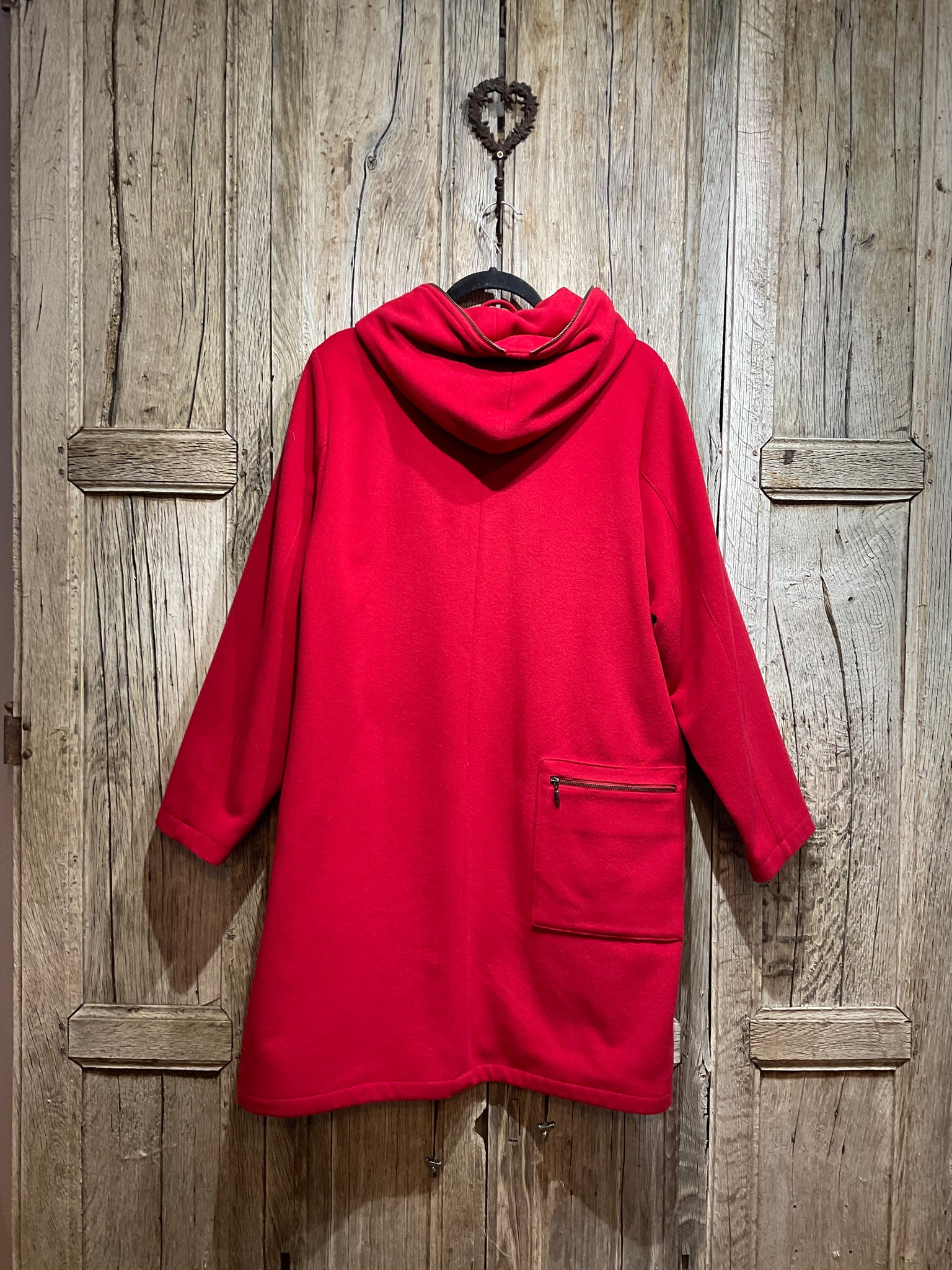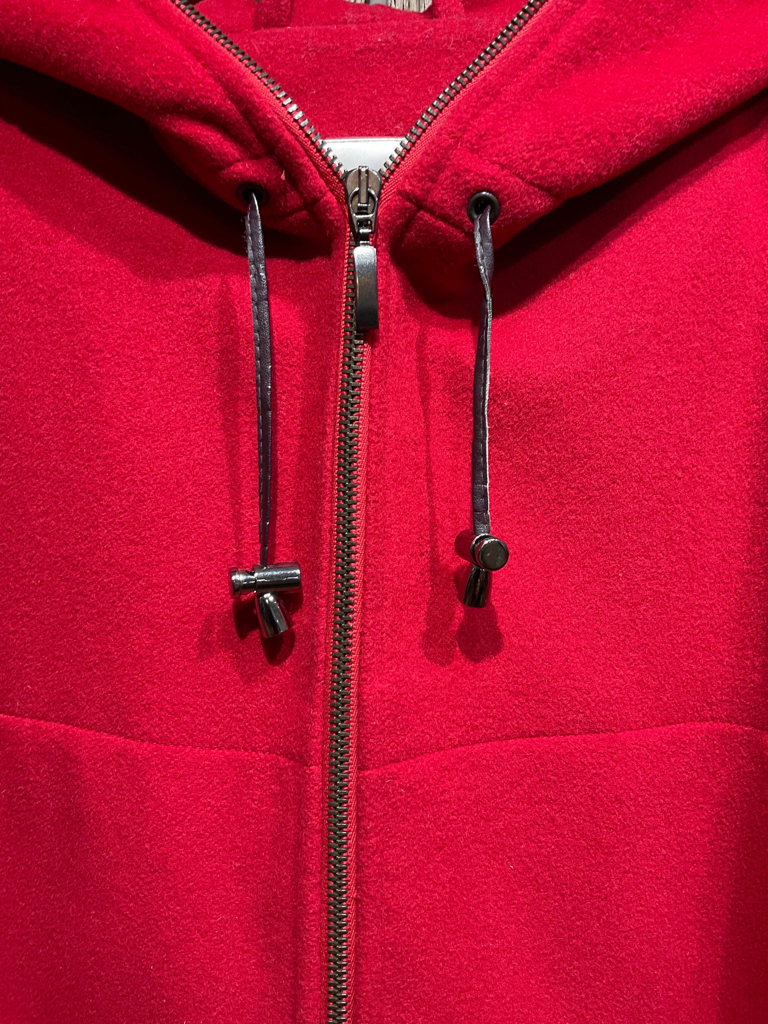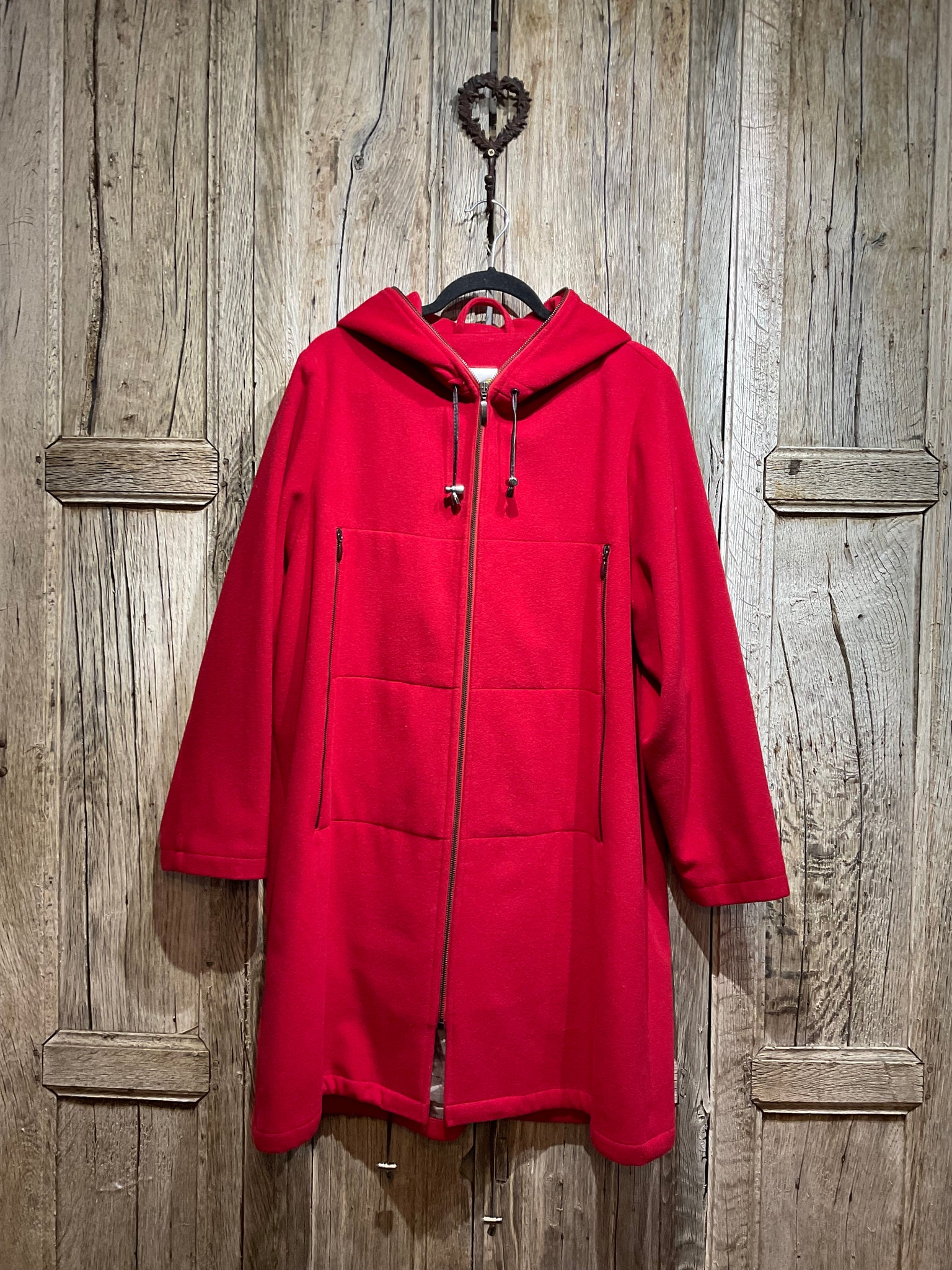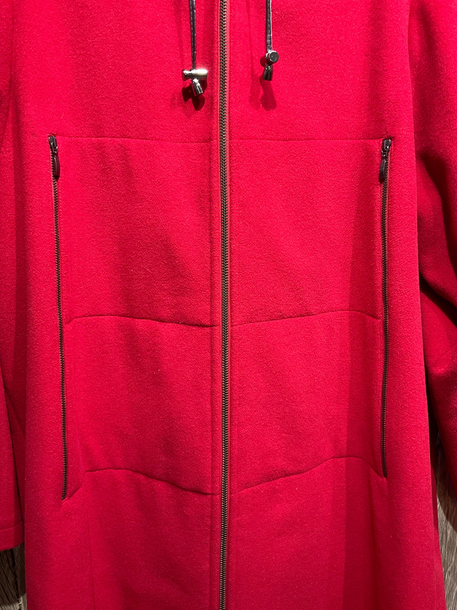 Beautiful red mix wool coat with a zipper front, four pockets at the front with zippers, drawstring around the hood and hem, and a pocket with zippers on the back and fully lined. Lovely and cosy!