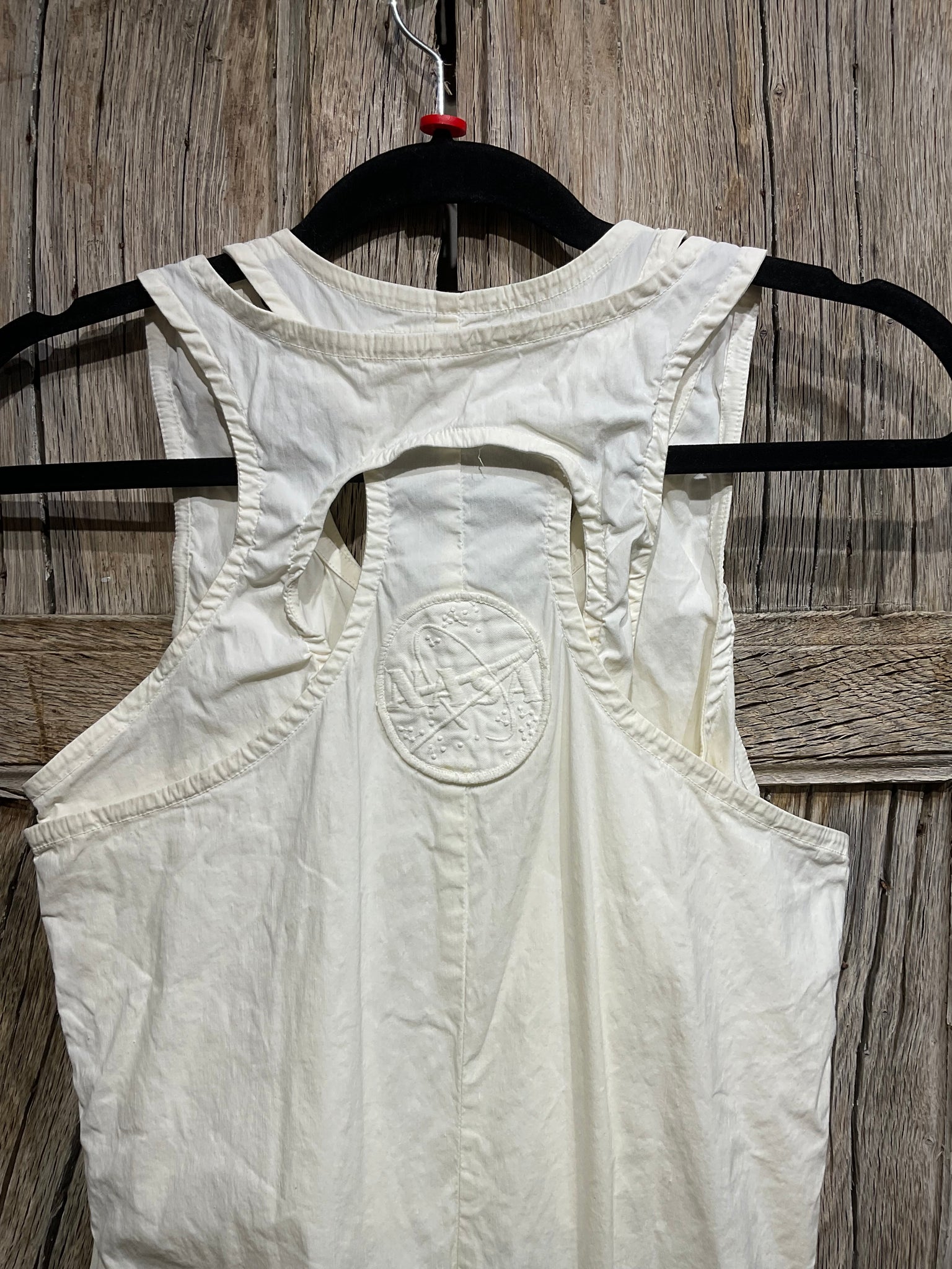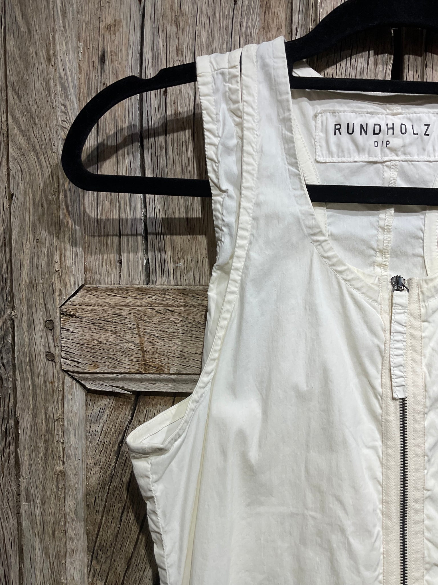 Lovely chalk cotton jumpsuit with drop crotch, a zip down front and two side pockets.p