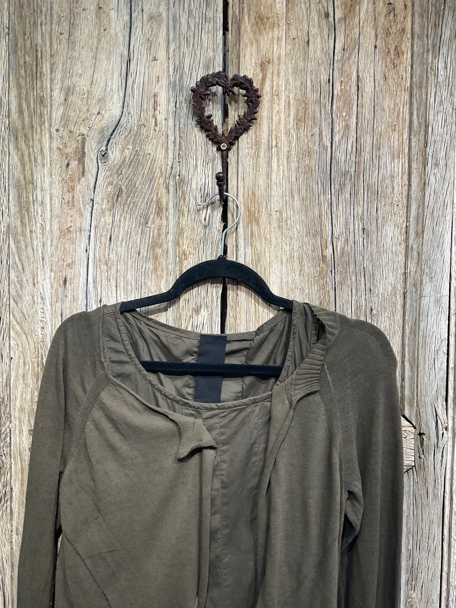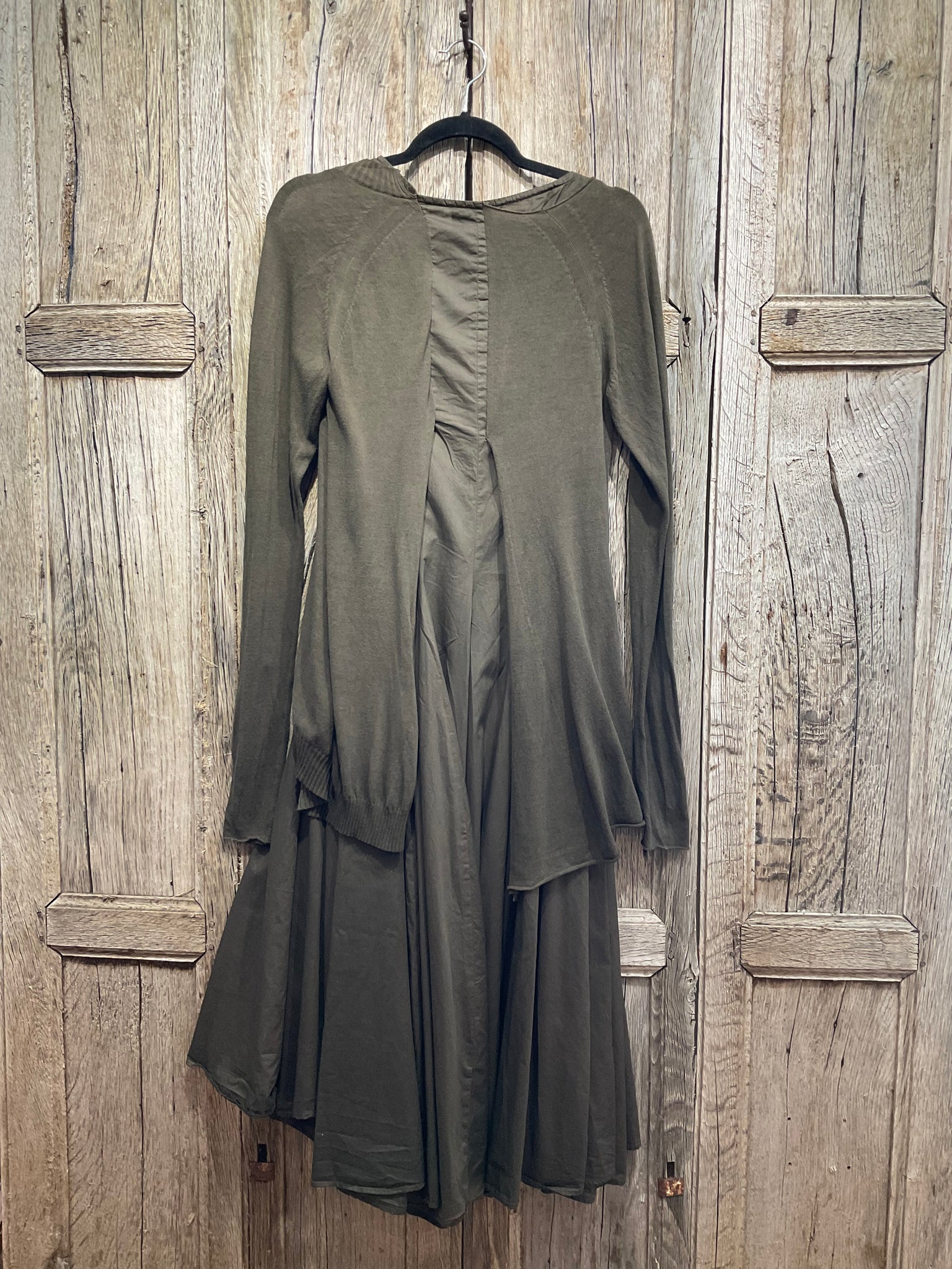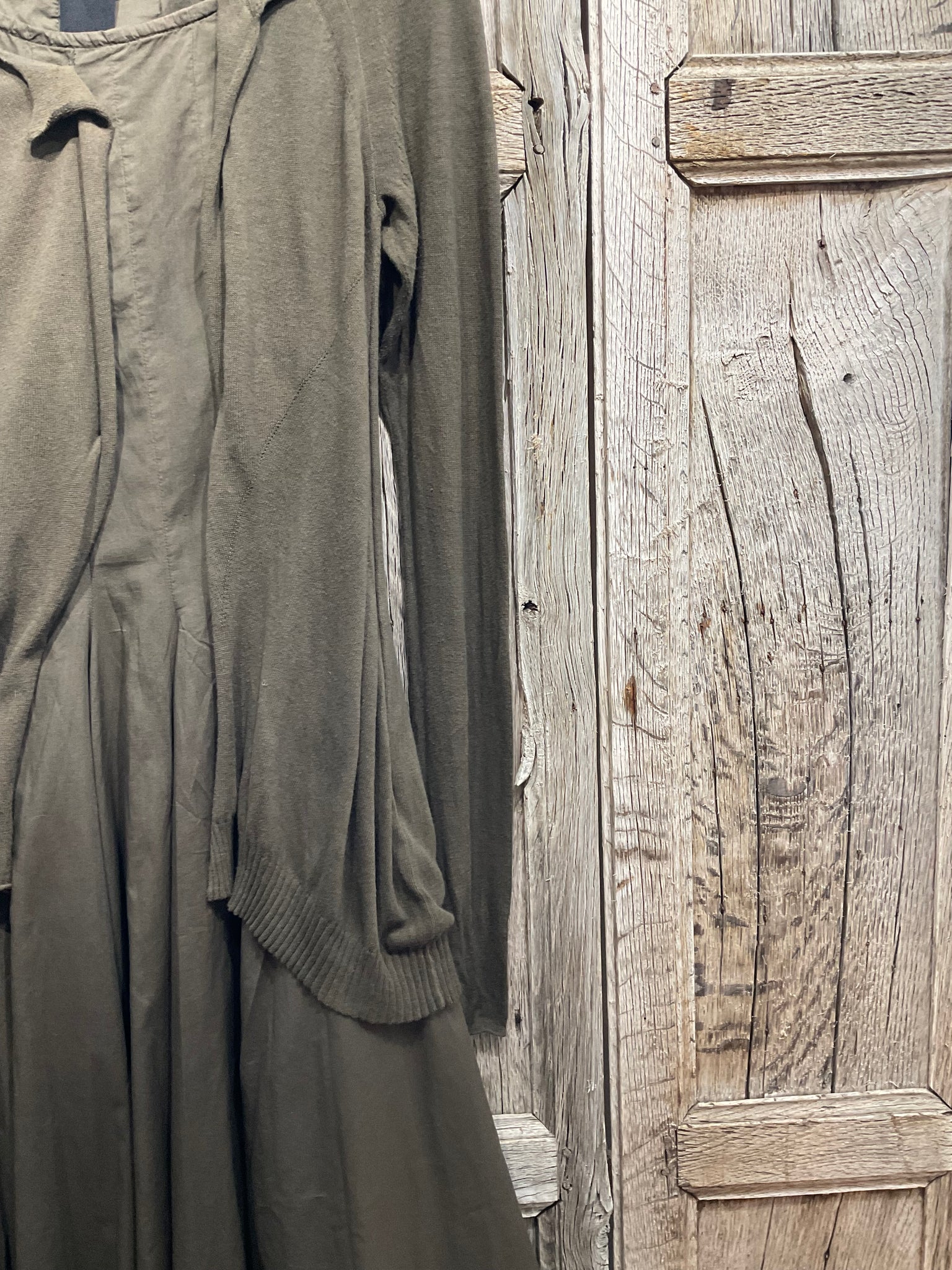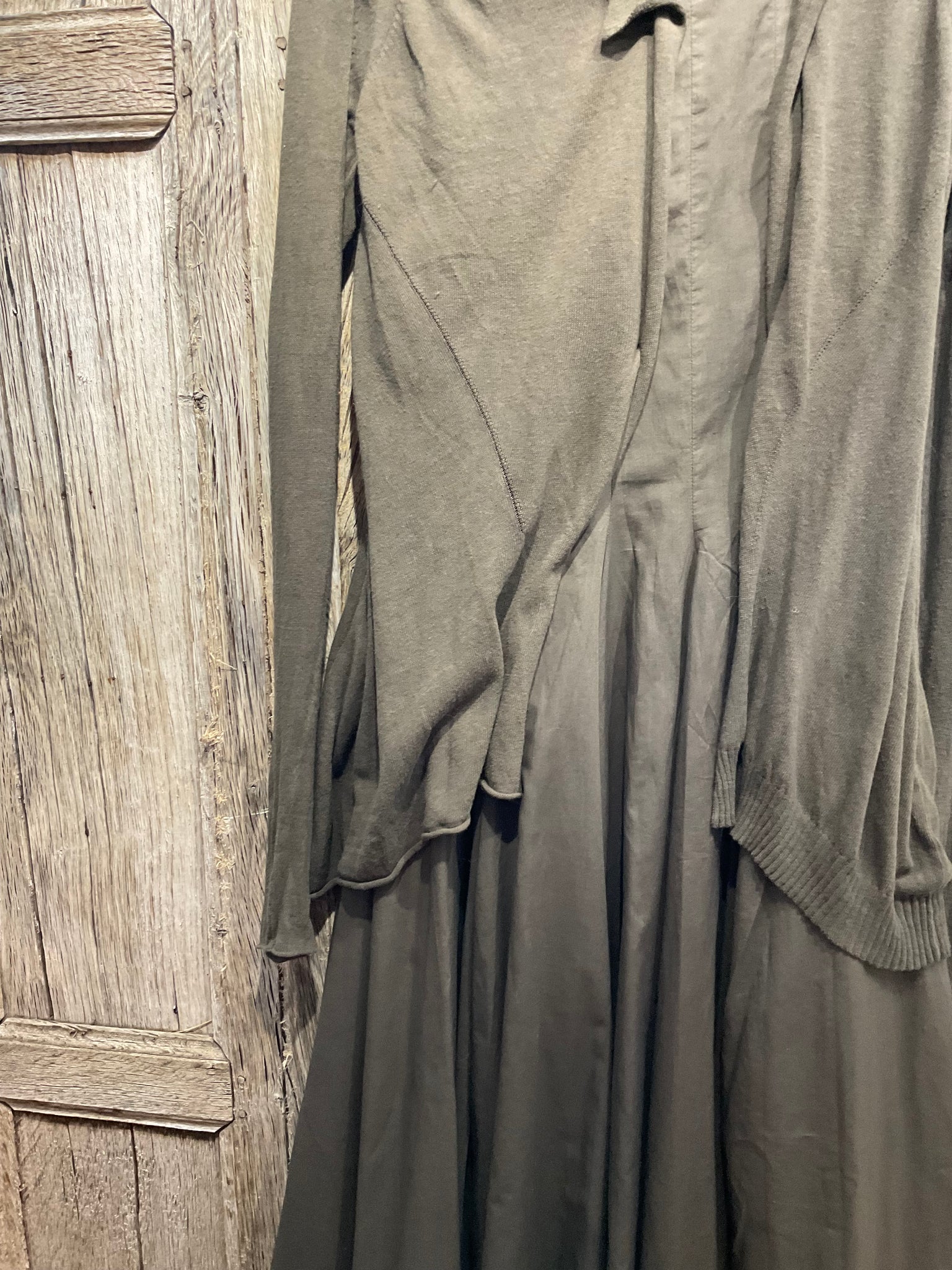 Utterly magnificent. First there’s a long sleeveless dress that flares out in a mass of pleats … then, stitched onto this is a sort of ‘faux’ cardigan with extra long sleeves and a ribbed bottom. The straps of the dress are just visible under the cardi, but clearly they won’t move because it’s all-of-a-piece … dead easy to wear despite the complex description!