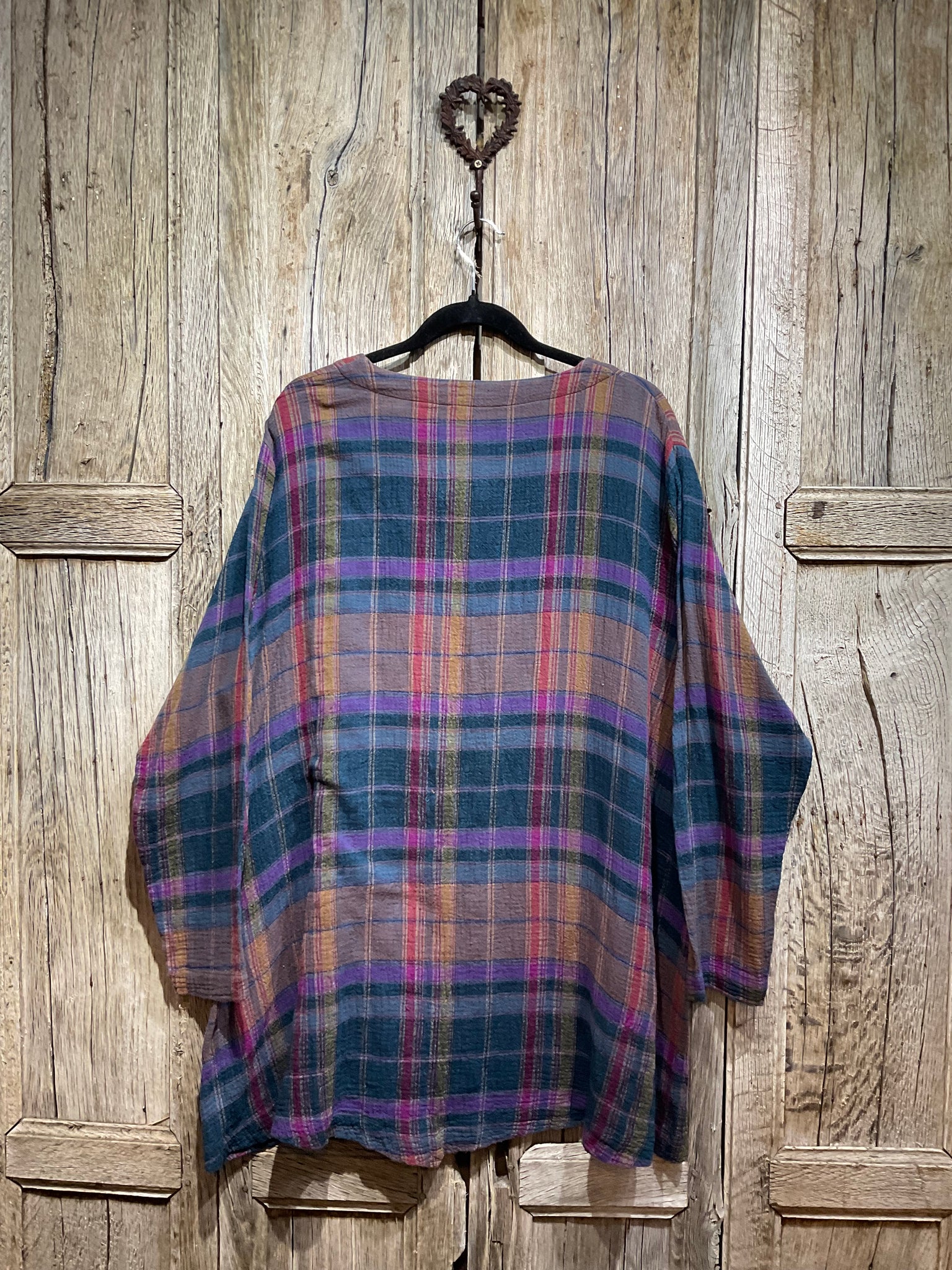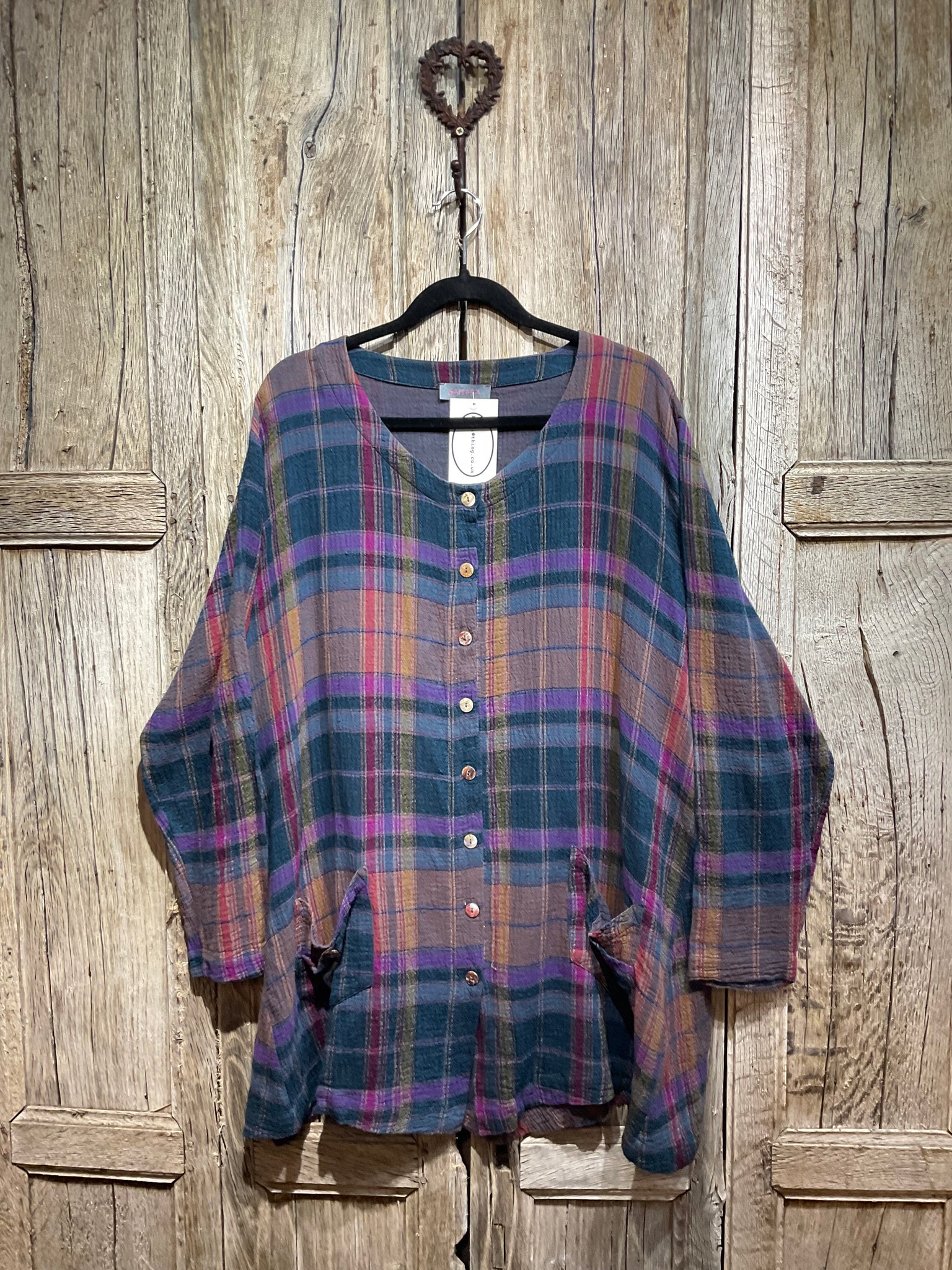 Beautiful cotton tartan button fastening shirt with two front pockets.