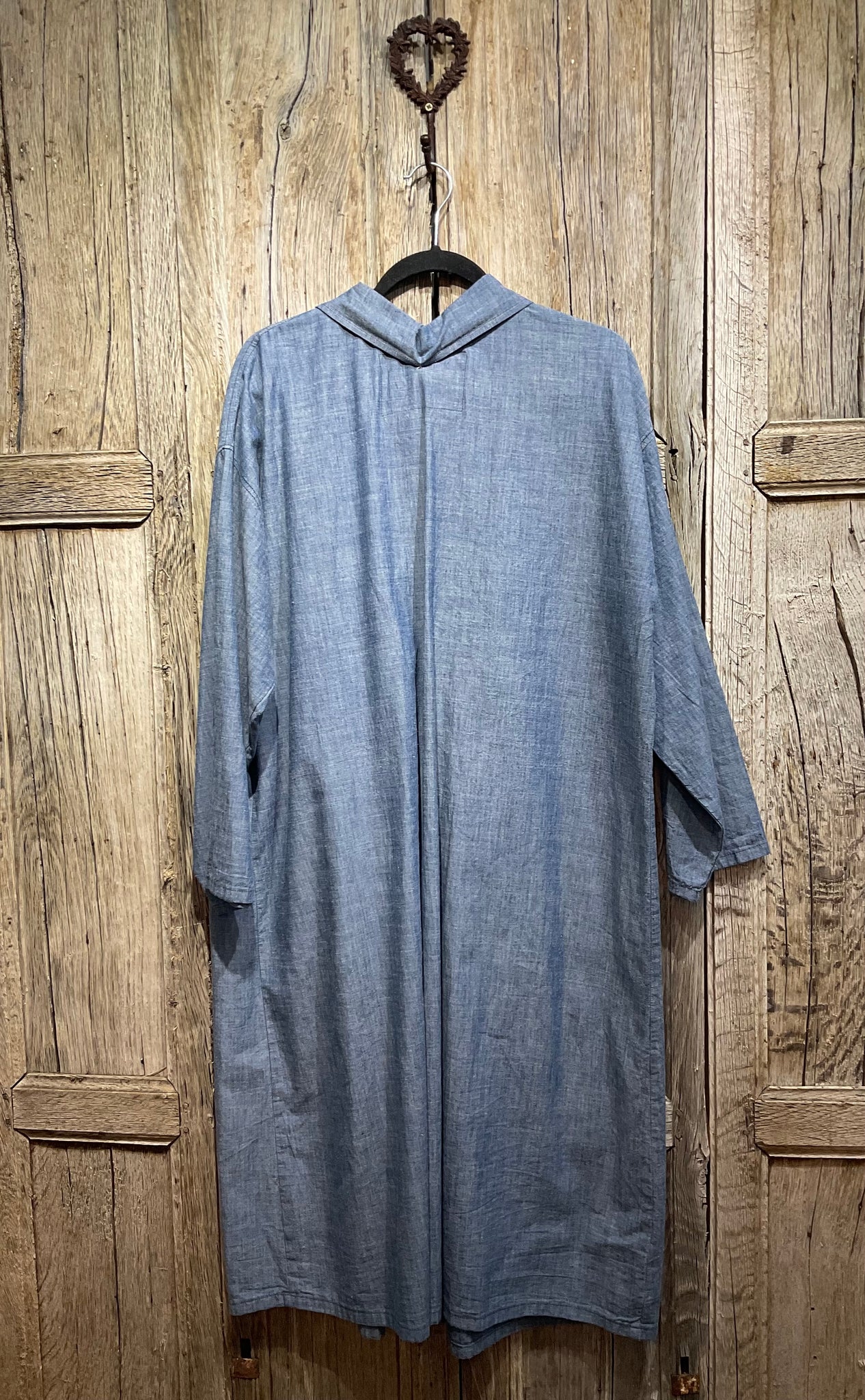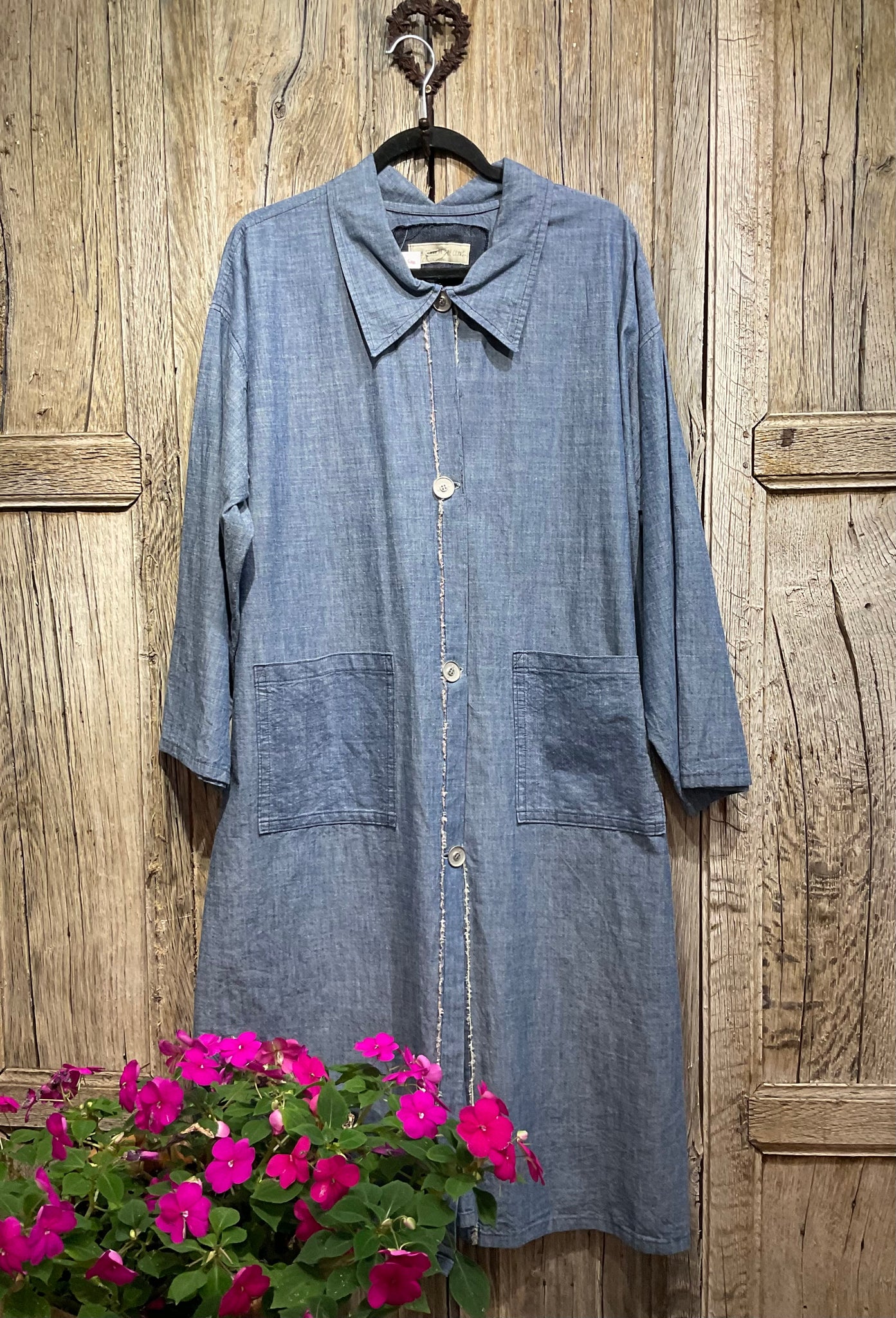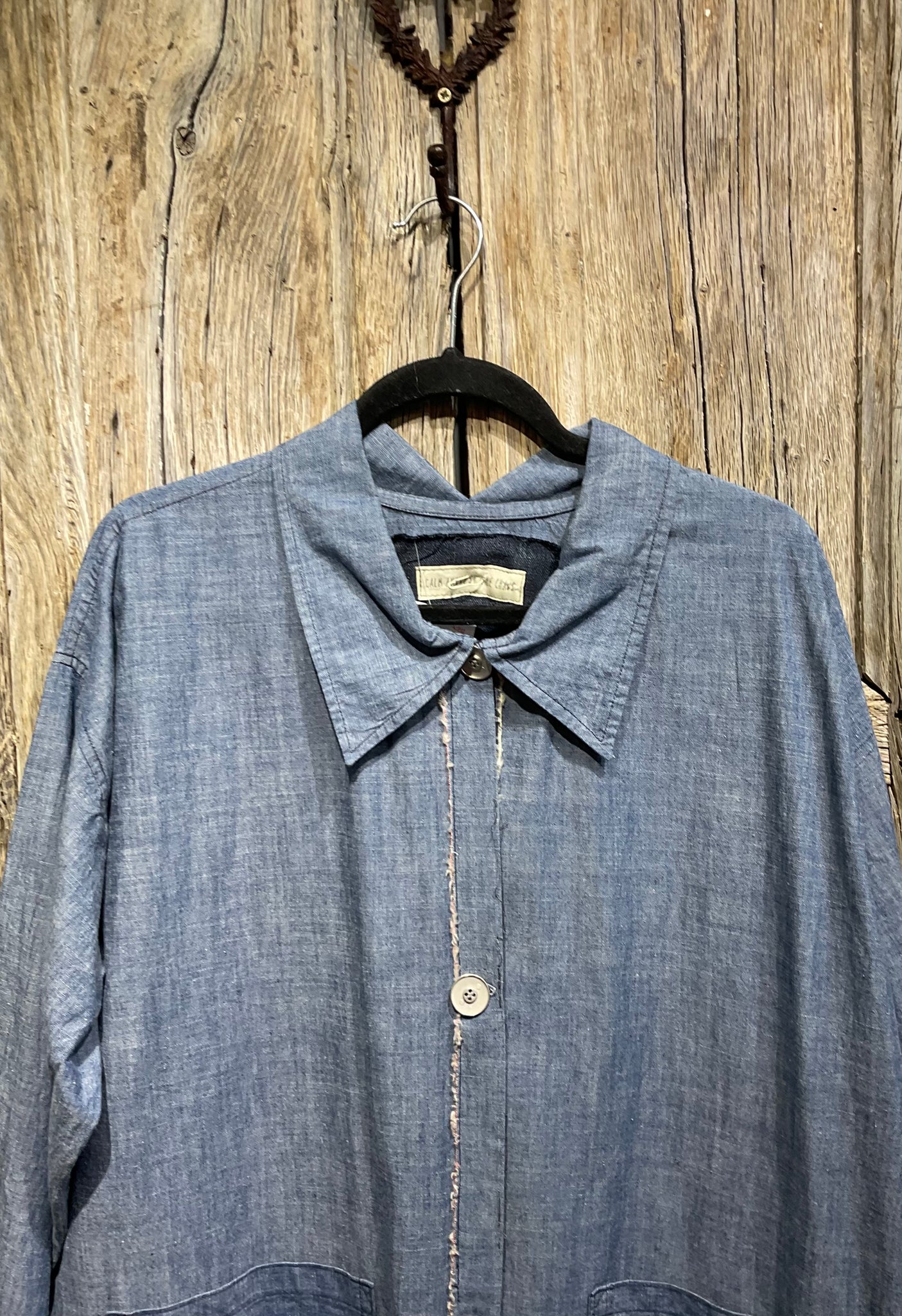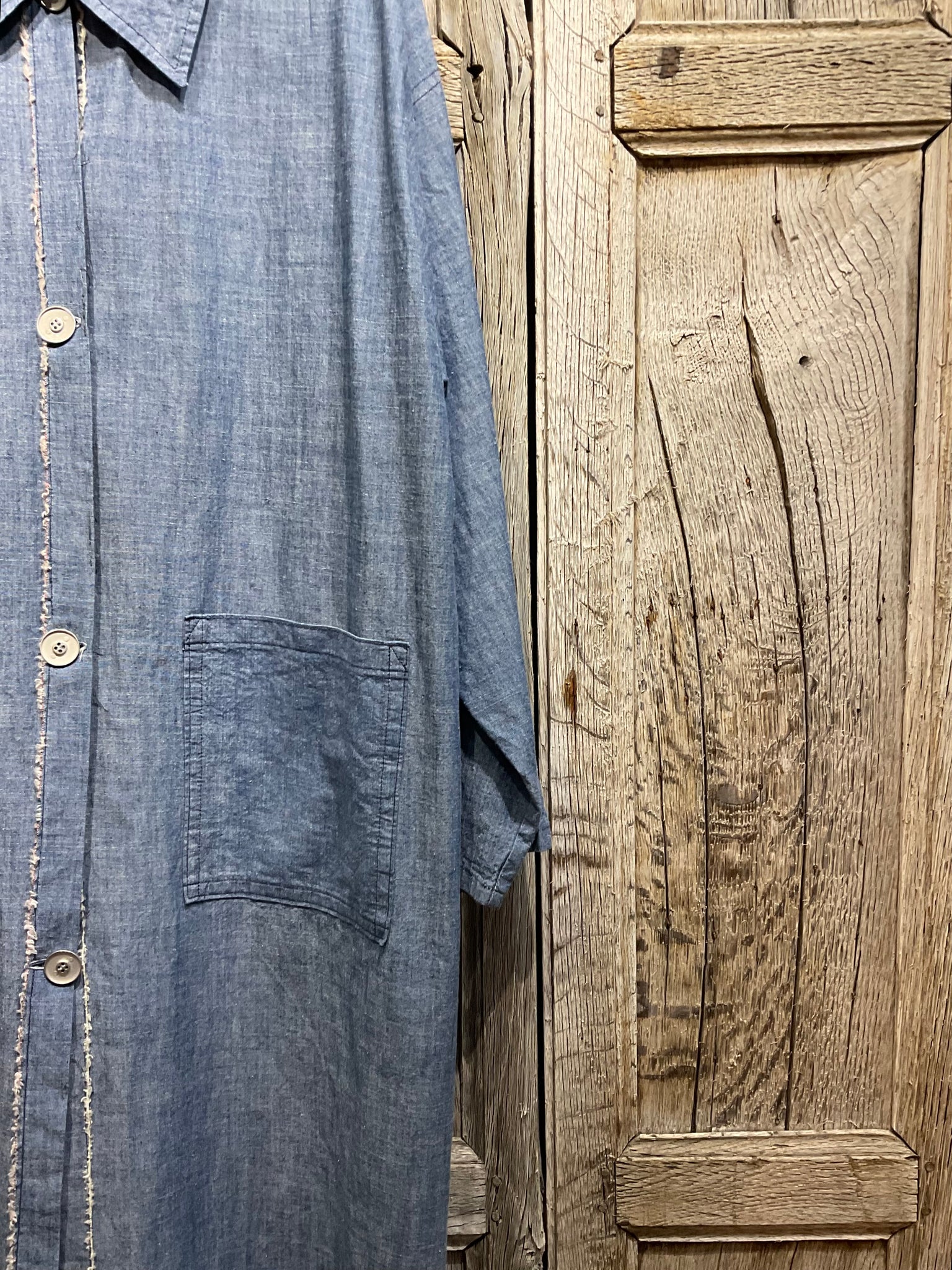 Simple straight cut in a light fabric. Deliberately frayed edging at the front and quite big statement metal buttons. Two big square front pockets.