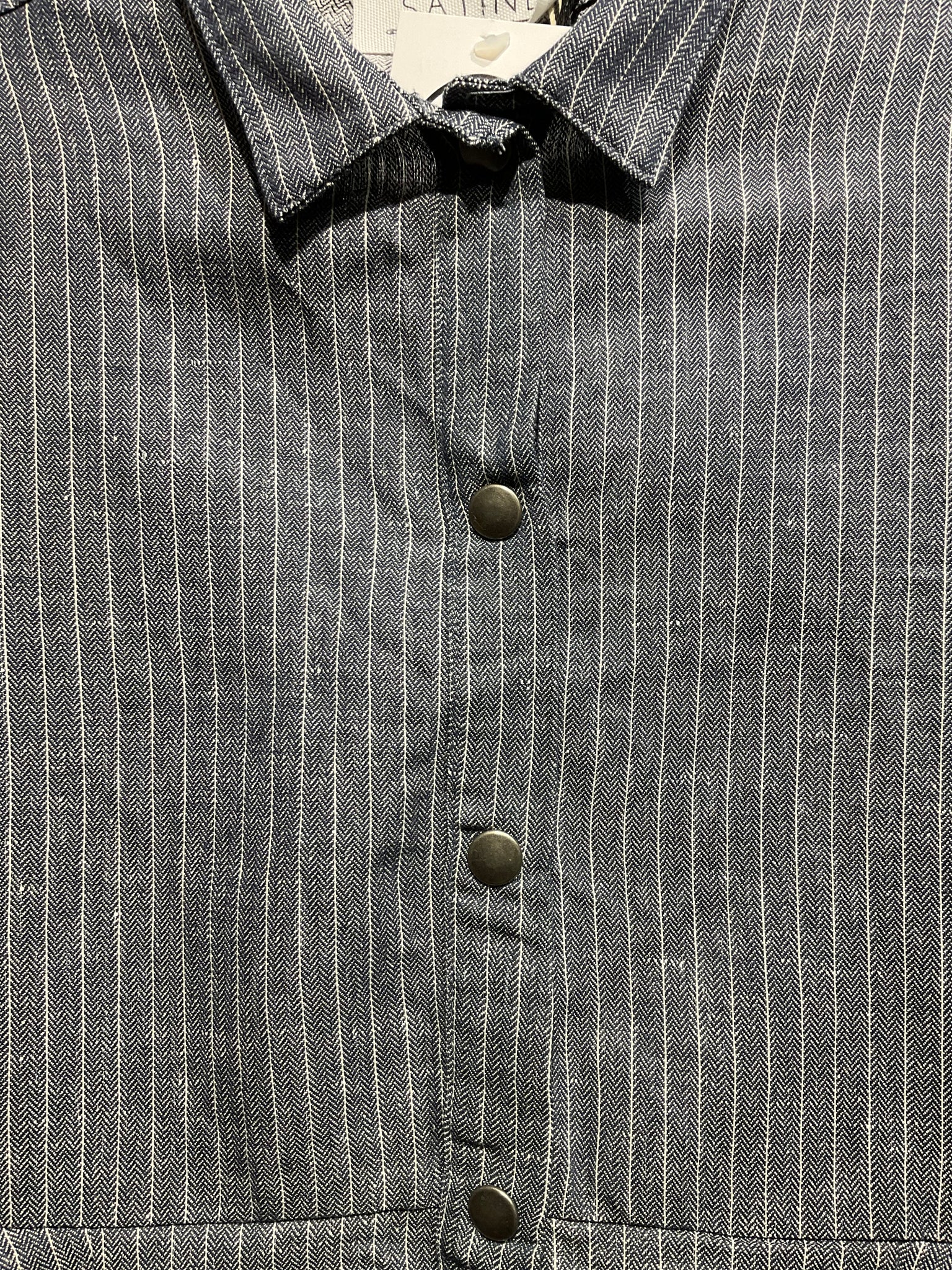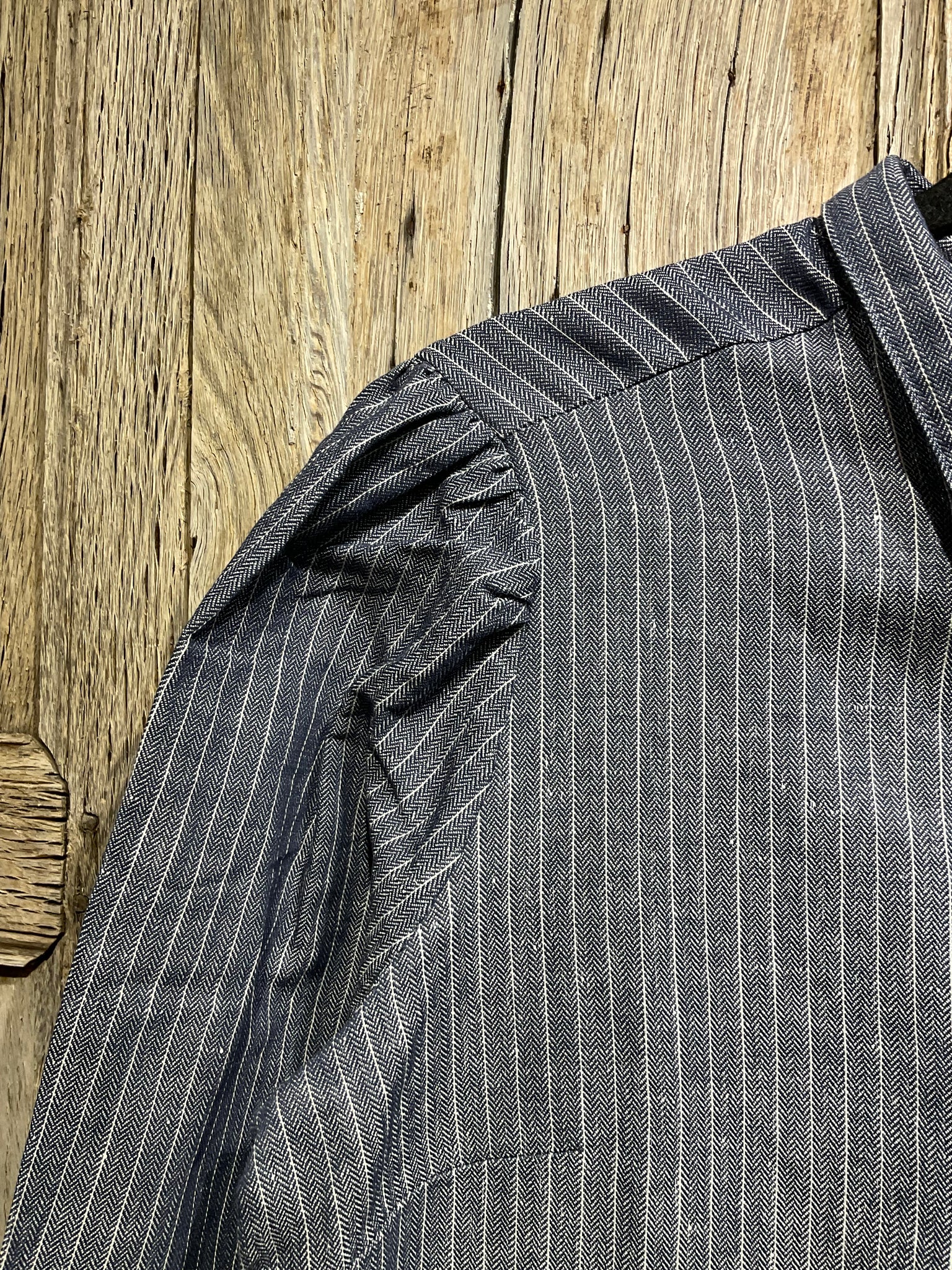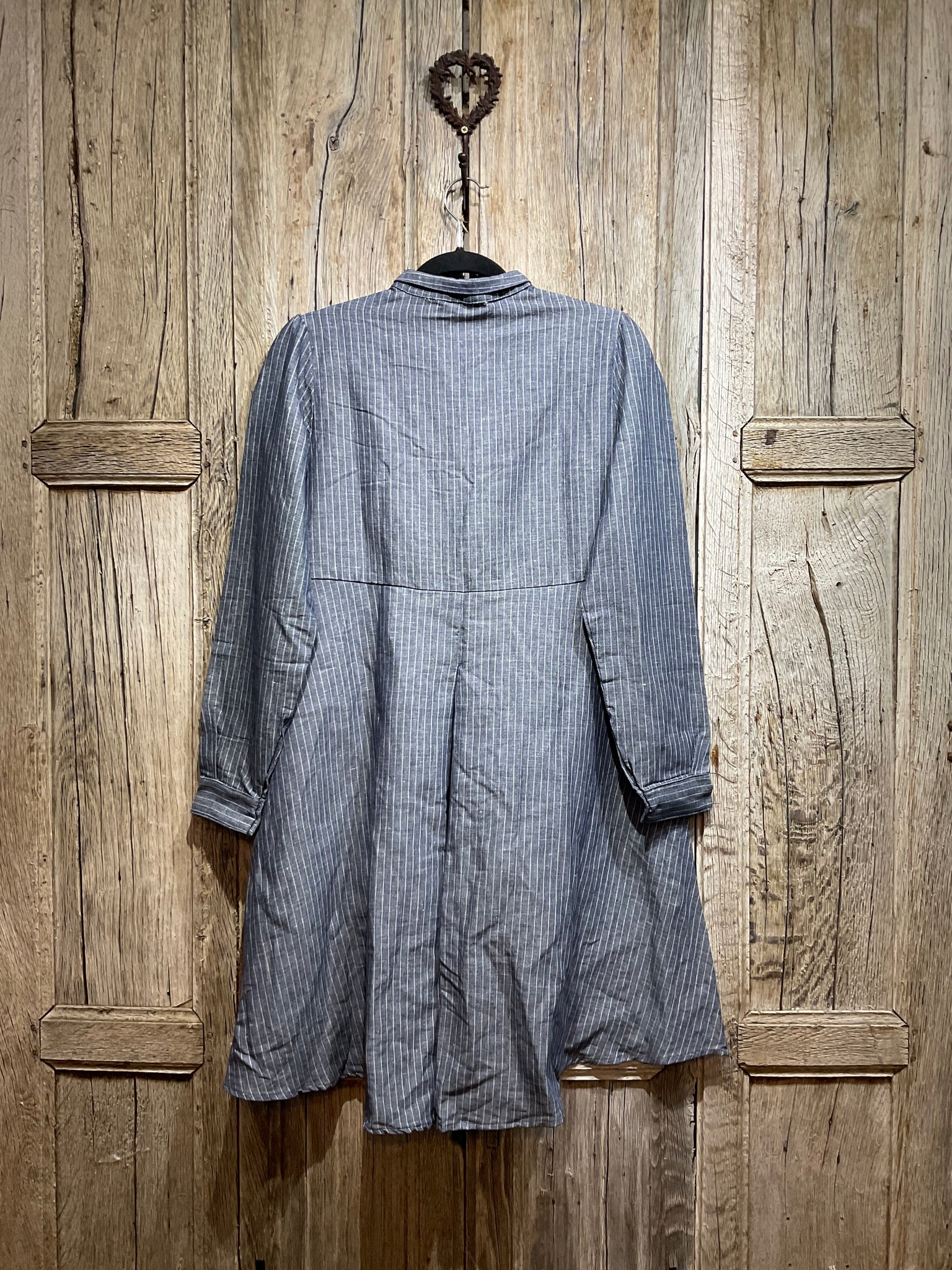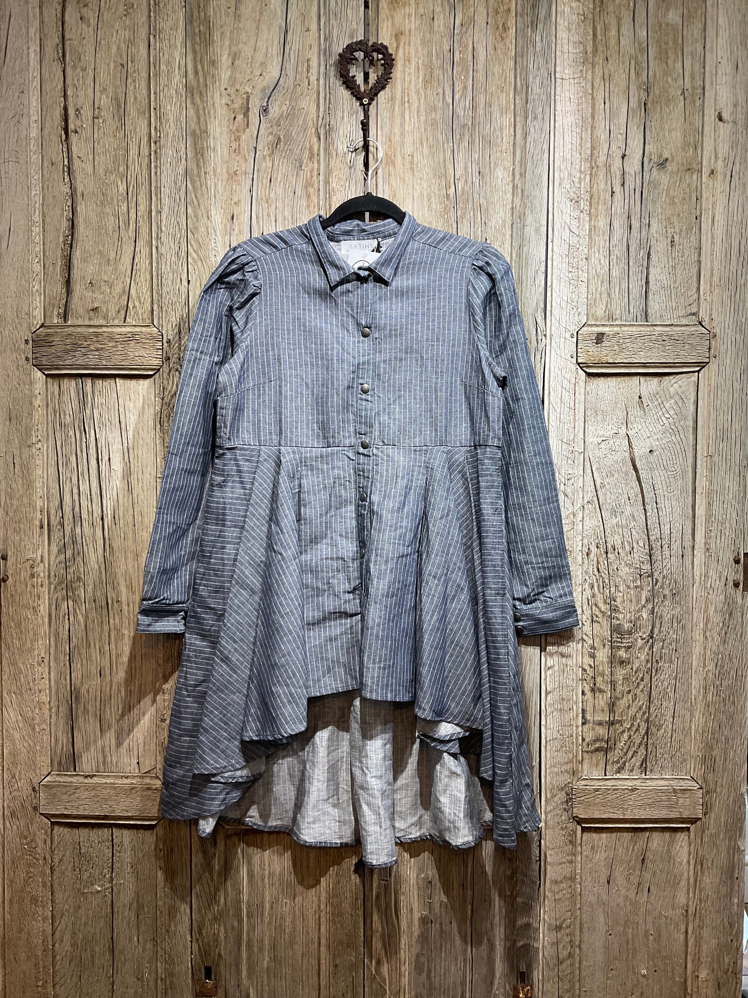 Gorgeous blue linen stripe top with slightly puffed sleeves with two buttons on the cuff, button down front with pleats at the front and longer at the back. Absolutely stunning!