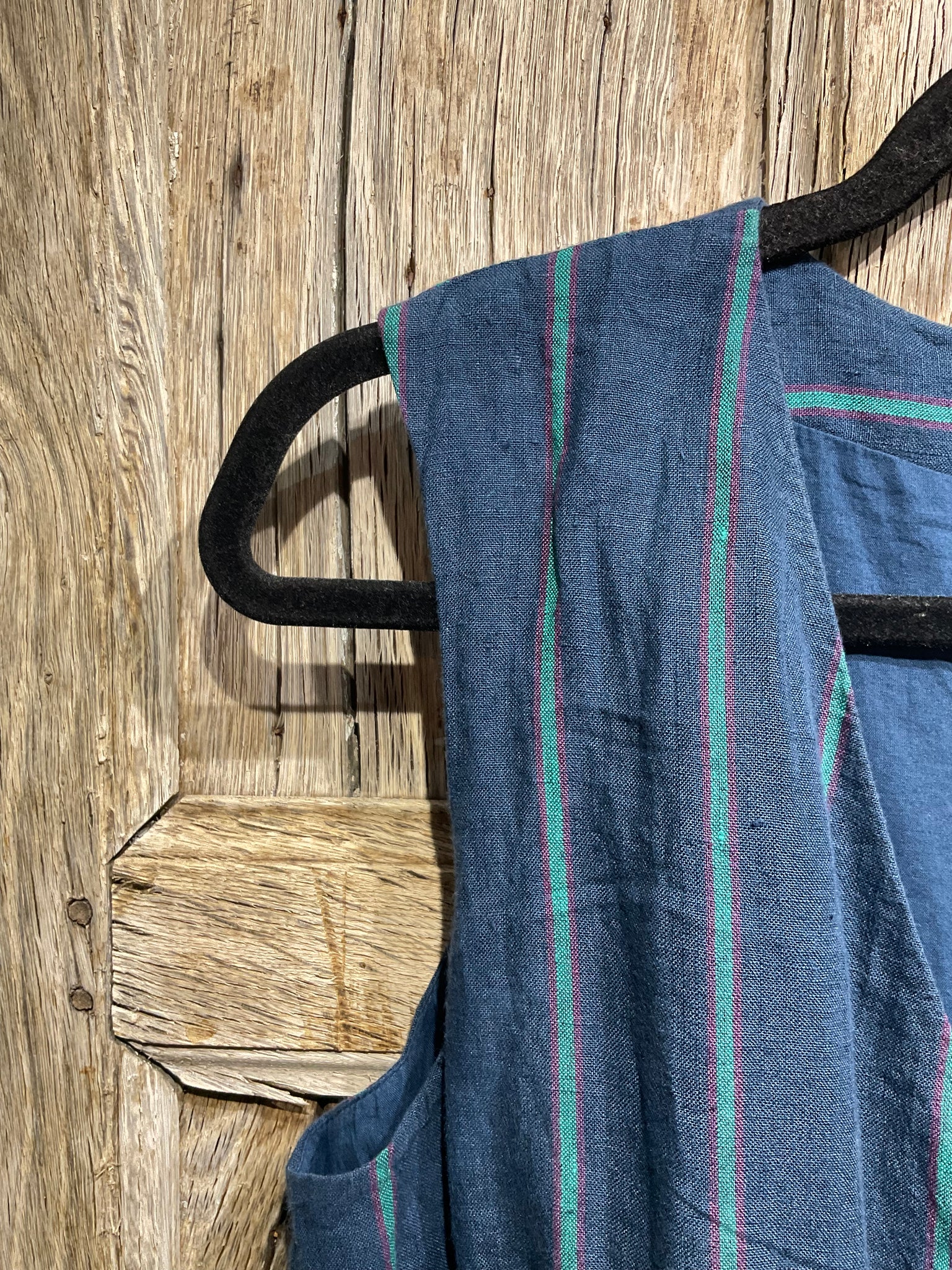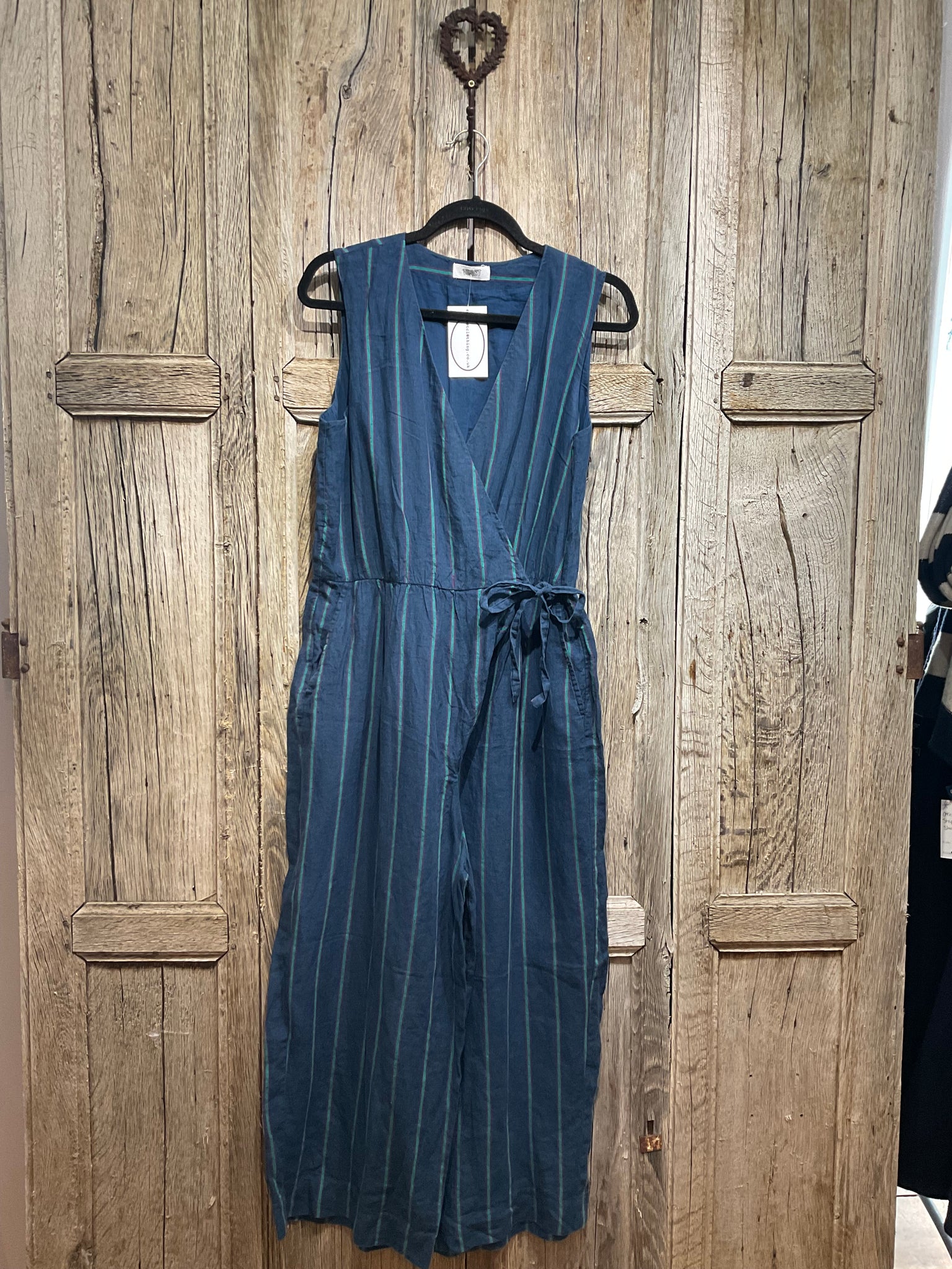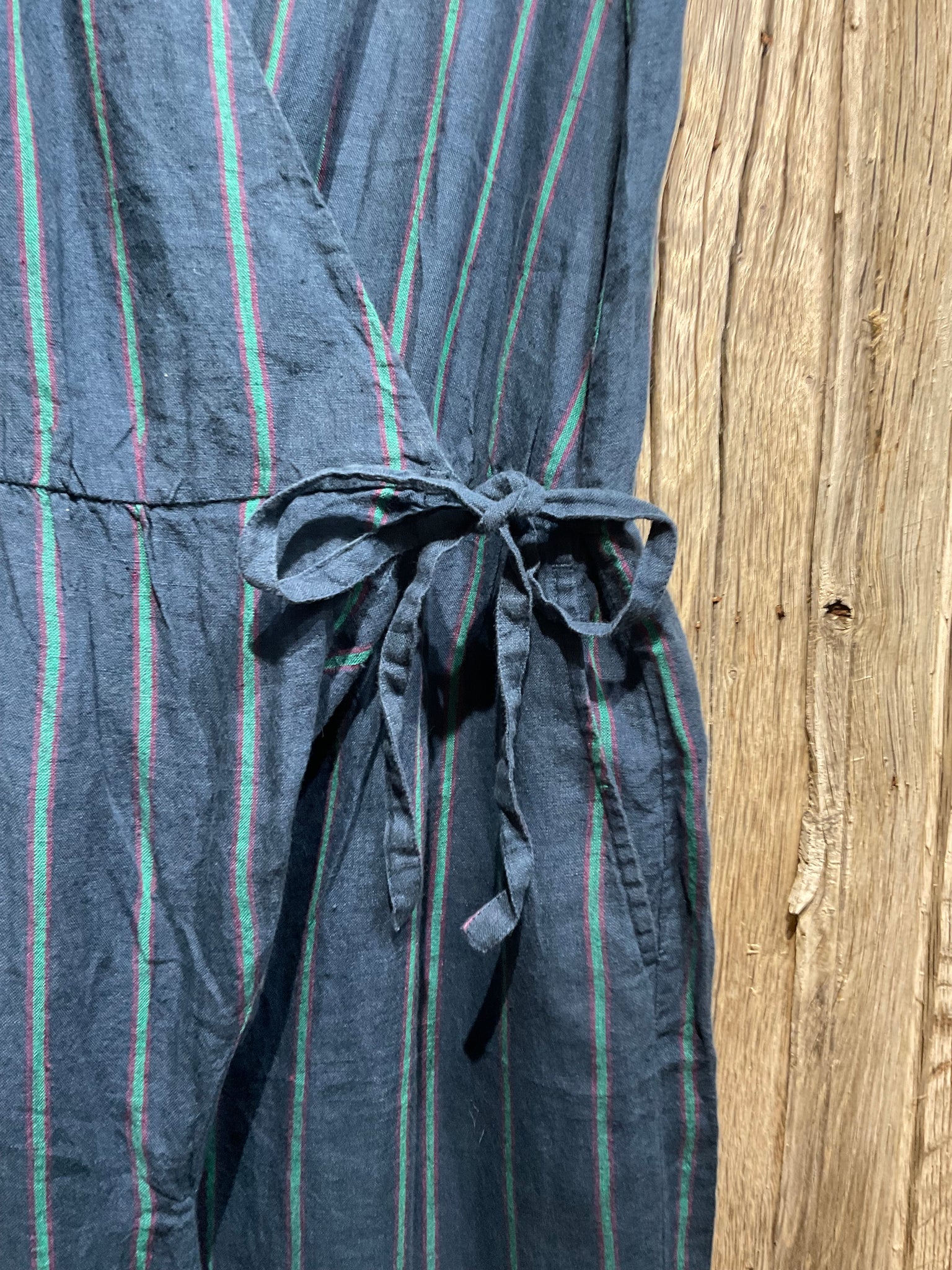 Perfect spring jumpsuit in a lovely blue with a green and red stripe, two front pockets and a tie and button fastening.