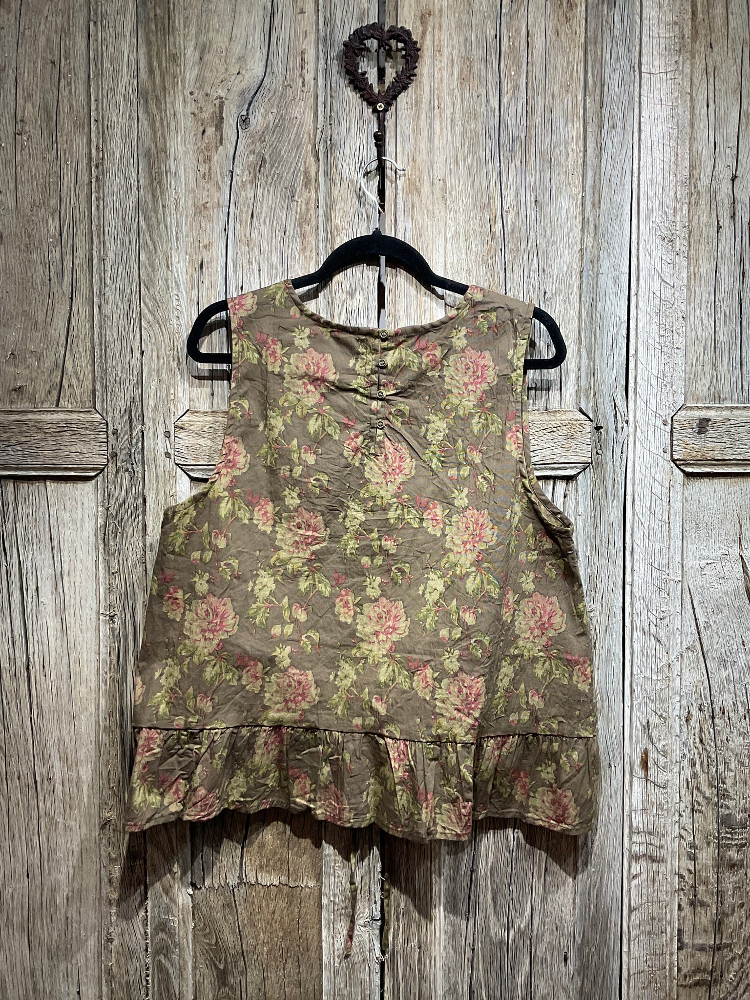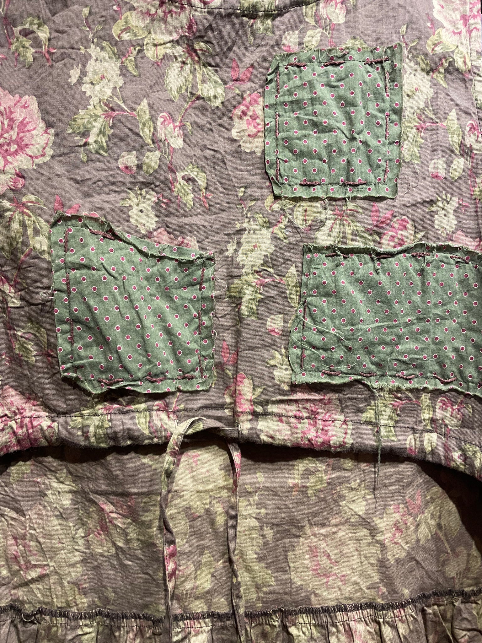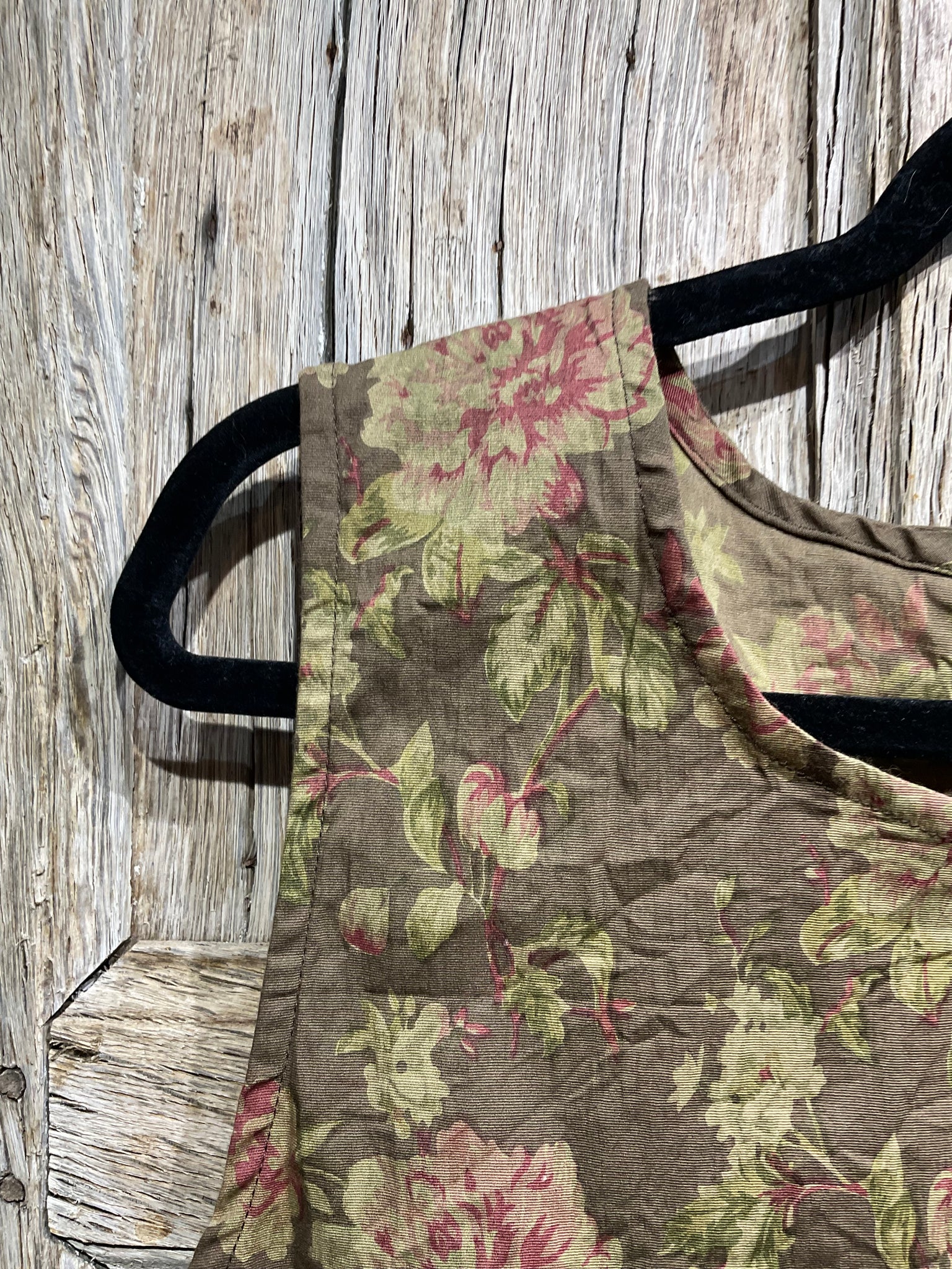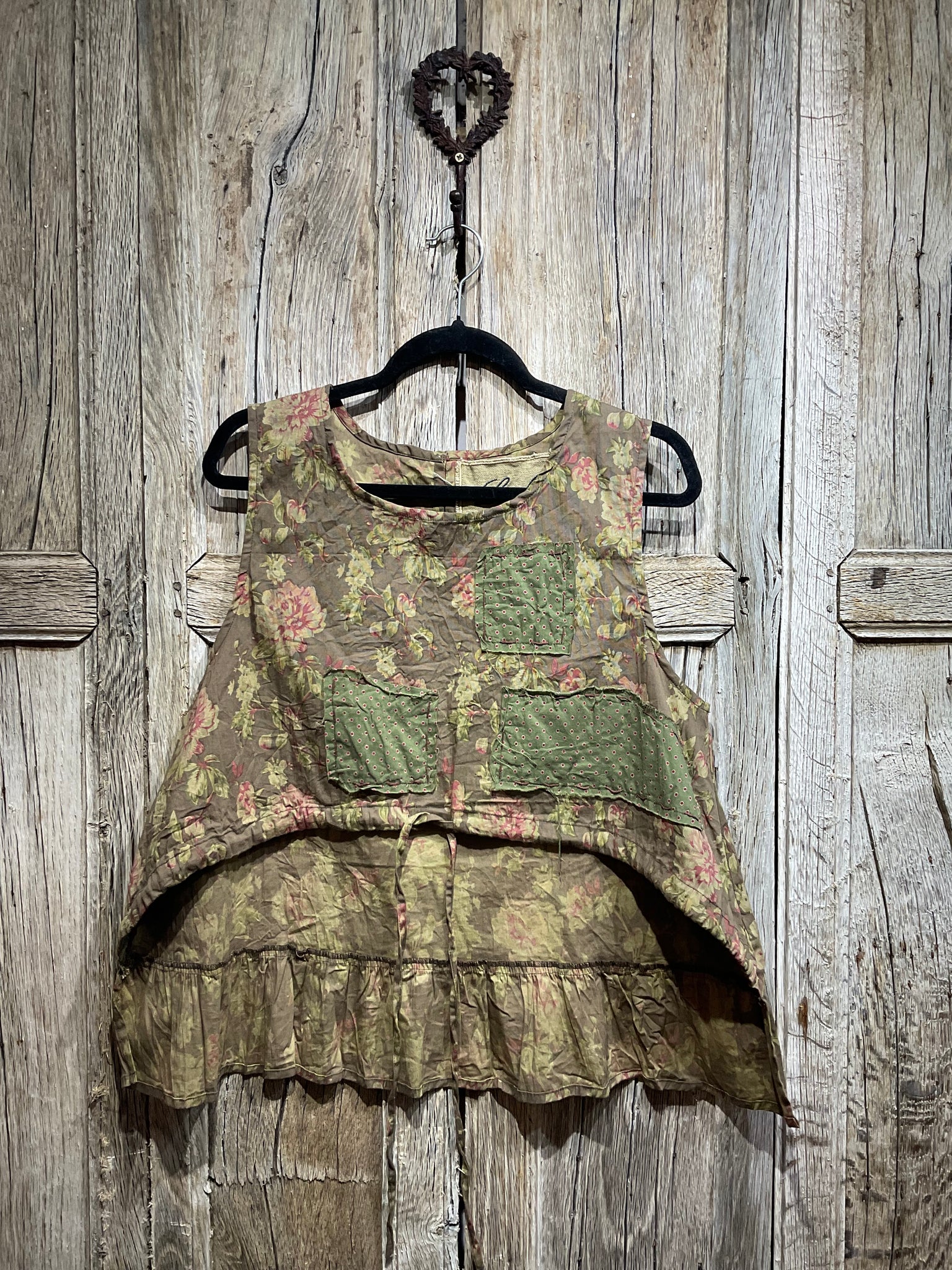 Lovely Les Ours layering vest in beautiful floral print with green polka dot patches, a tie at the front and three small buttons at the back